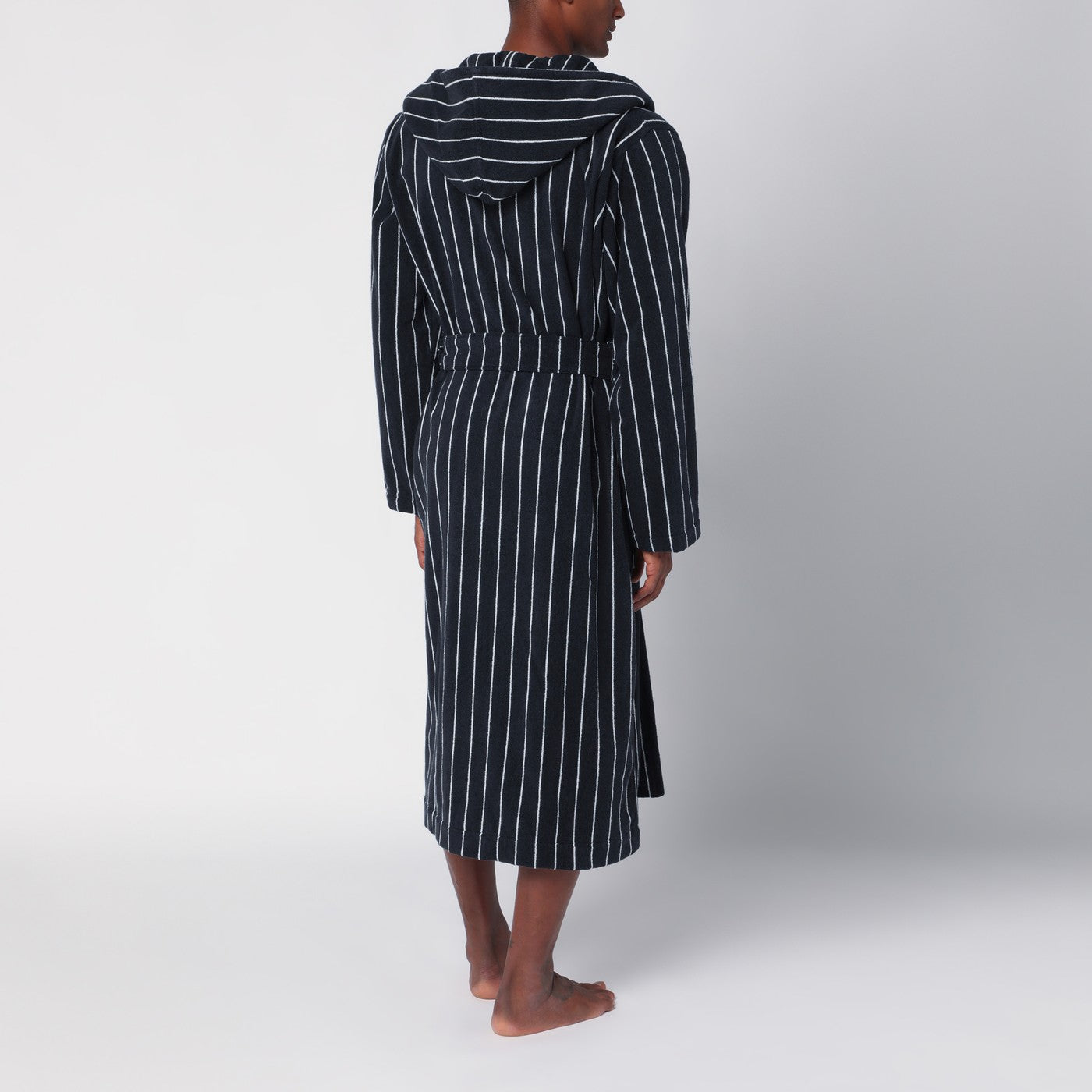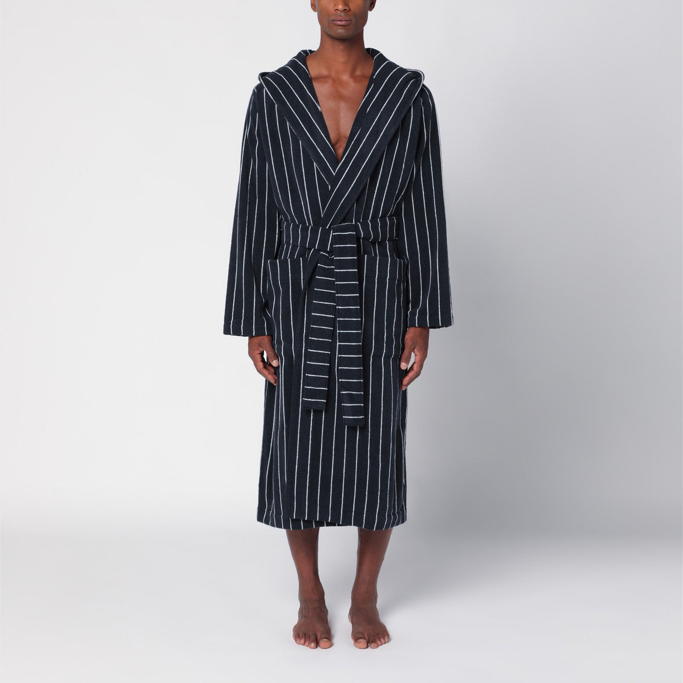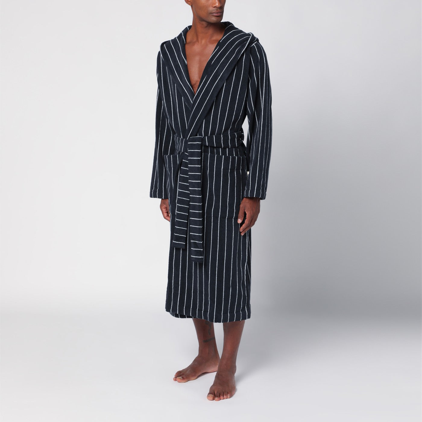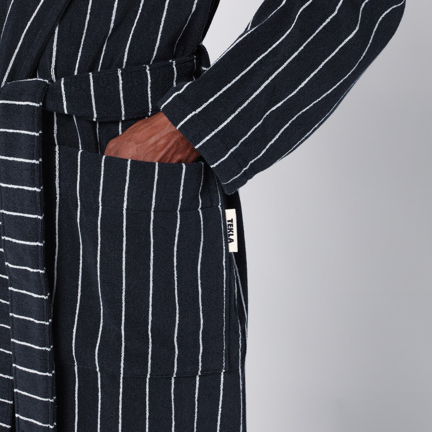 Augio di cotone nero in cotone con strisce bianche di Tekla, con un cappuccio, due tasche patch sul davanti con una targa logo di lettere, maniche lunghe e una cintura in vita.