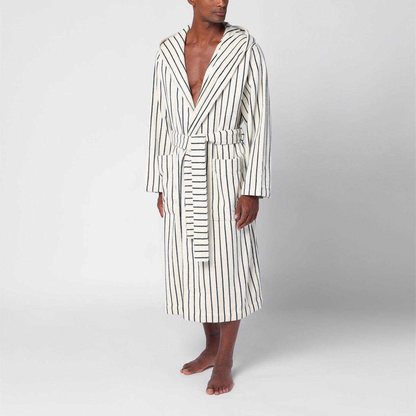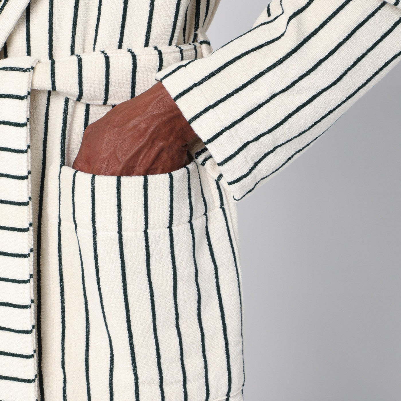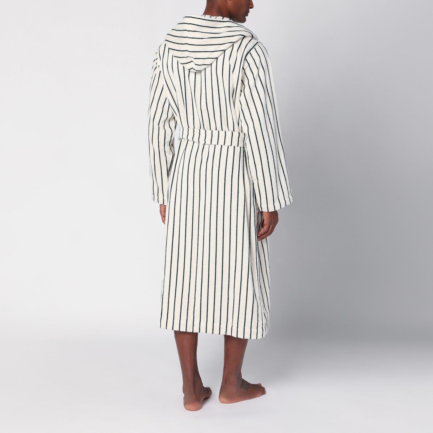 Augio in cotone bianco in cotone con strisce verde scuro di Tekla, con un cappuccio, due tasche patch sul davanti con una targa logo di lettere, maniche lunghe e una cintura in vita.