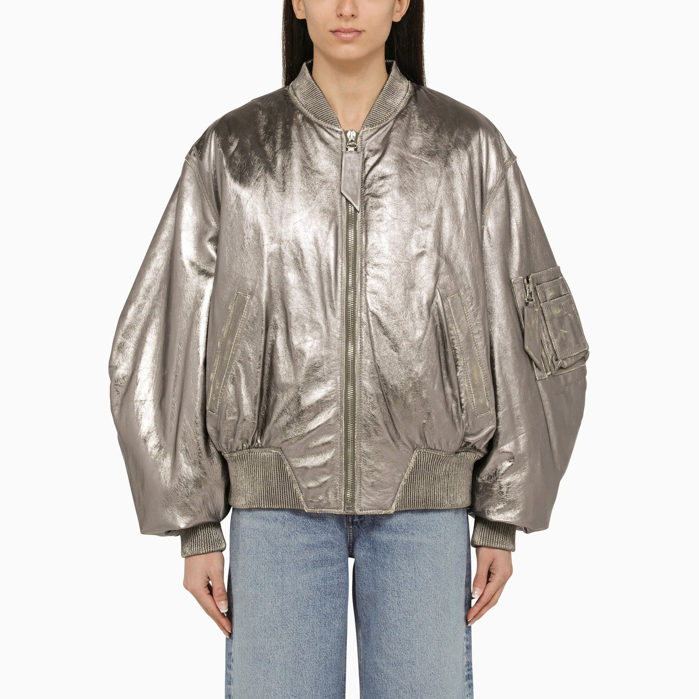 Silver leather bomber jacket from The Attico featuring a zip fastening, knitted hems, two front pockets and a loose fit.
