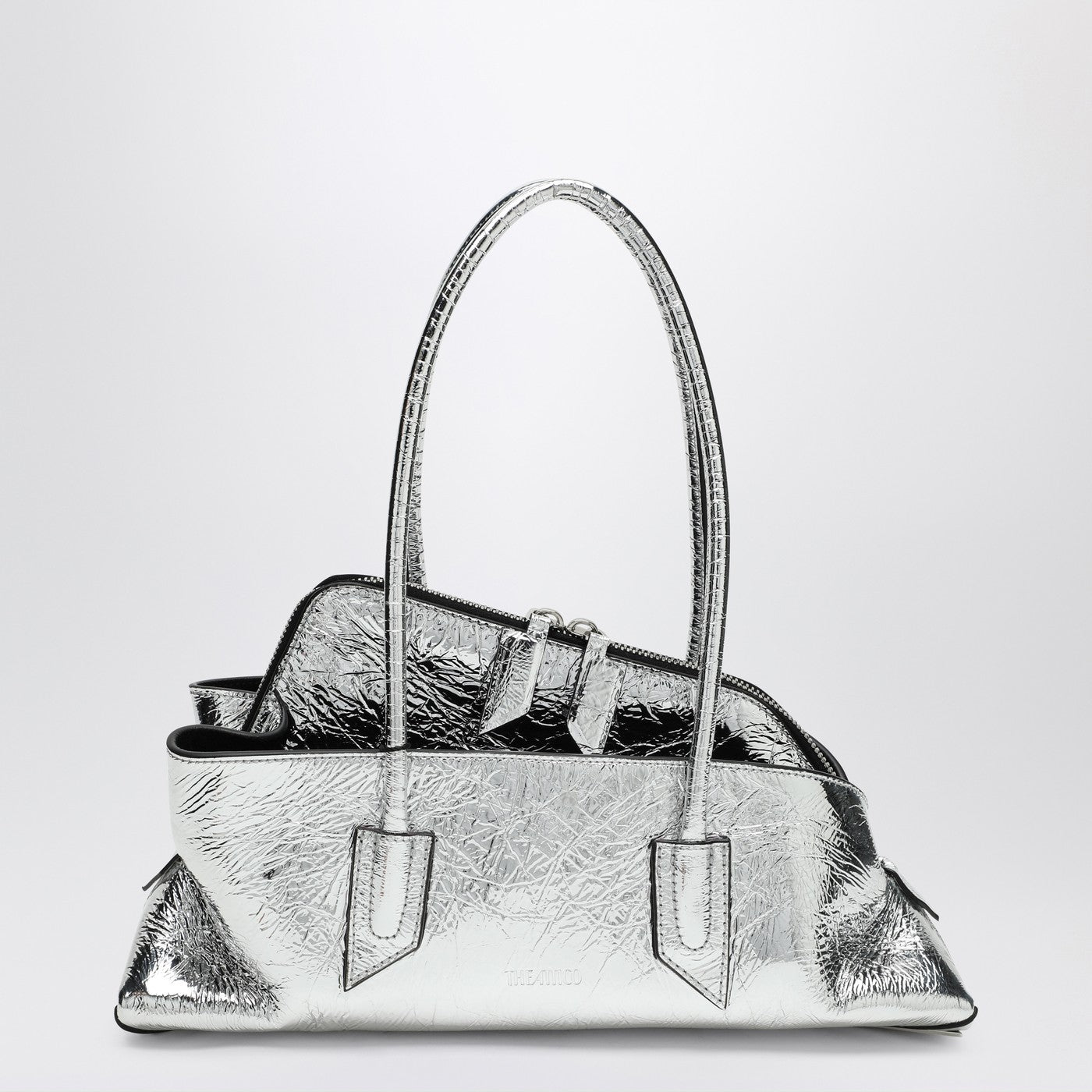 Medium sized khaki brushed suede bag from The Attico featuring two long tubular handles, two open compartments, one compartment with double zip closure, one interior flat pocket, asymmetric design, metal feet, embossed lettering logo on front and silver-tone metal hardware.