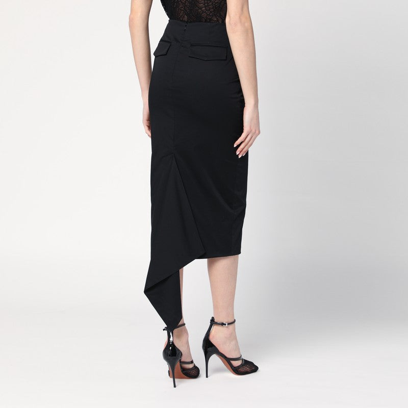 Gonna midi di cotone nera dell'ultima con una chiusura della zip posteriore, due tasche sul retro sul retro e una fessura con dettagli asimmetrici.