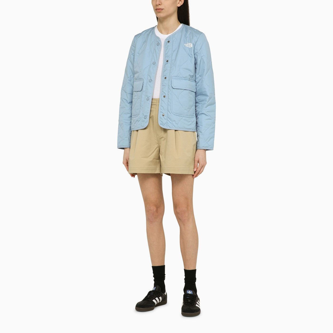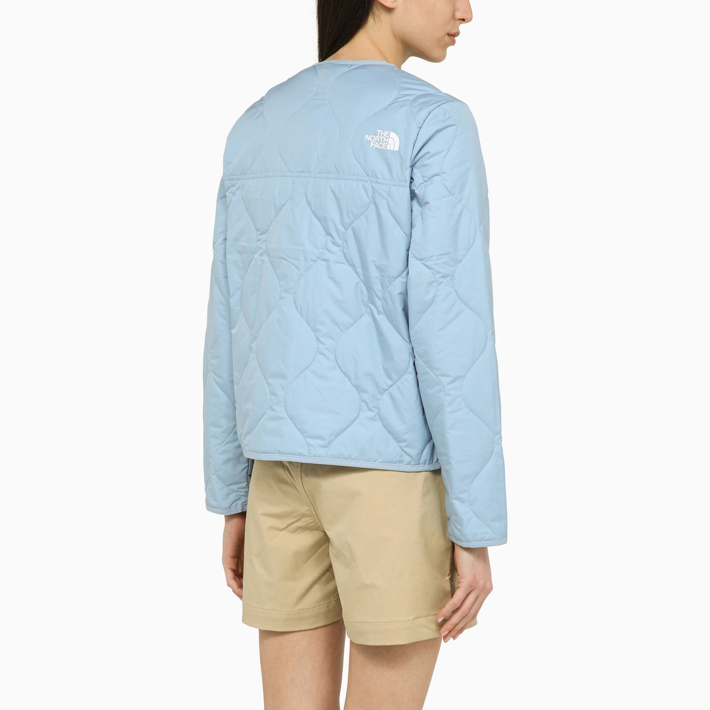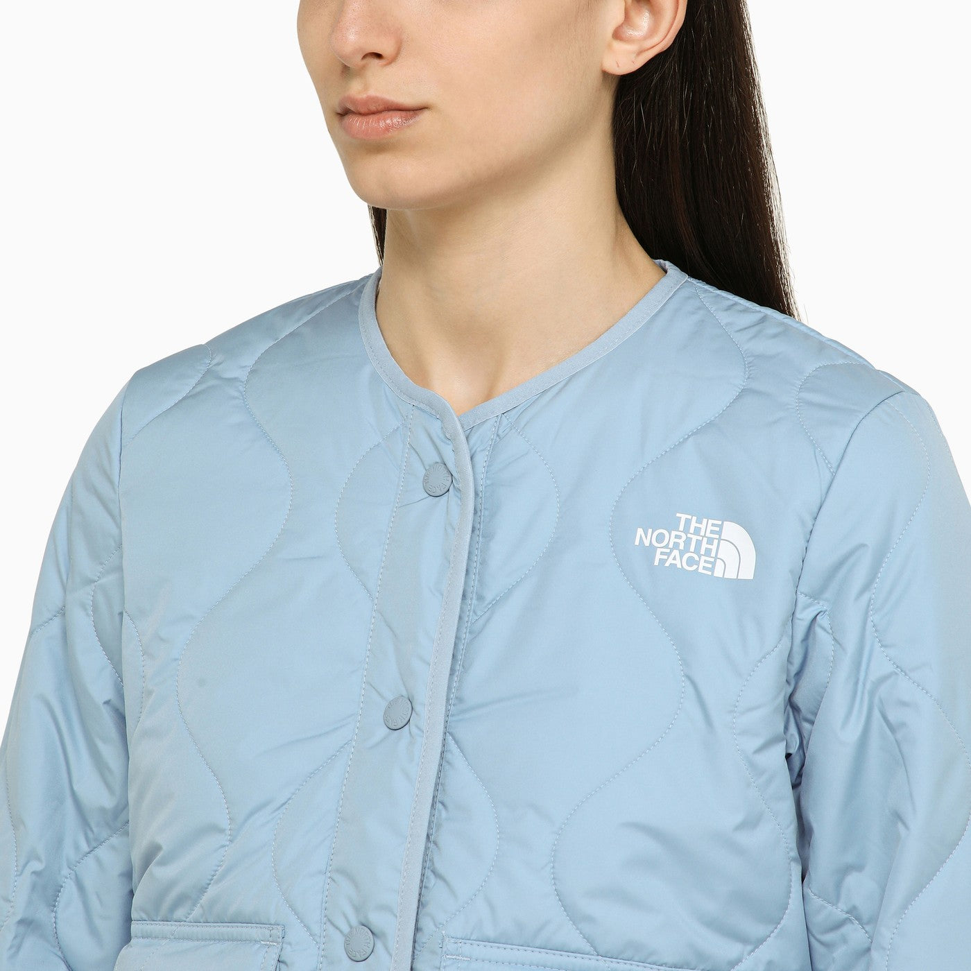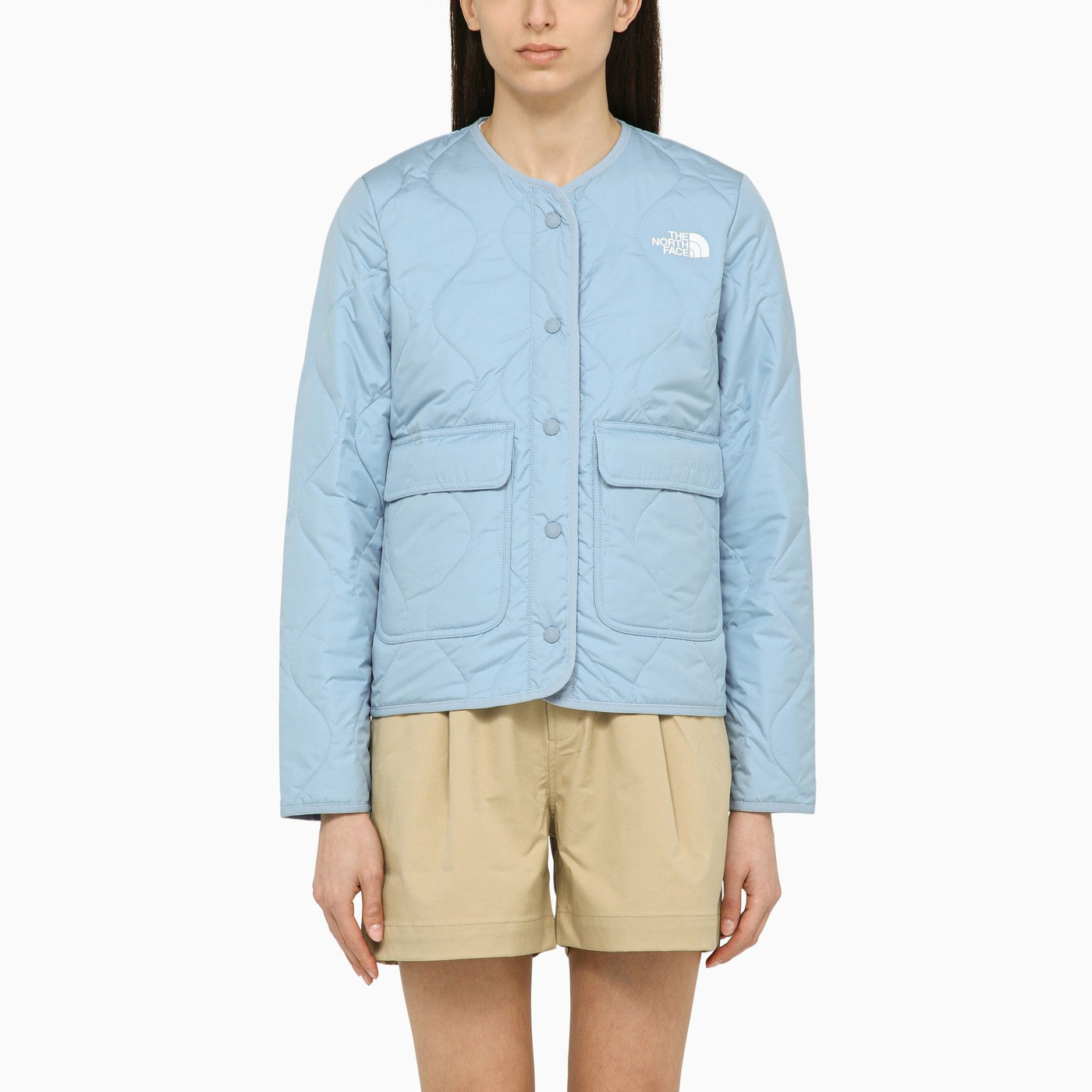 Giacca imbottita blu chiaro dalla faccia nord, con un fissaggio a scatto anteriore, maniche lunghe, due tasche per patch anteriori con alette e lettere anteriori e posteriori contrastanti.