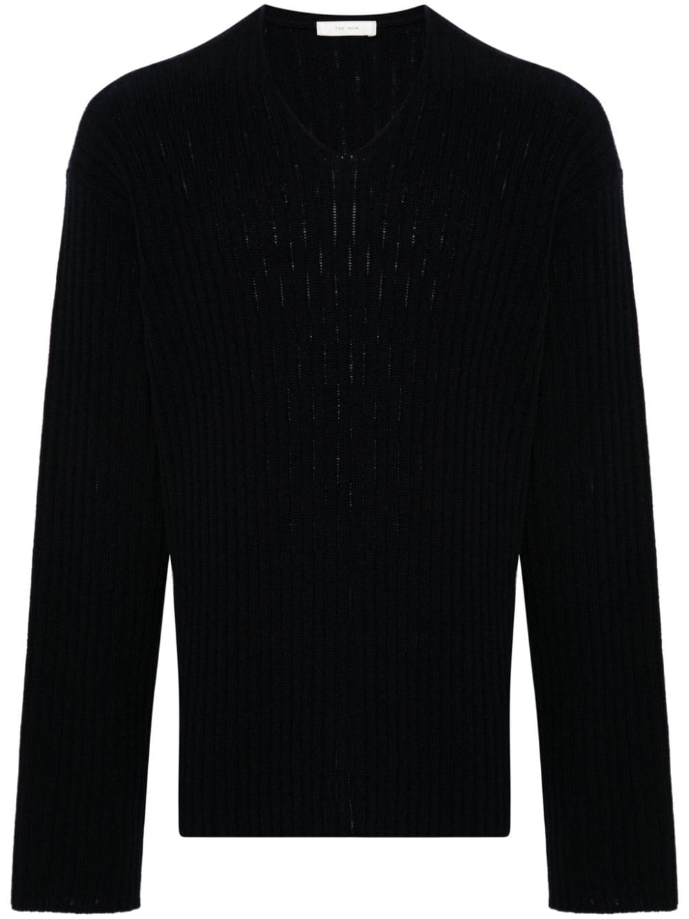 midnight blue cashmere chunky ribbed knit V-neck drop shoulder long sleeves unlined straight hem