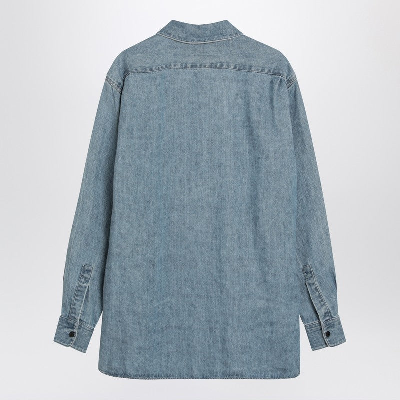 Camicia in denim in lino azzurro per la riga, con una chiusura a bottone anteriore, maniche lunghe con polsini abbottonati, un colletto classico e una tasca di patch sul petto.