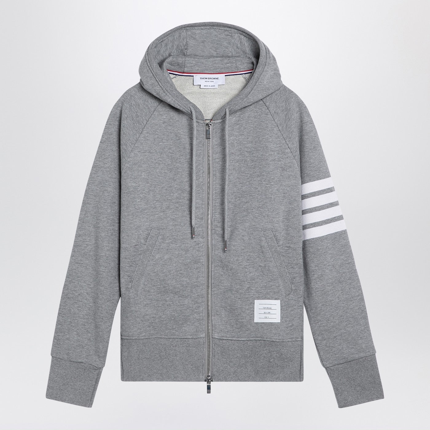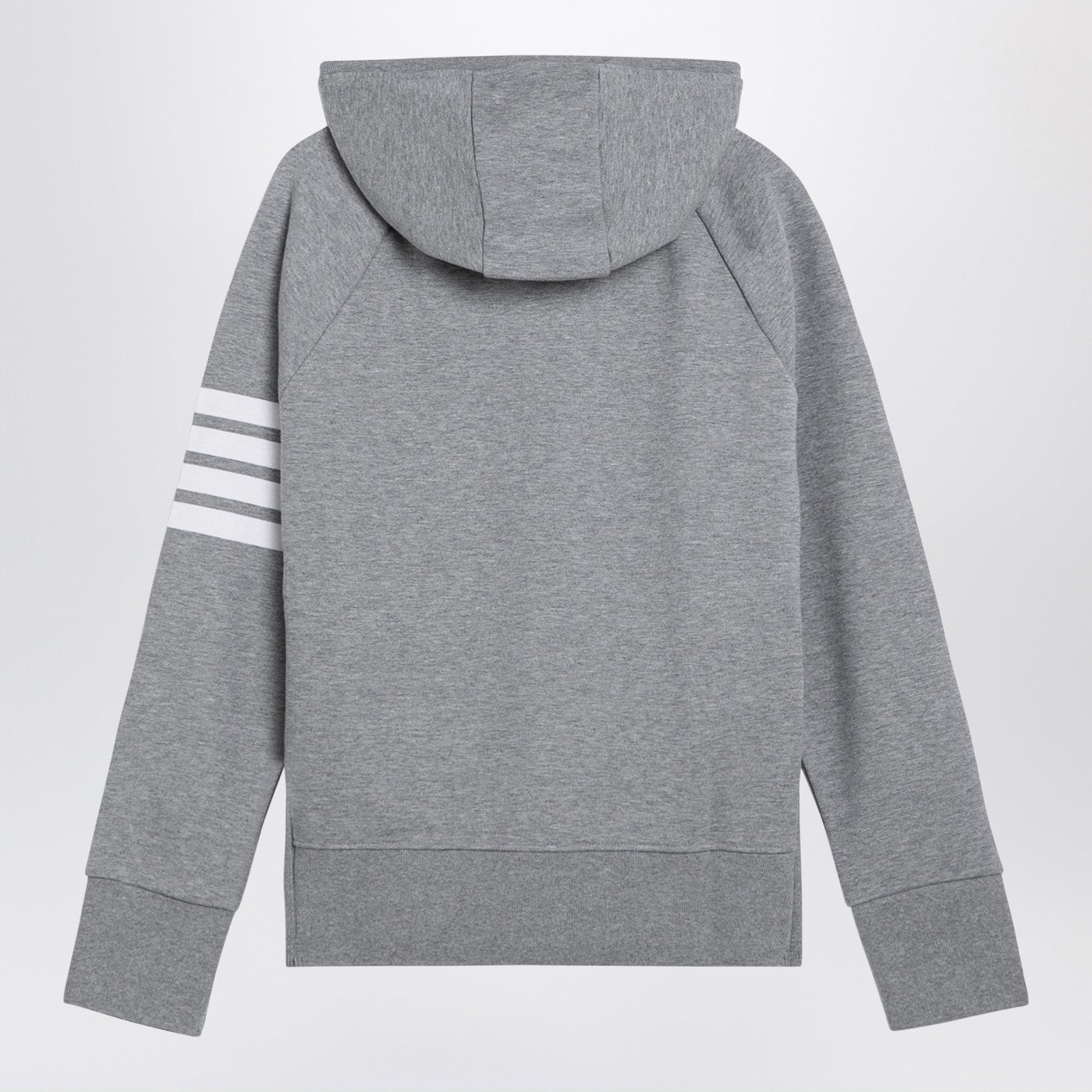 Felpa di cotone grigio chiaro di Thom Browne con maniche lunghe con dettagli a strisce bianche contrastanti, patch logo cuciti sulla parte anteriore, dettagli di tricolore sul retro, cofano, cofano, una tasca di canguro sulla parte anteriore e gli orli delle costole.
