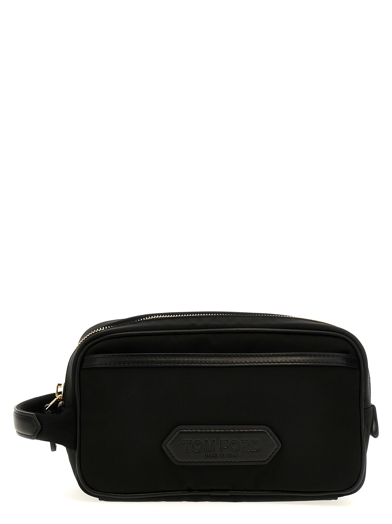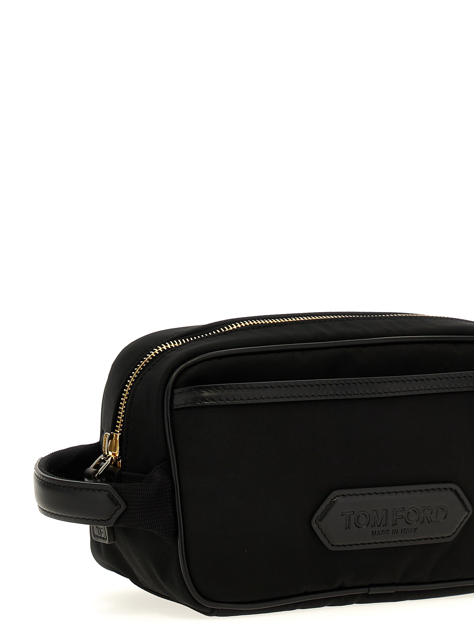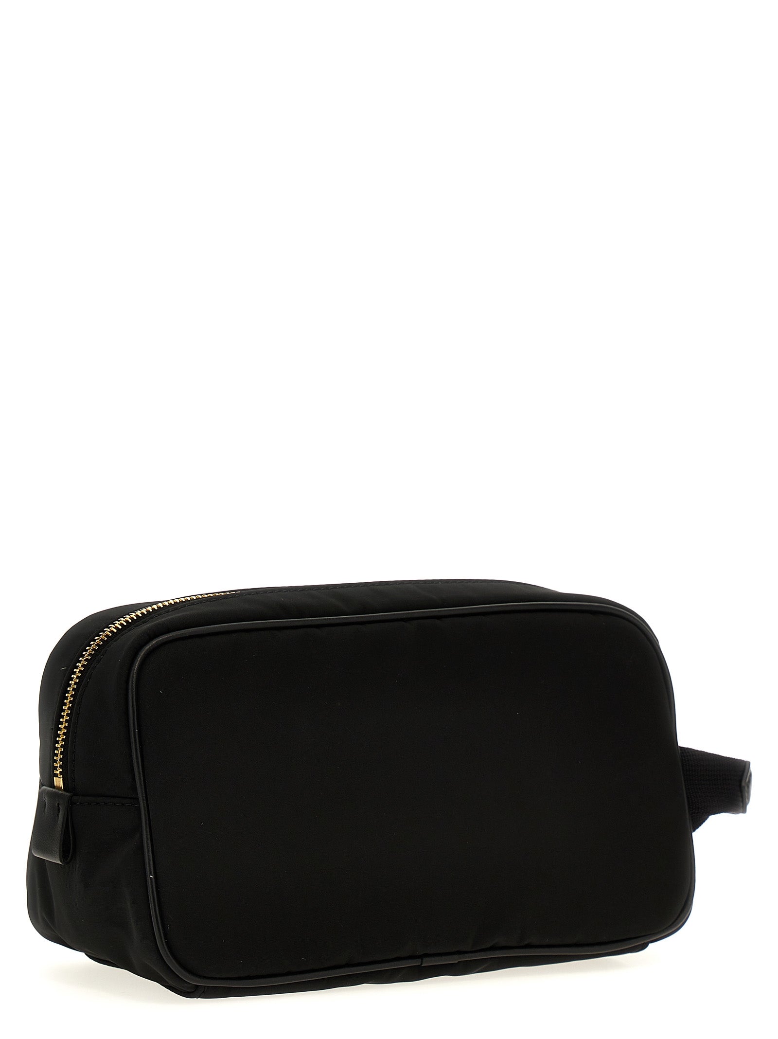 Nylon Beauty con dettagli in pelle, applicazione logo, chiusura a zip.