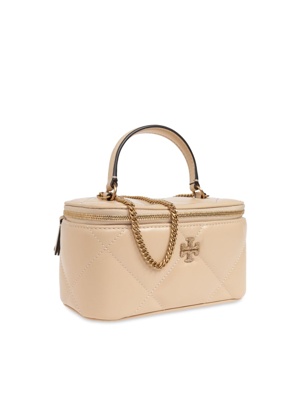 Sand colour, calfskin, quilted design, round zip closure, top handle, chain shoulder strap, gold-coloured logo plaque and single compartment.