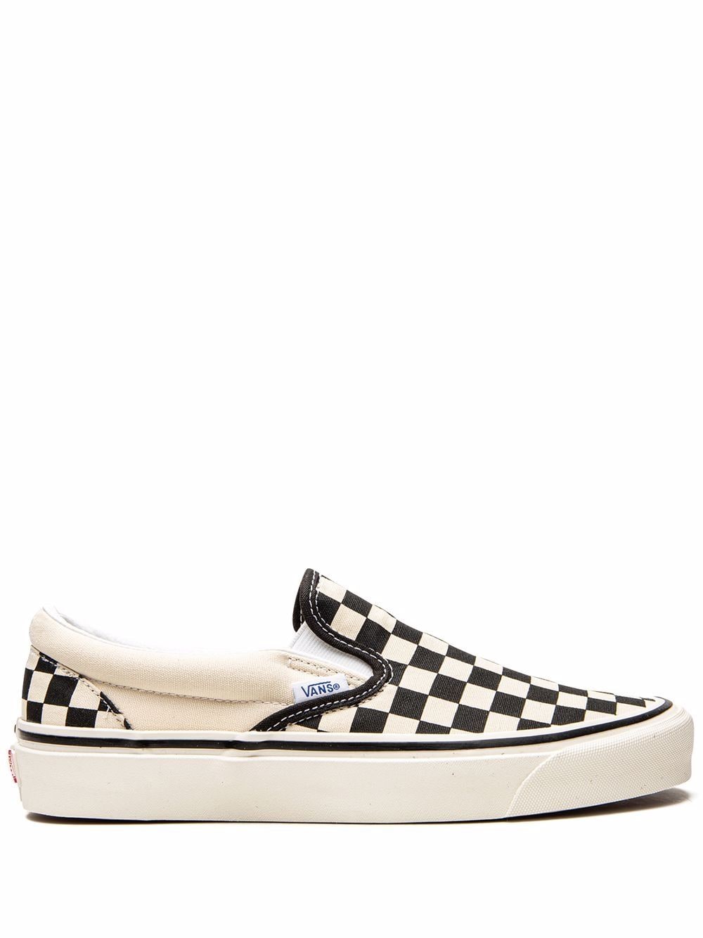 98 dx sneaker slip-on a scacchiera da furgoni con la stampa nera, bianca, a scacchiera, stile slip-on, punta rotonda, pannelli laterali elasticizzati, soletta marcata e suola in gomma grosso.