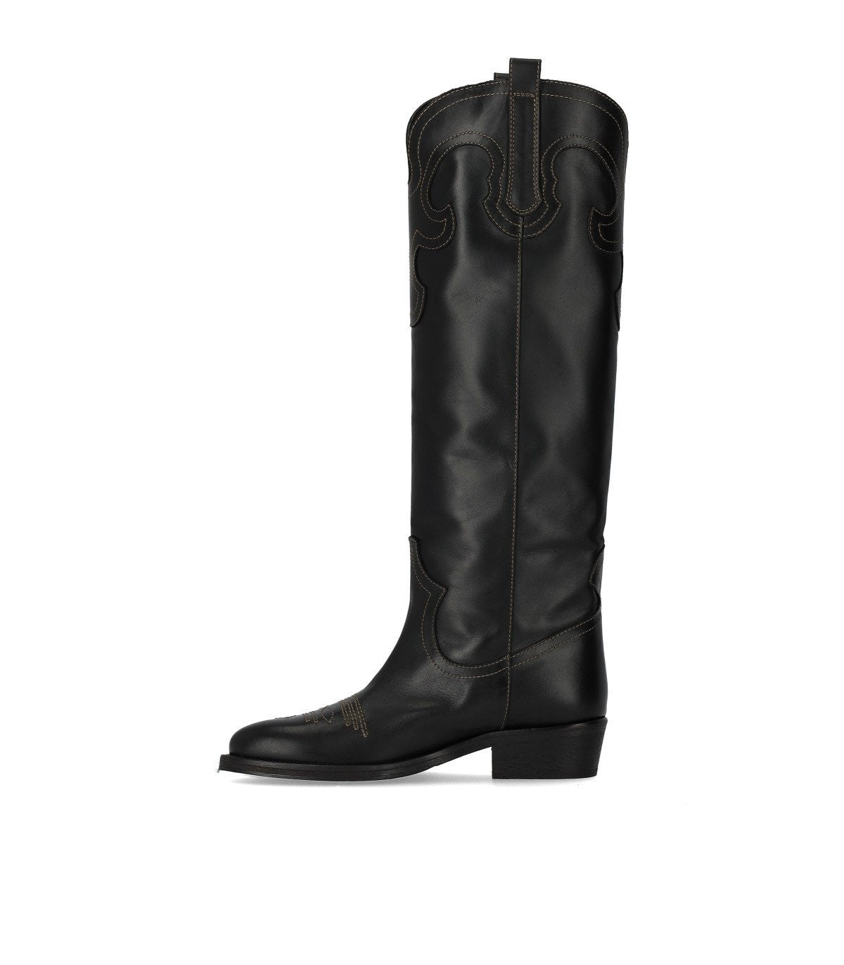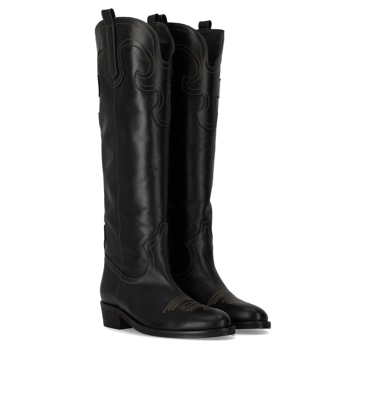 Avvio di Venezia di Via Roma 15, realizzato in pelle nera morbida con cuciture a contrasto. Rivestimento in pelle e soletta, suola in pelle. Altezza del tallone 4 cm. Altezza della gamba 24 cm nella parte anteriore, 30 cm sui lati.