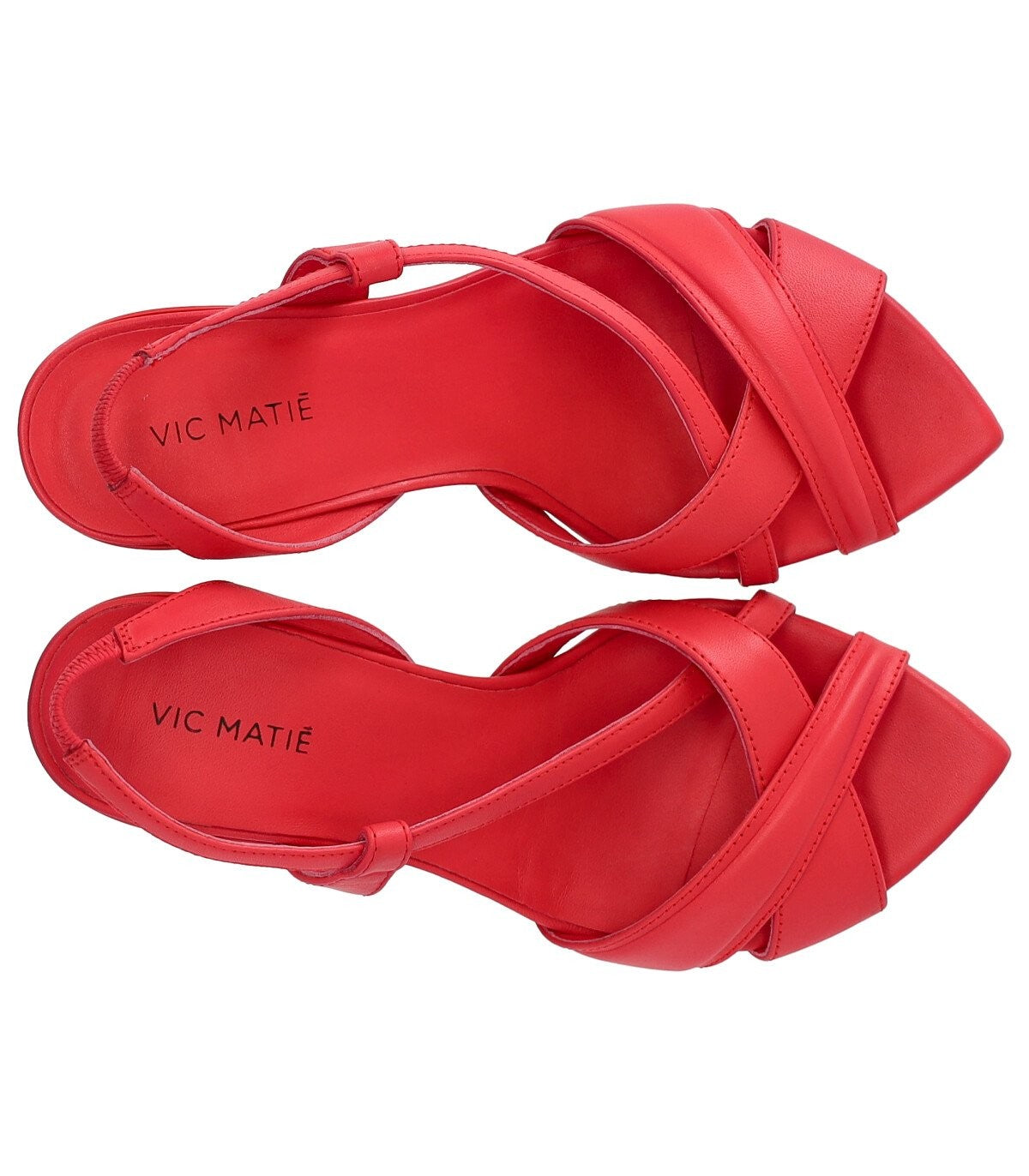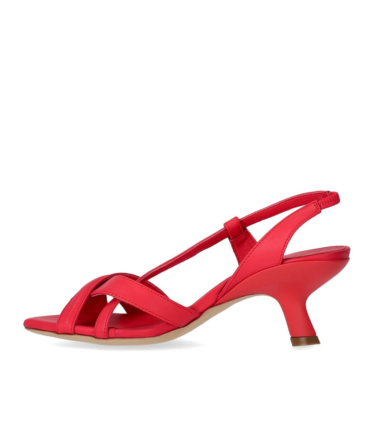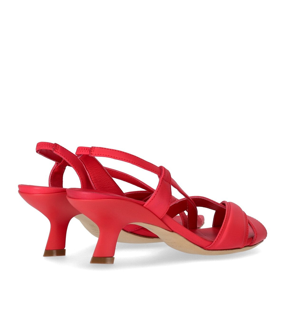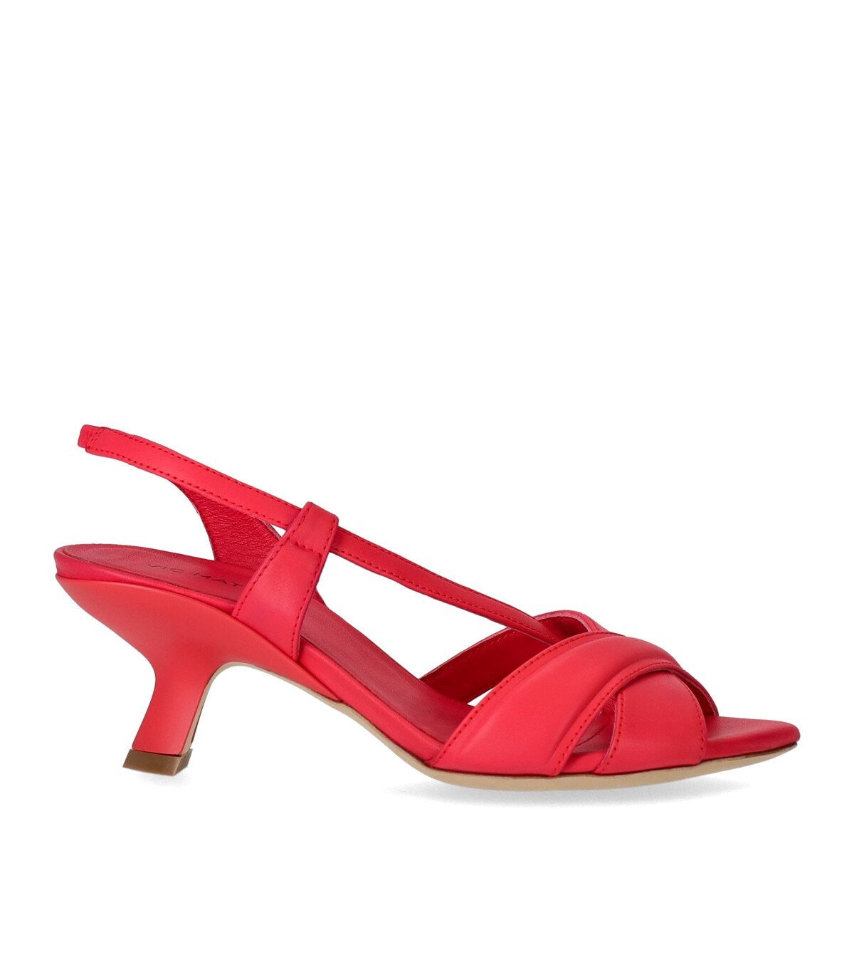 Eclair sandalo di Vic Matié realizzato in pelle rossa alla fragola con cinturini incrociati sulla parte anteriore e punta affusolata. Cinta di caviglia elastica, sola in pelle e suola in pelle con tallone di bobina. Altezza 7 cm.