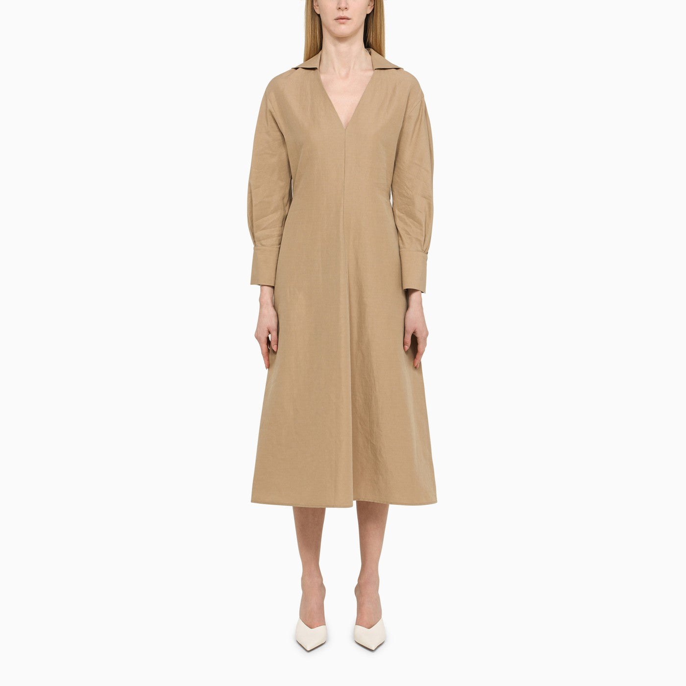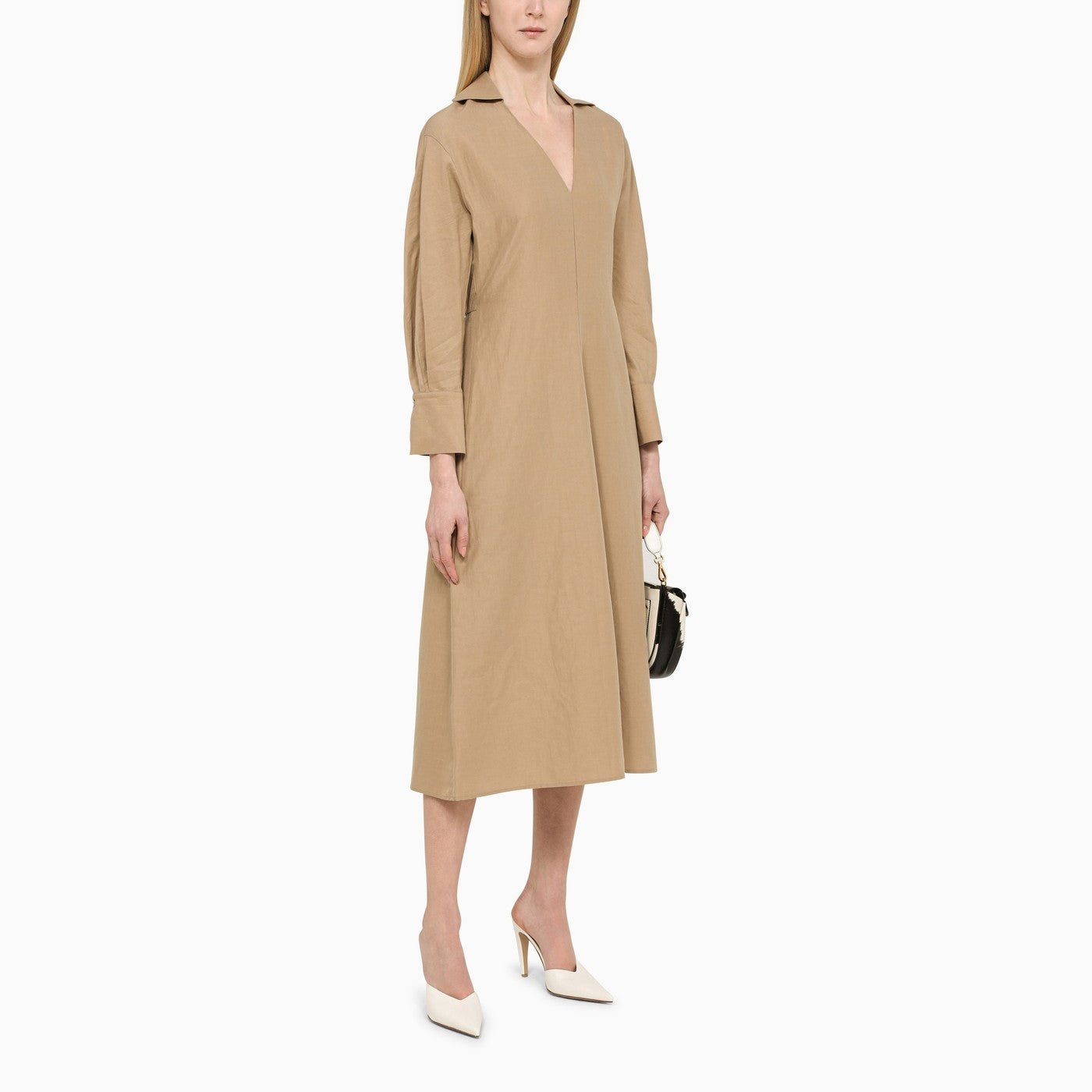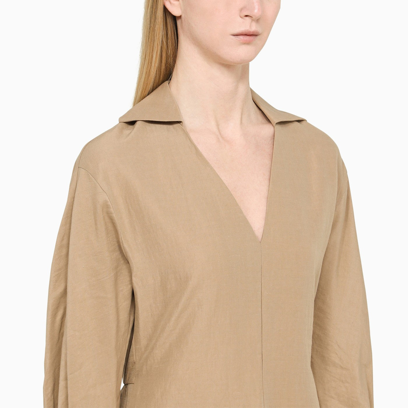 Beige Cotton Blend Chemisier di Vince con maniche lunghe, una cintura elastica sul retro, un grande colletto, un scollo a V e polsini in stile camicia.