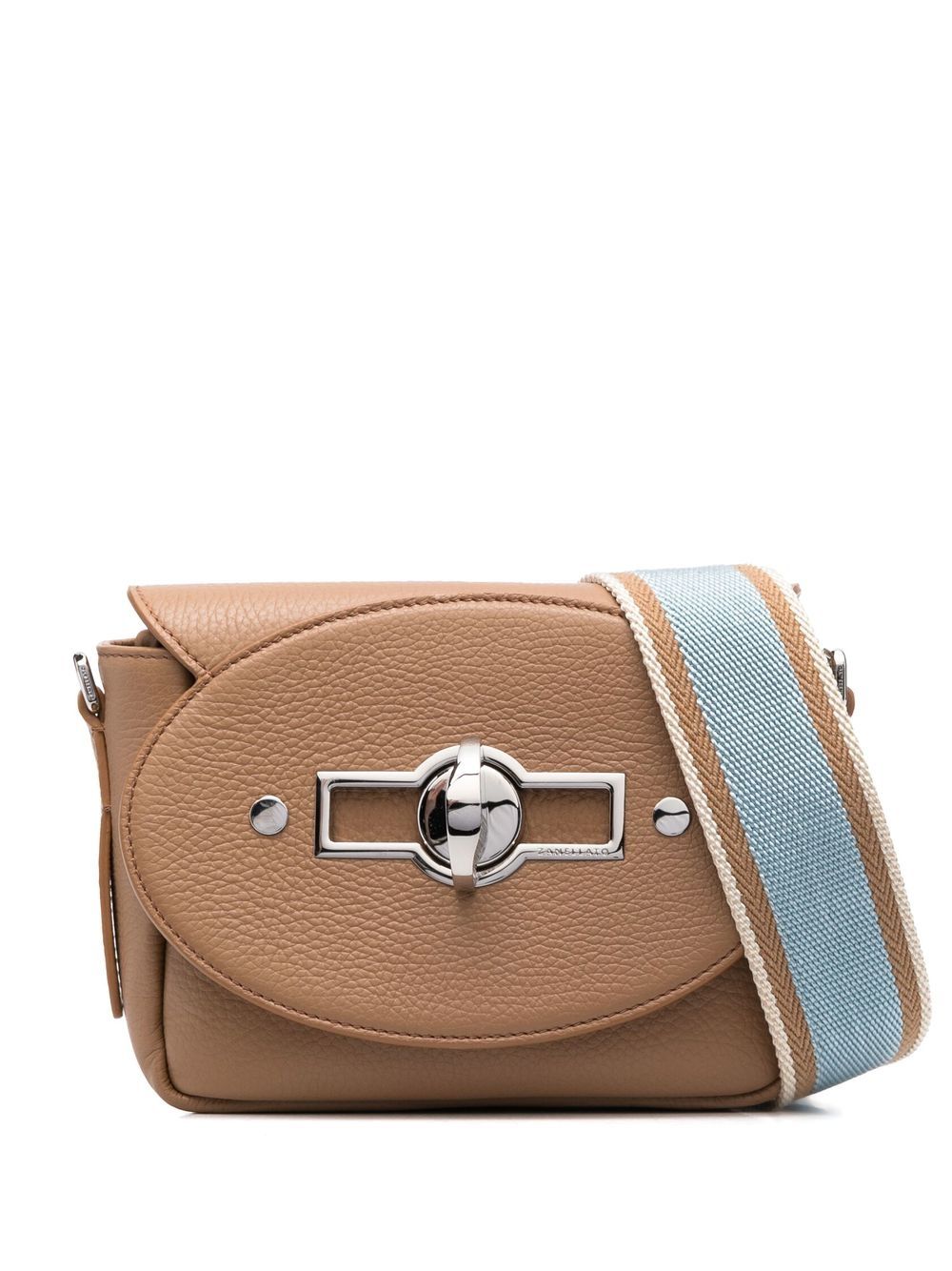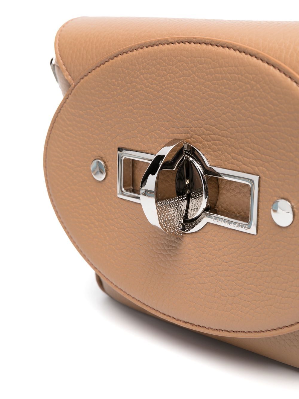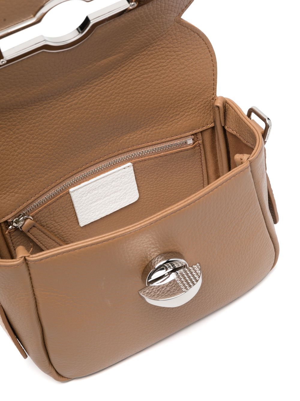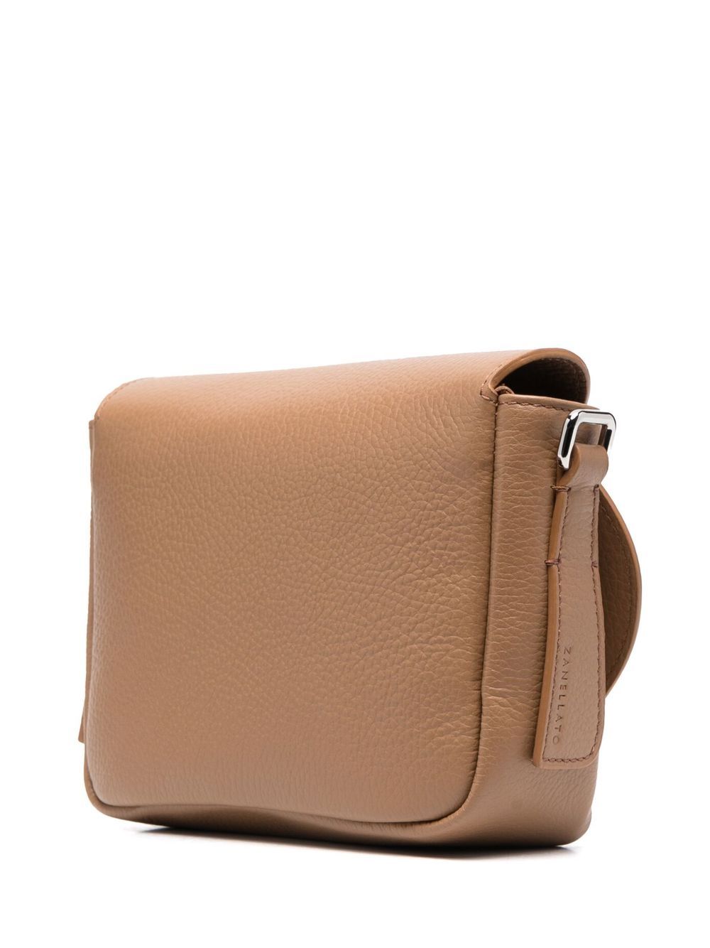 Borsa di cartella in pelle Tina di Zanellato con caffè marrone, cuoio a vitello, consistenza a grana, hardware tono in argento, chiusura a bocchetta, top-top, cinghia staccabile, scomparto principale, tasca interna a fusting zip e patch di logo interno.