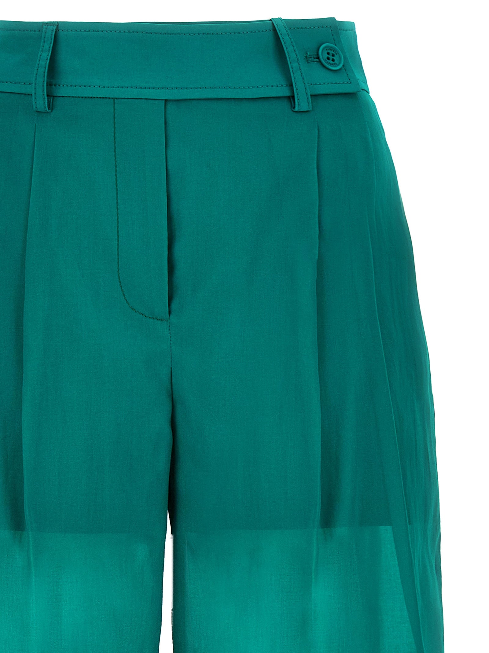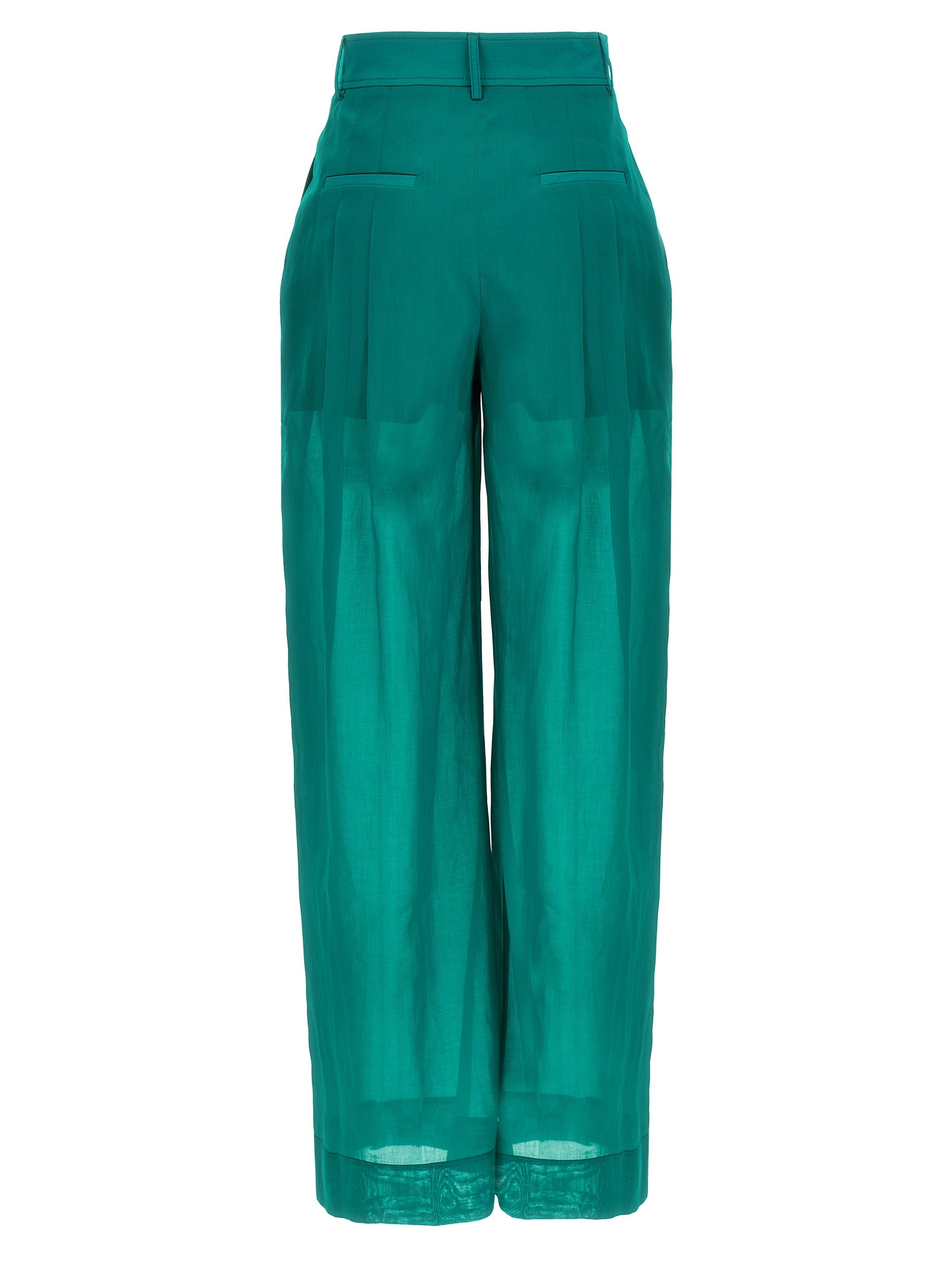 High-waisted pants in semi-transparent organza cotton muslin, pleats, front zip and button closure, wide leg, pockets.