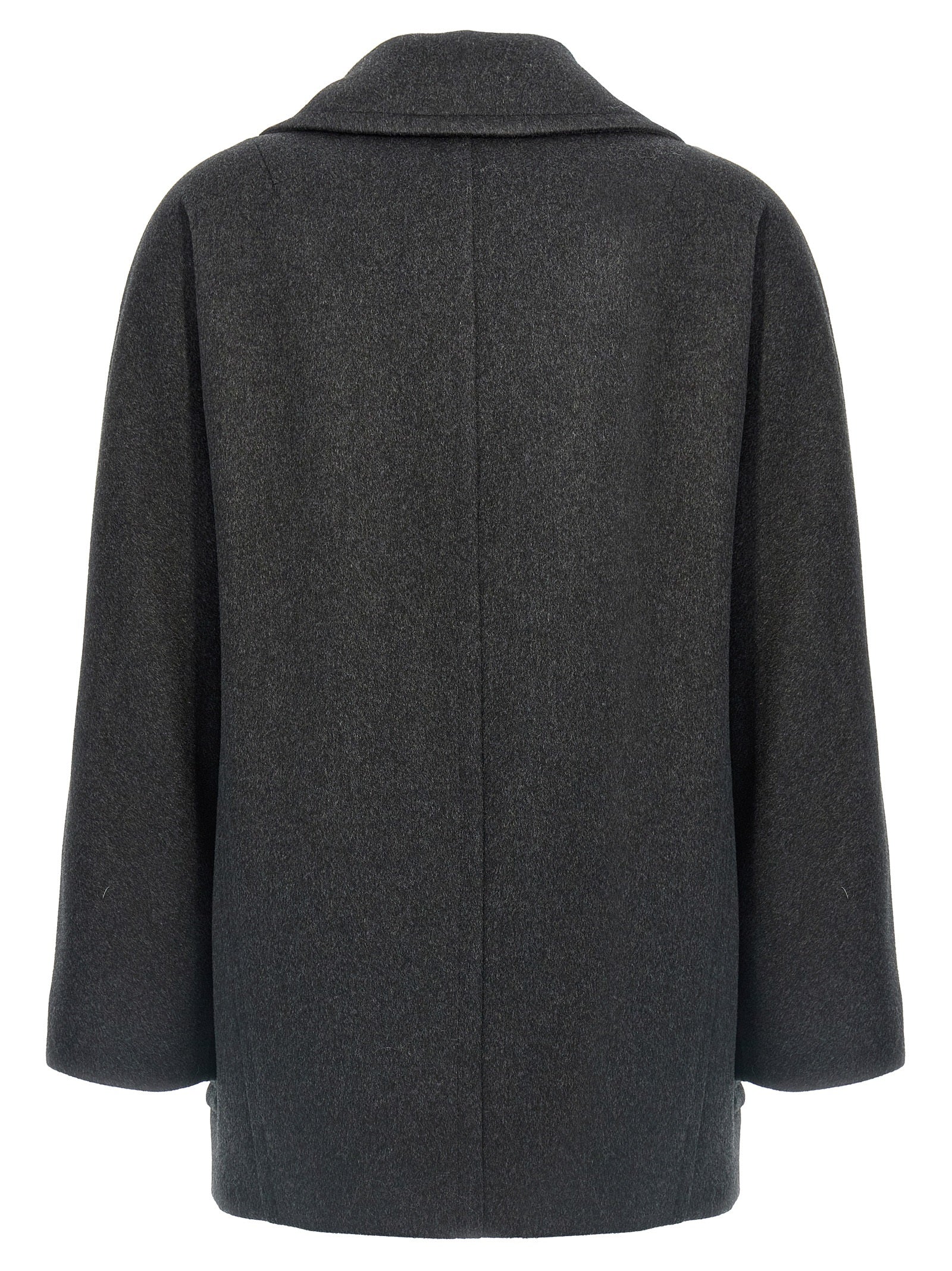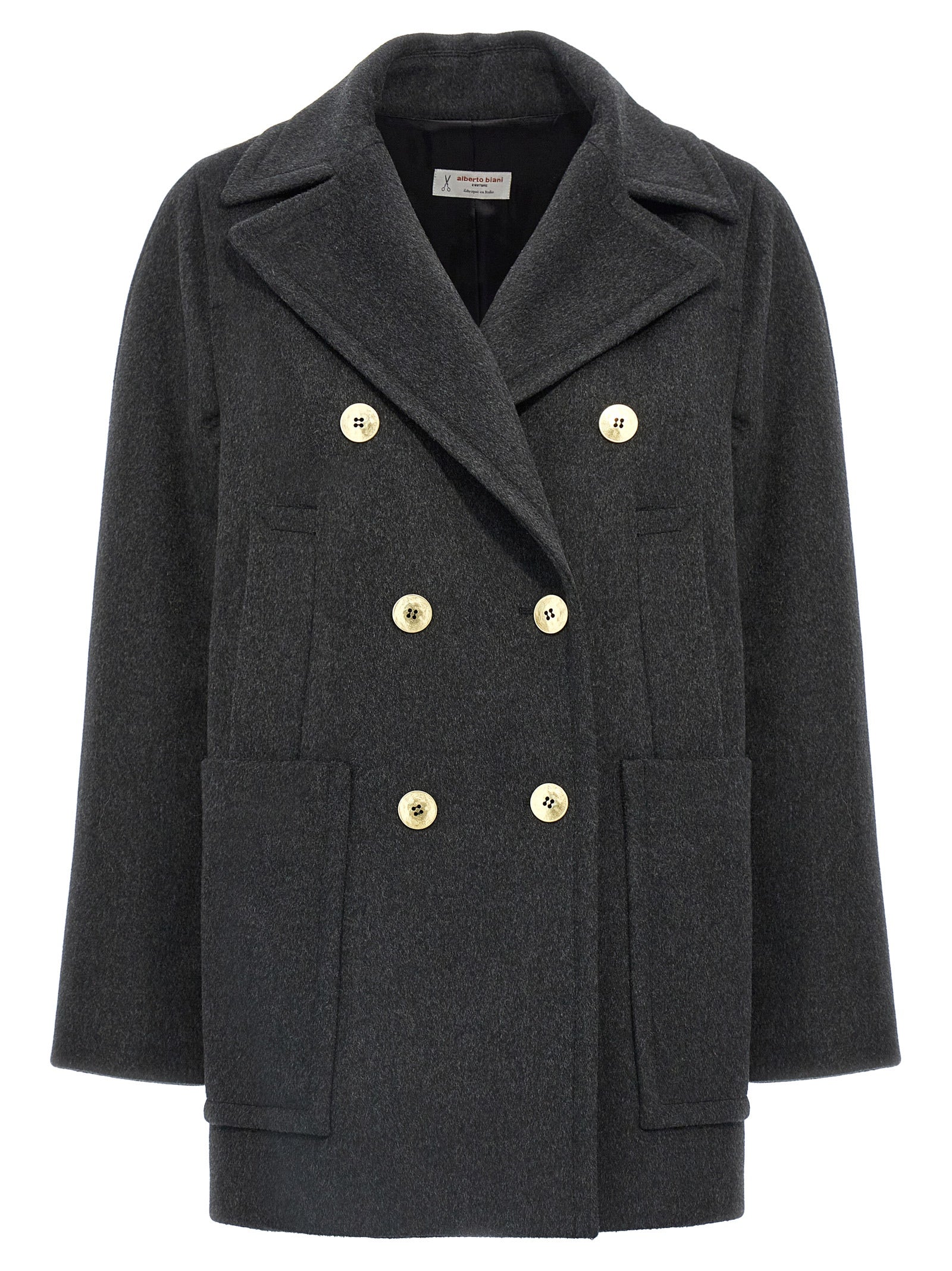 Double-breasted wool coat, mirror lapels, button closure, pockets, long sleeves.