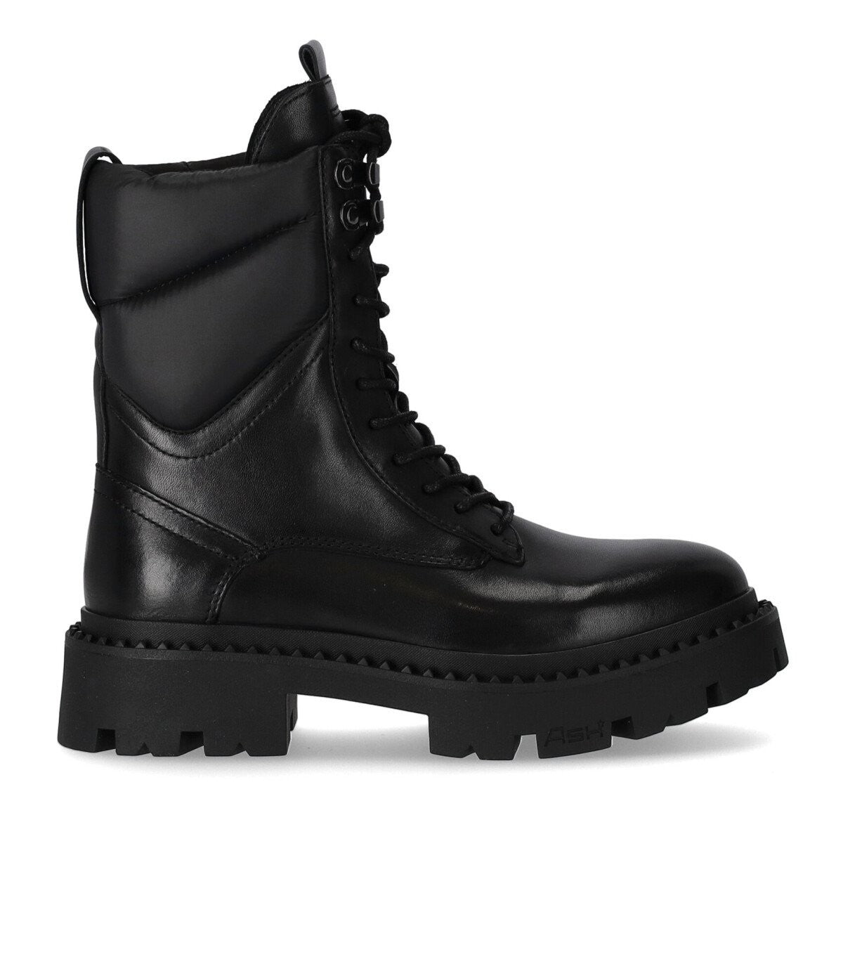 Devo combattere lo stivale da cenere in pelle e nylon imbottito in sfumature di nero. Forenza in pelle e soletta, lacci abbinati e suola a spina in gomma nera con piccoli micro stalloni gommati lungo i bordi. Altezza 5 cm.