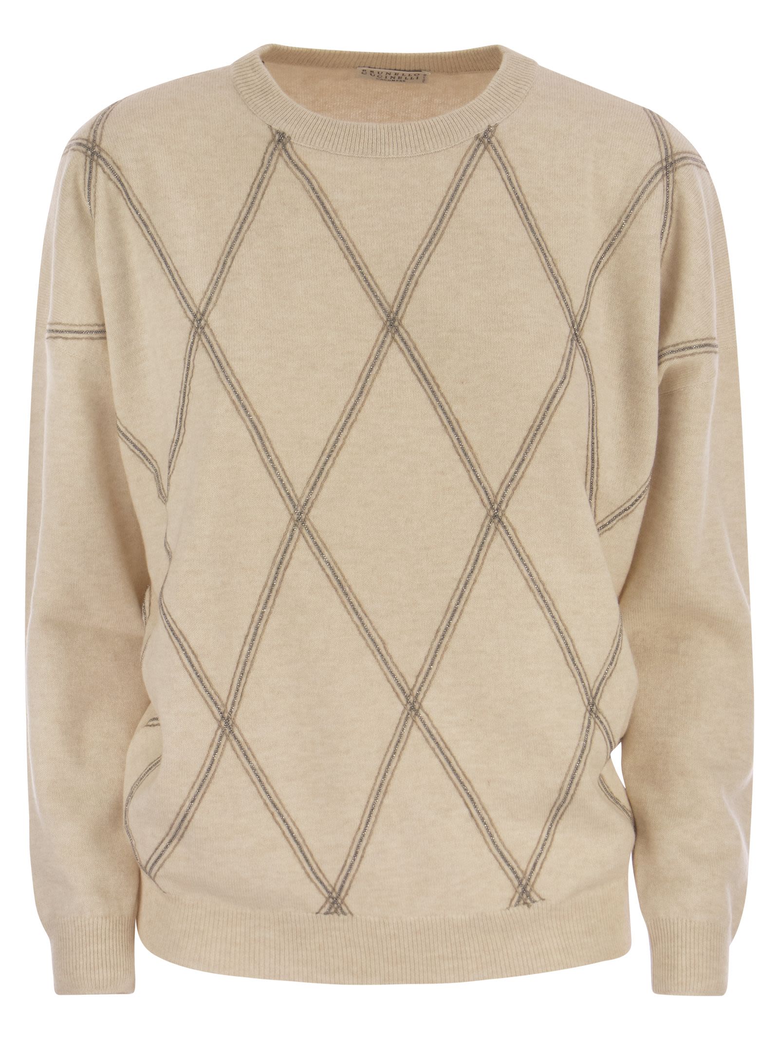 I materiali di fine Brunello Cucinelli arricchiscono lo stile essenziale della maglia in lana vergine, cashmere e seta. La trama morbida del filo incontra i lustre riflessi della collana che creano un motivo a diamante con un delicato effetto luminoso in stile Brunello Cucinelli. - Neck rotondo - Fit morbido - Gioiello - ID designer spalle cadute: M16188700 C9575