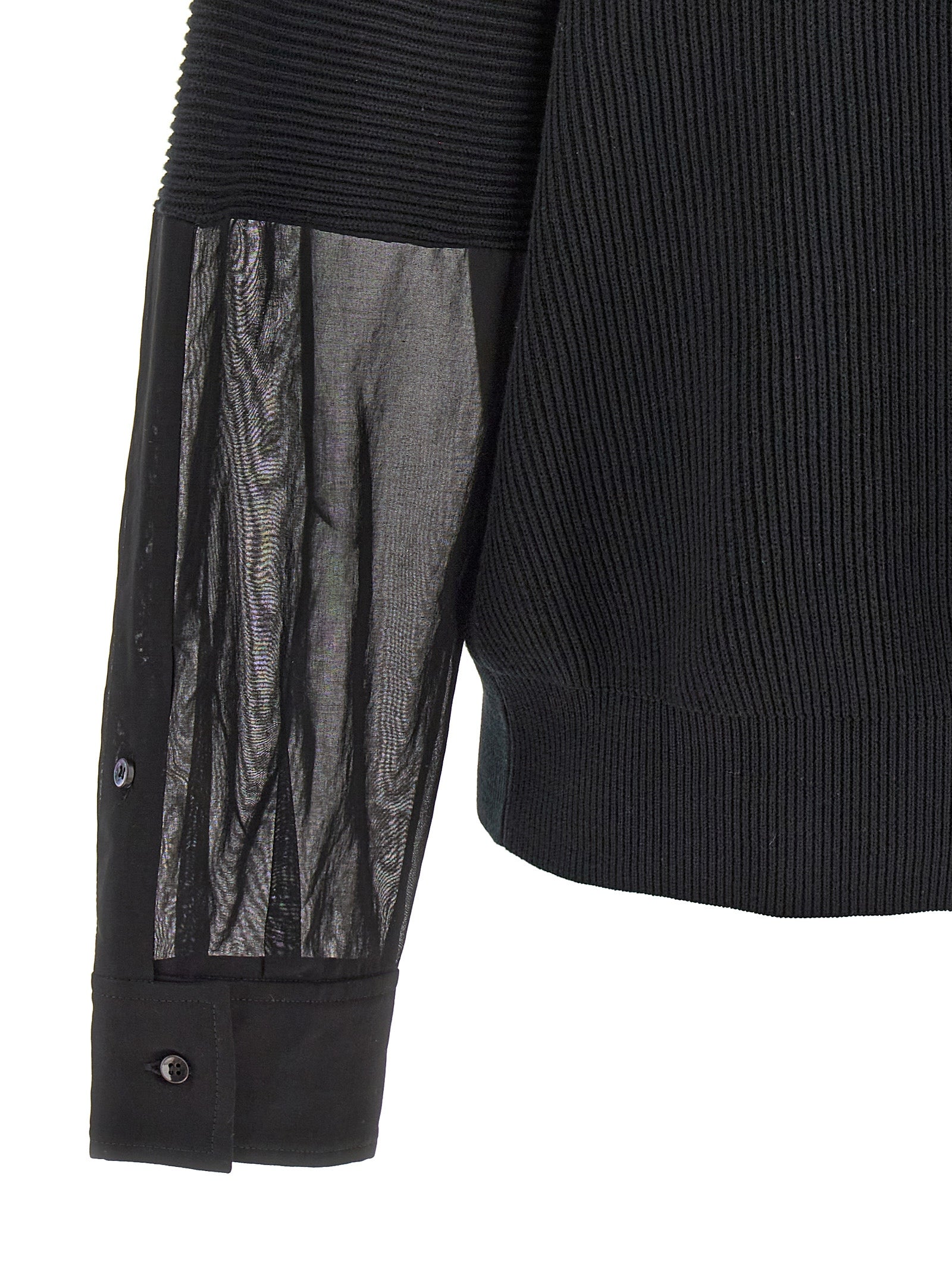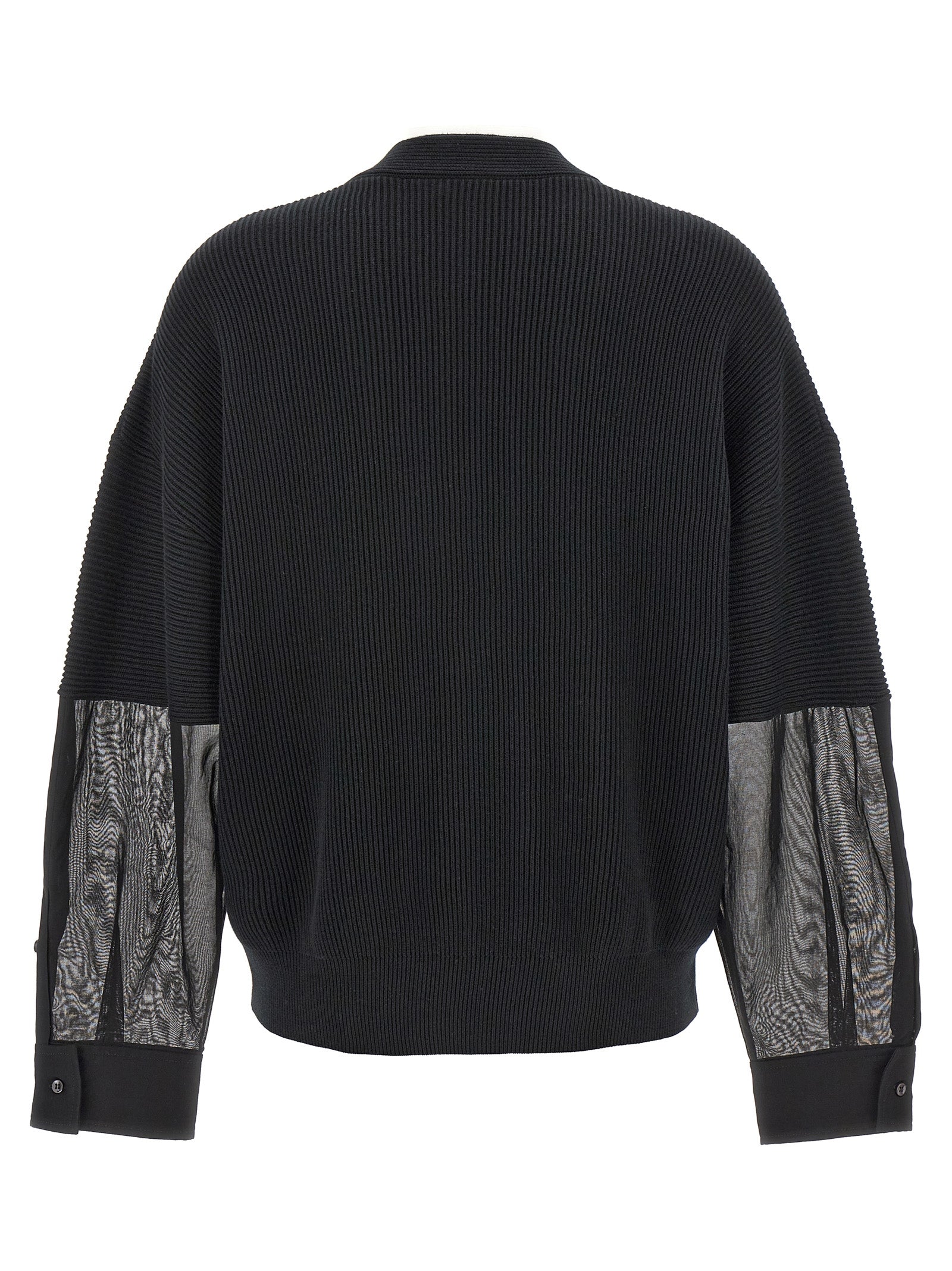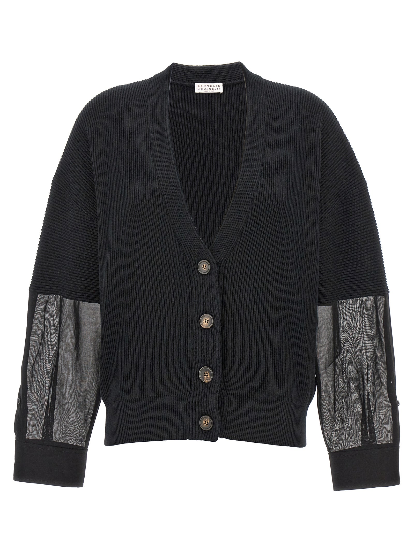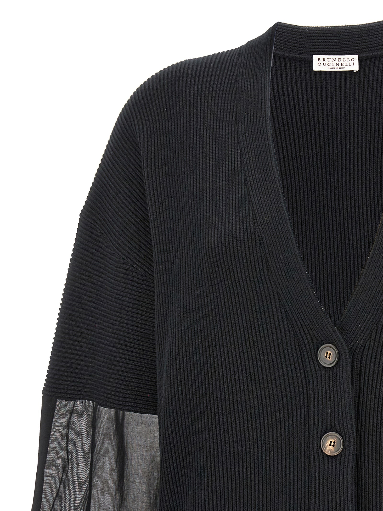 Cardigan di cotone a coste con maniche a fanatico lungo, inserto in tessuto a contrasto, chiusura dei pulsanti.