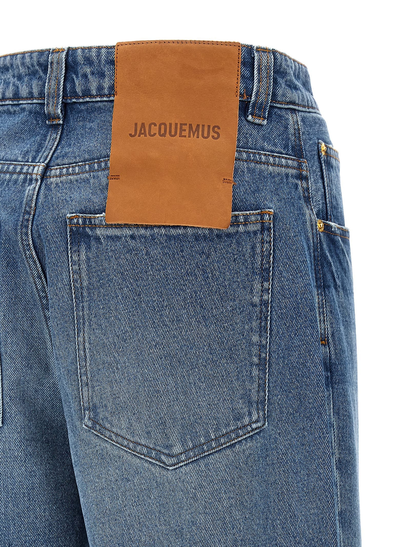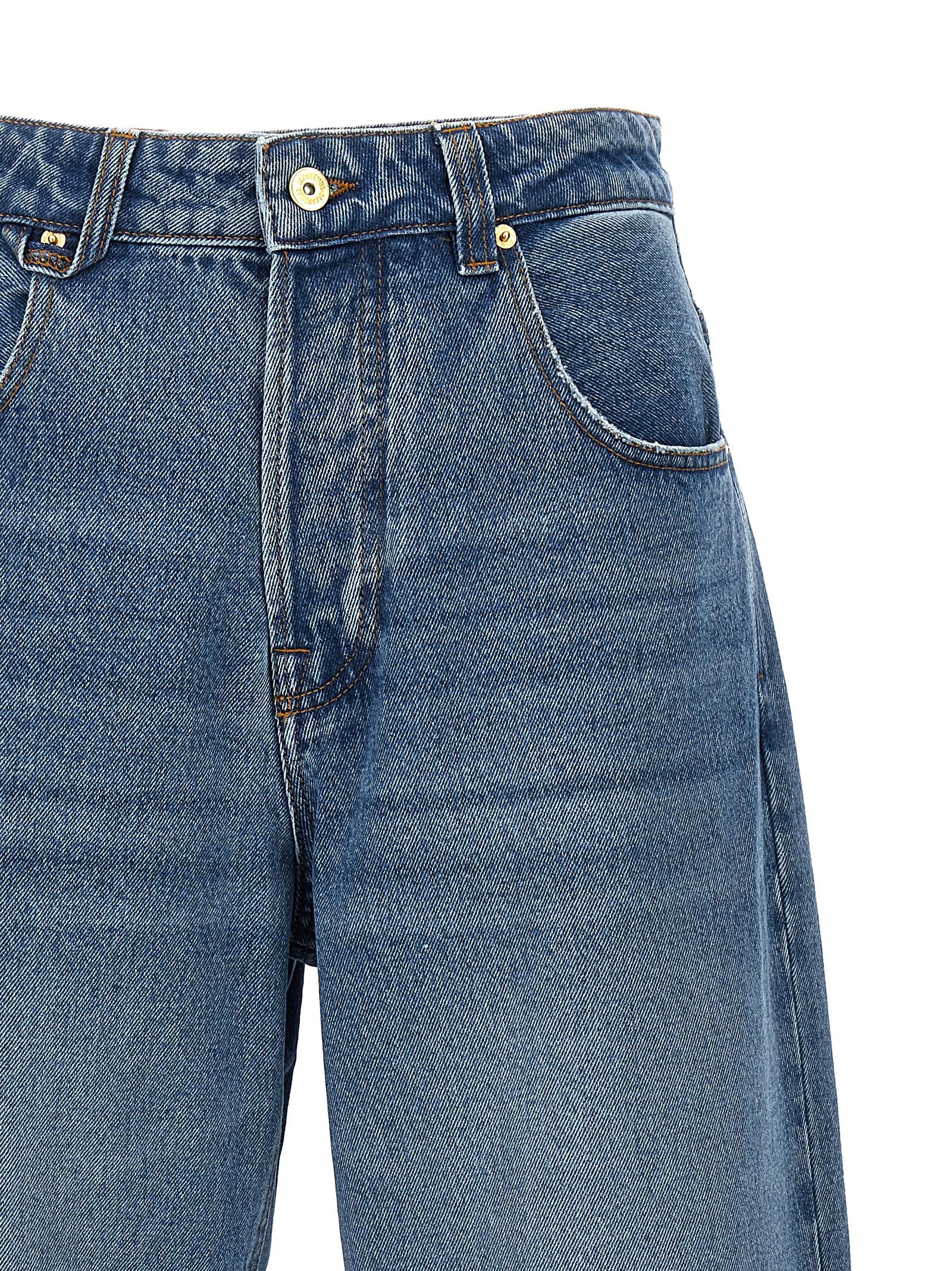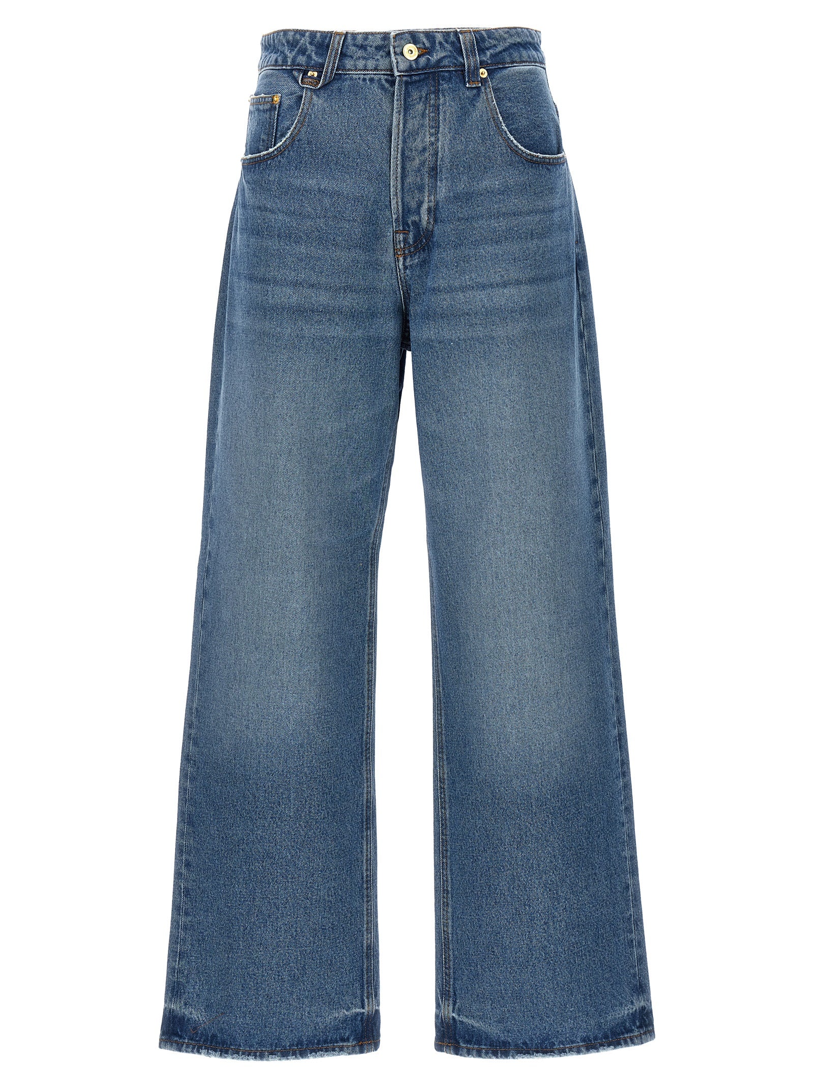 Jeans in denim in cotone "Le de-nîmes con dettagli a effetto usato, chiusura dei pulsanti, cinque tasche, tag a logo maxi in pelle, modello a media ridotta con gamba larga.