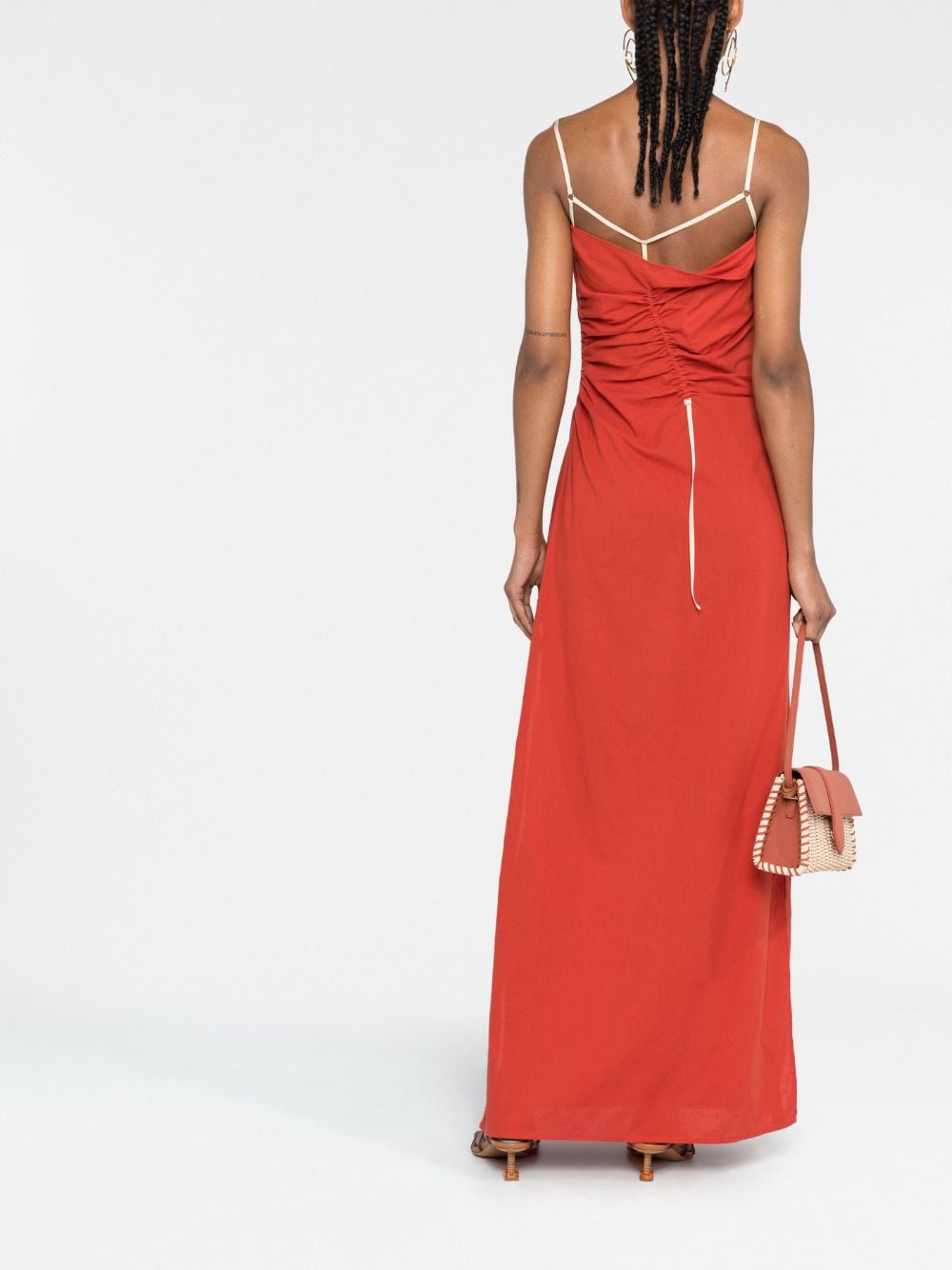 La Robe Gaua abito lungo di Jacquemus con rosso corallo, cotone, dettagli raccolti, dettagli drappeggiati, collo quadrato, cinturini di spaghetti, due fessure laterali altine, fissaggio con zip laterale nascosto e lunghezza della caviglia.