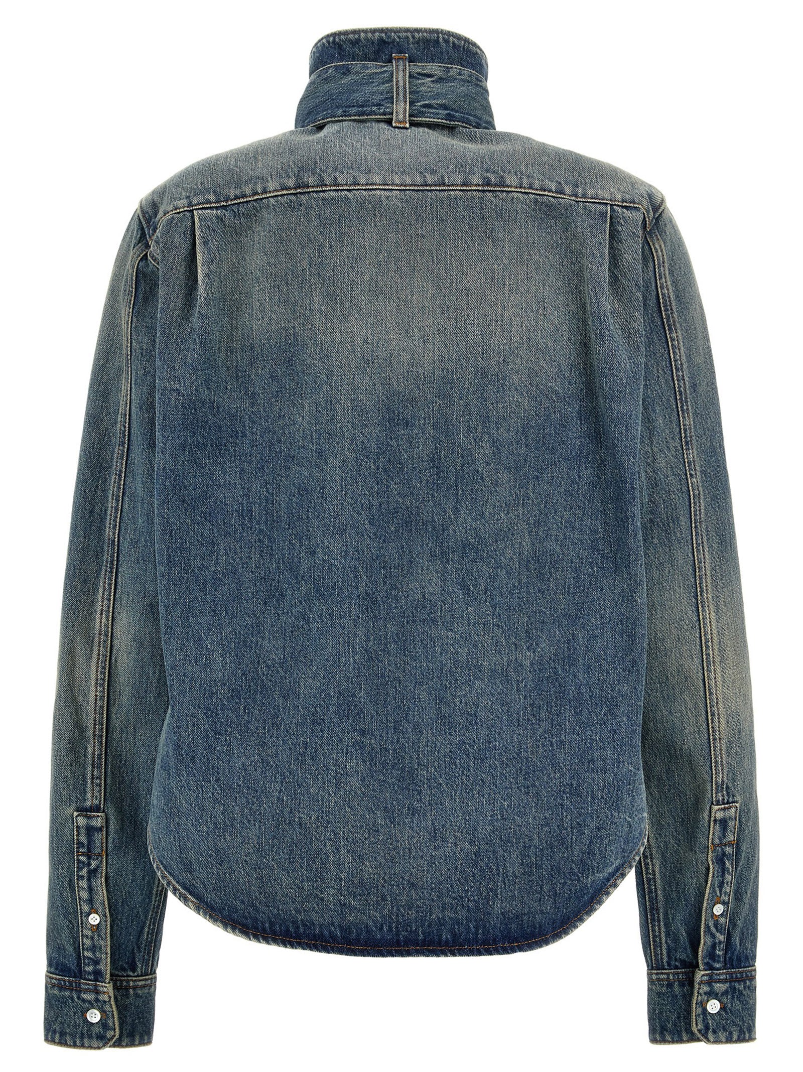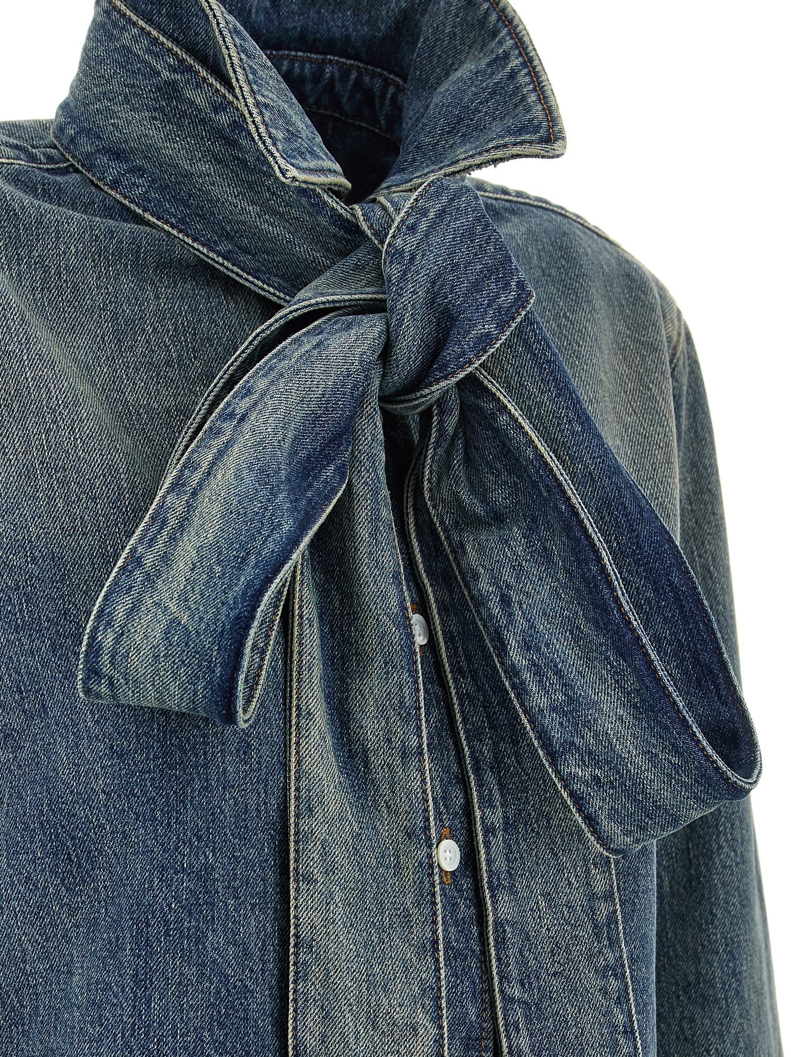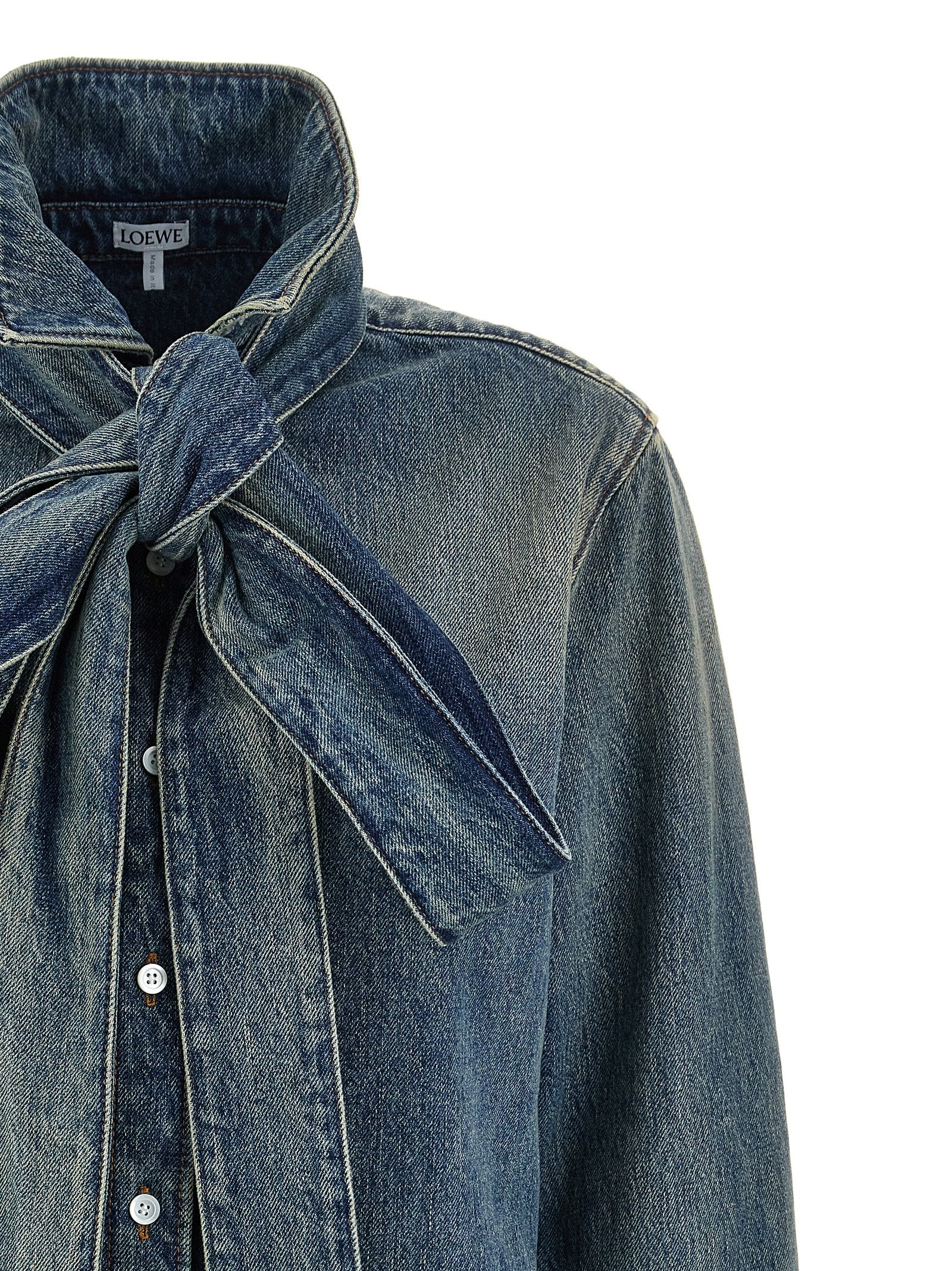 Camicia di jeen di cotone con fiocco per legare intorno al collo, chiusura a bottone, maniche canciature lunghe.