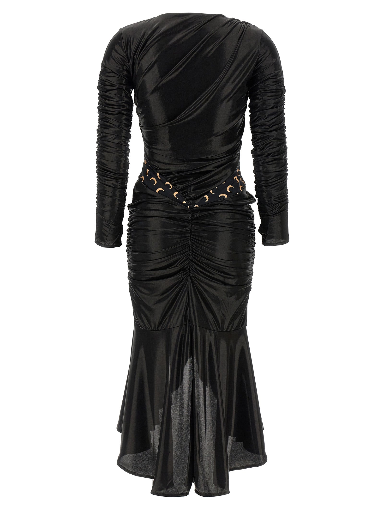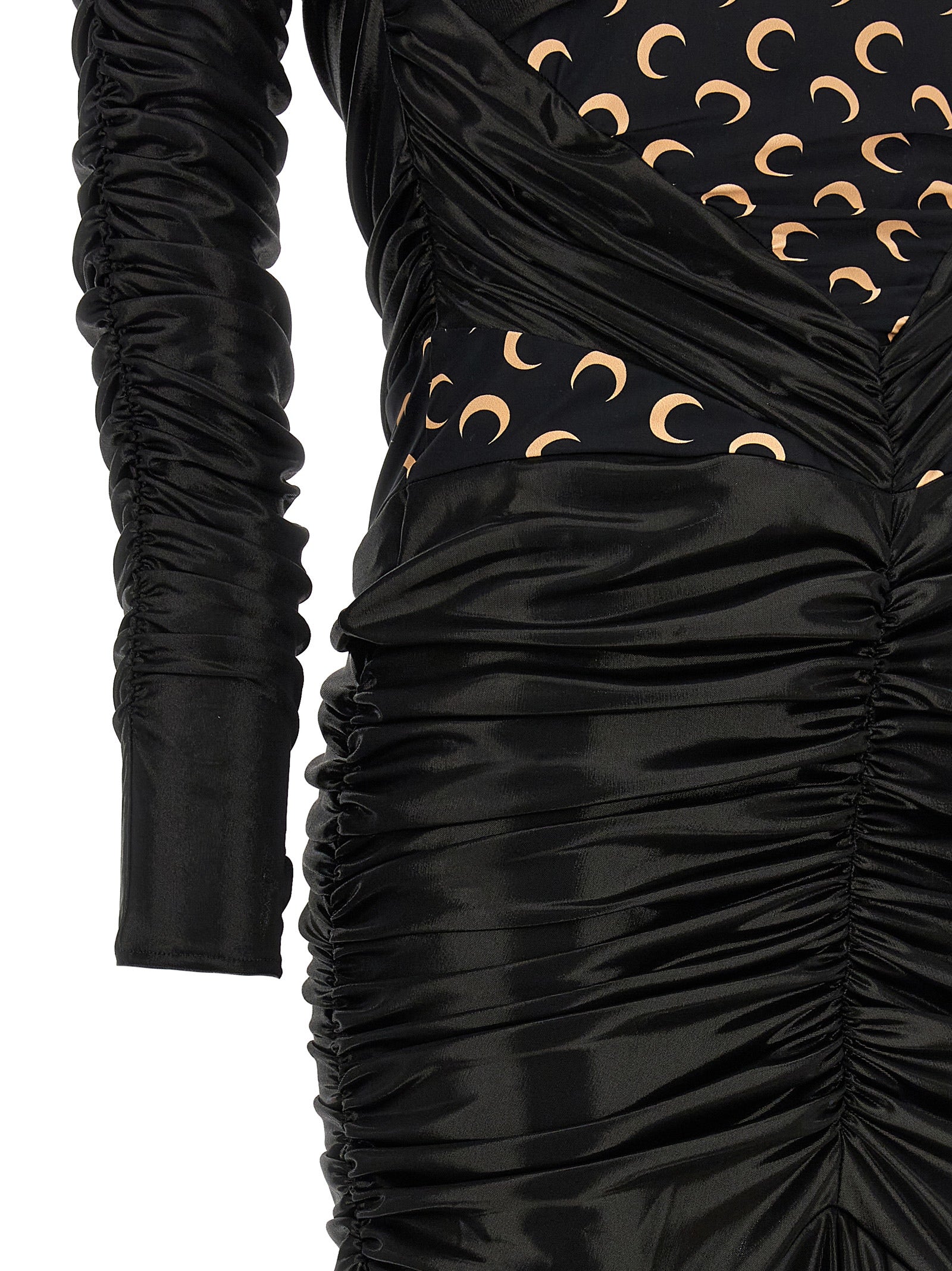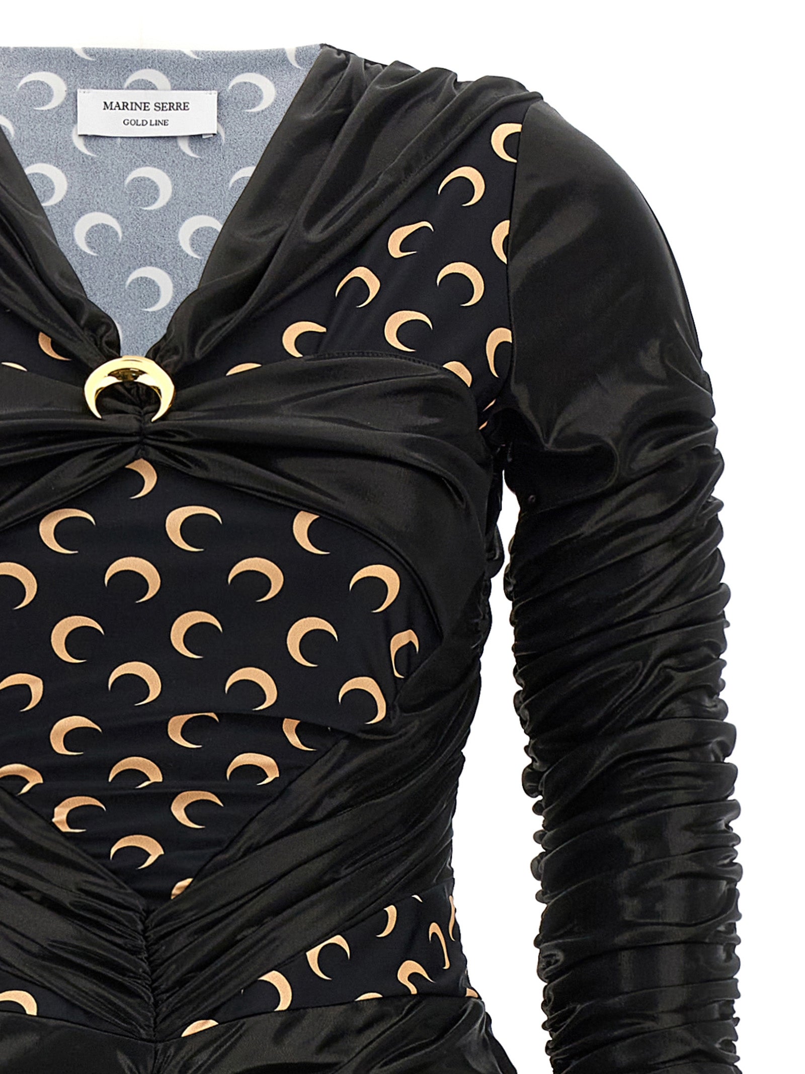 Vestiti in tessuti patchwork con stampa logo all-over ed effetto rivestito. Modello a maniche lunghe con scollo a V con dettaglio con spalla a forma di luna, chiusura a zip laterale.