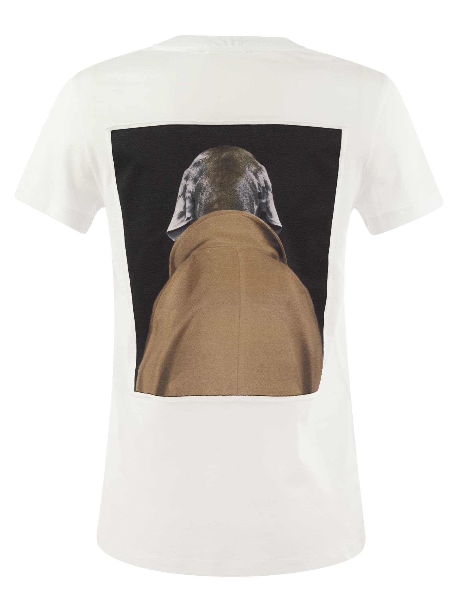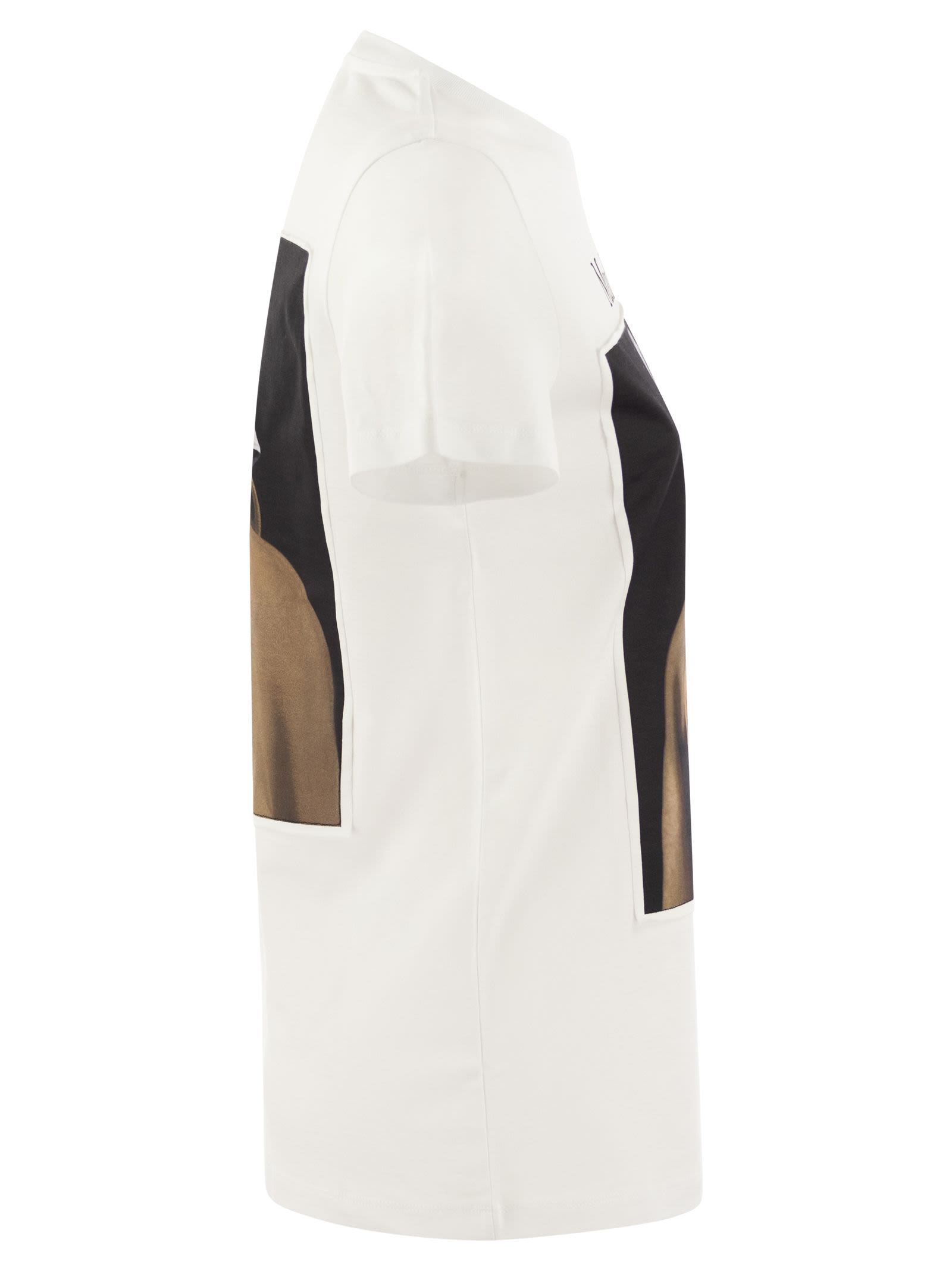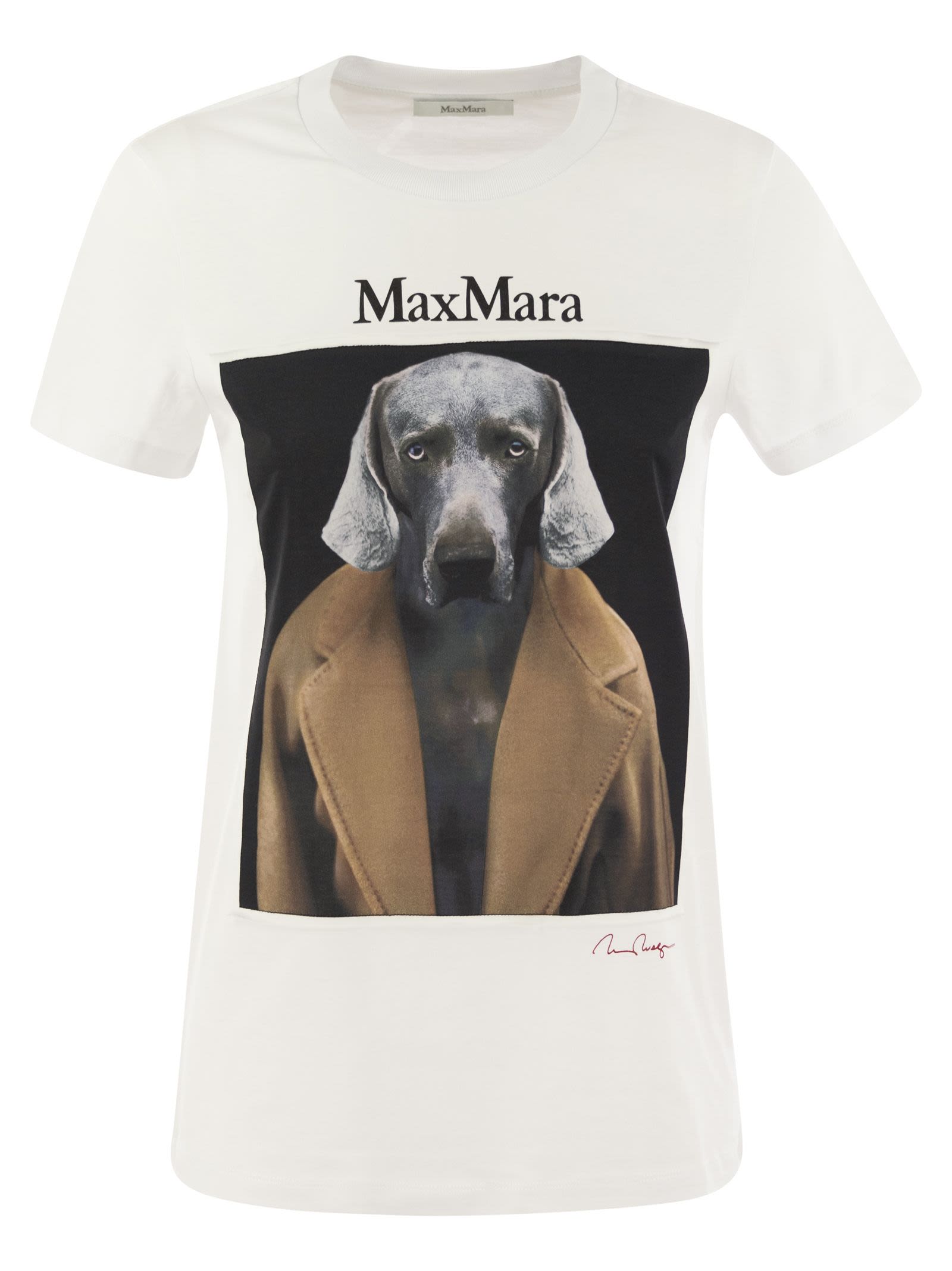 T-shirt a maniche corte realizzata in morbida maglia di cotone puro con un logo Max Mara contrastante. Il modello è personalizzato, davanti e dietro, con un'immagine stampata dell'artista William Wegman che raffigura il suo Weimaraner che indossa l'iconico 101801 nei colori stagionali della collezione. - consegnato con confezione corrispondente - maniche corte - ID progettista di stampa anteriore: 2421946071600 016
