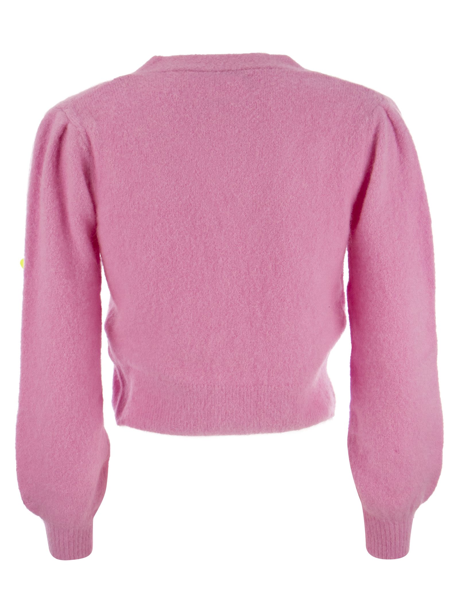 Cardigan a corto in maglia spazzolato con maniche a soffio e tappi ricamati in 3D. Fissaggio a 3 bottoni, colletto a coste e polsini. - Fiori ricamati - ID designer adatta normale: LYZ0001 00189E