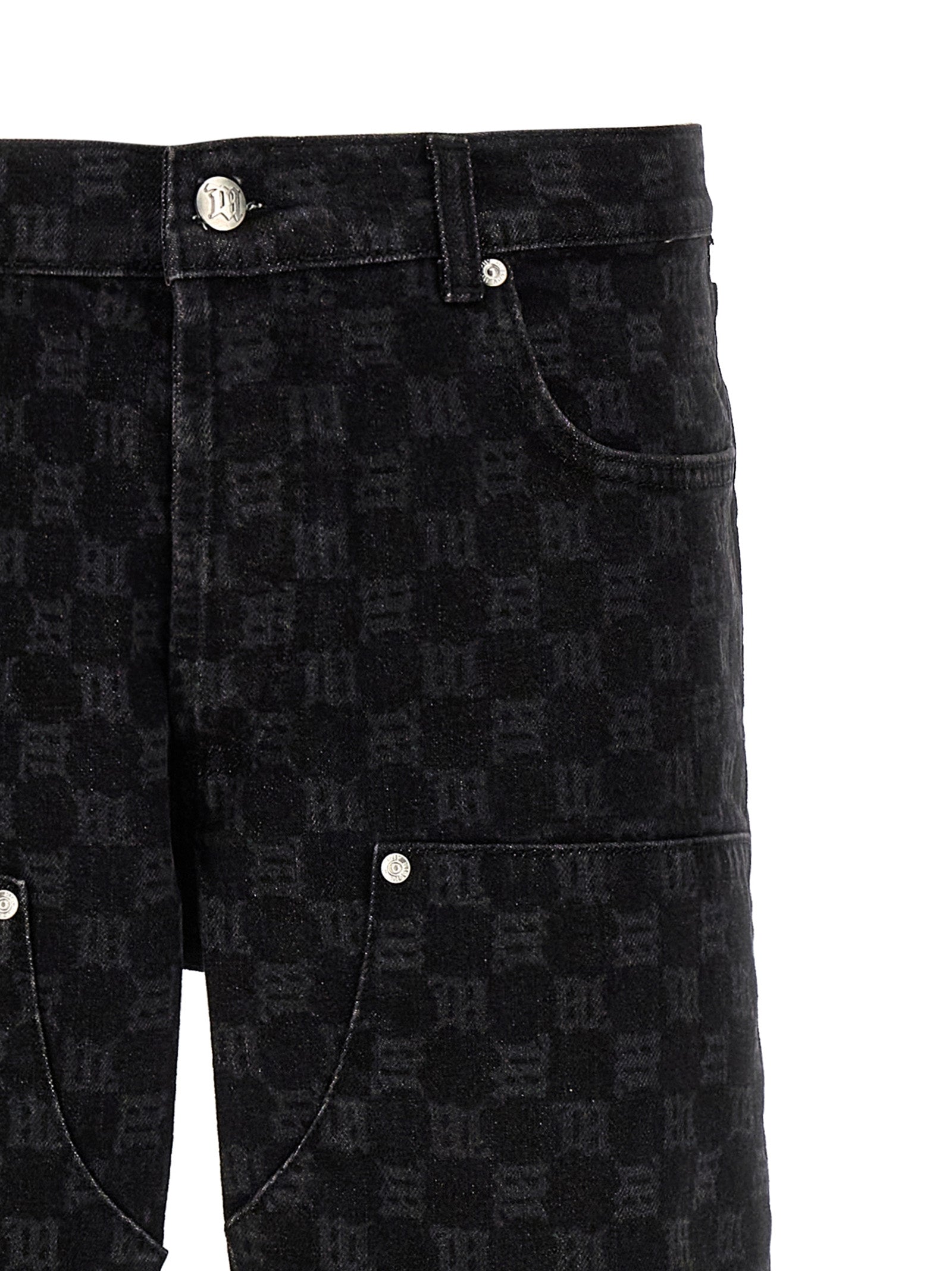 Jeans di denim elastico "carpenter monogramma" con stampa a logo all-over, chiusura dei pulsanti, cinque tasche, tag logo in pelle.
