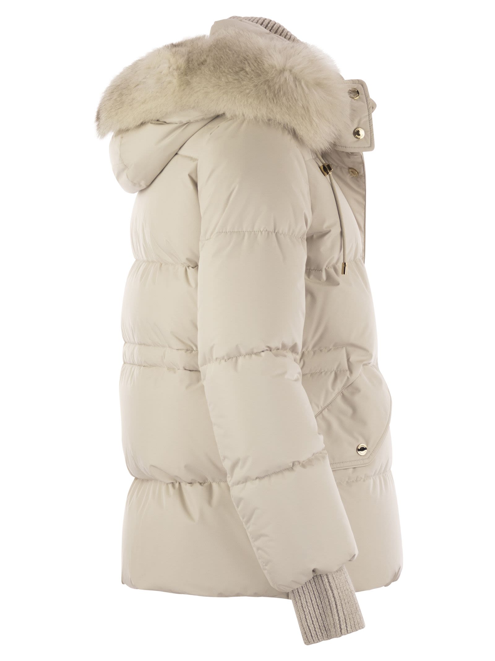 Short down jacket with hood and fur, quilted in large boudin. Made of a comfortable, silky-looking technical fabric, combined with a waterproof membrane. - Removable, boudin-quilted, zipped inner bodice - Large removable and adjustable hood, with windproof lapels fastened with press studs - Warm rib-knit collar - Double front fastening with bright golden double-slider zip and press studs - Warm rib knit sleeves - Welt pockets with flaps at the hips, fastened with press studs - Adjustable internal drawstring to highlight the waist - Made in Italy DESIGNER ID: MODPA100019TEPA023 U0103