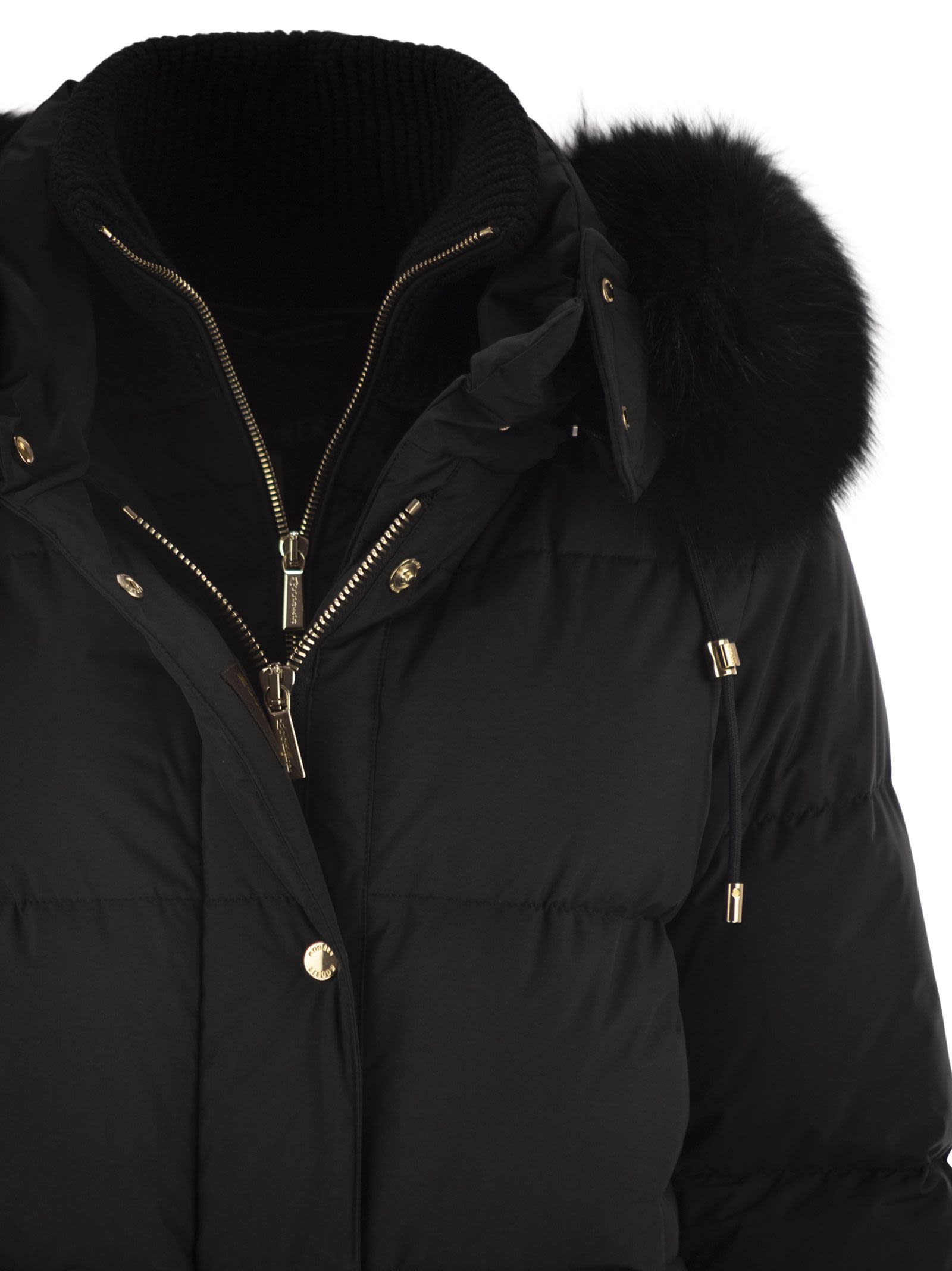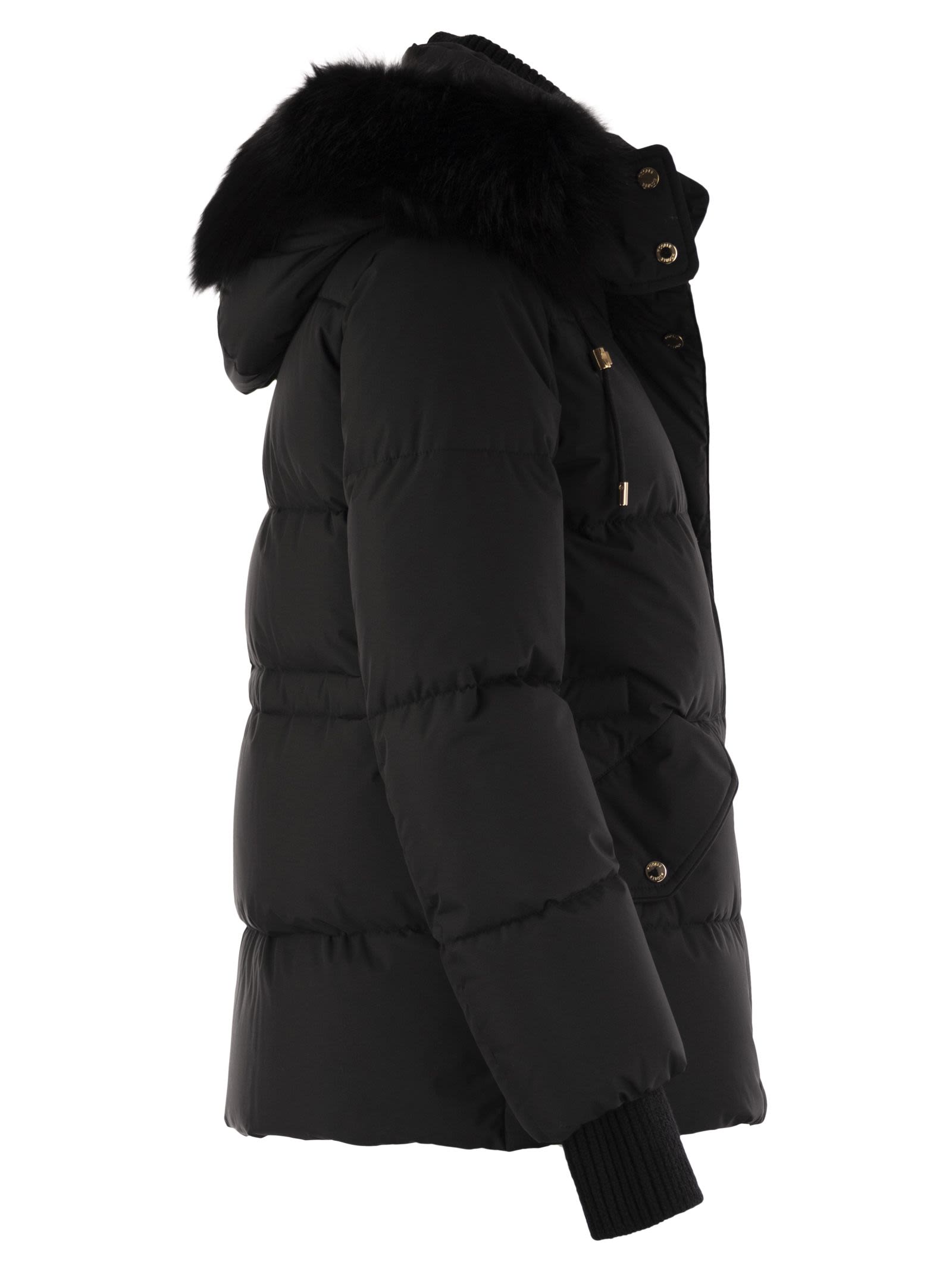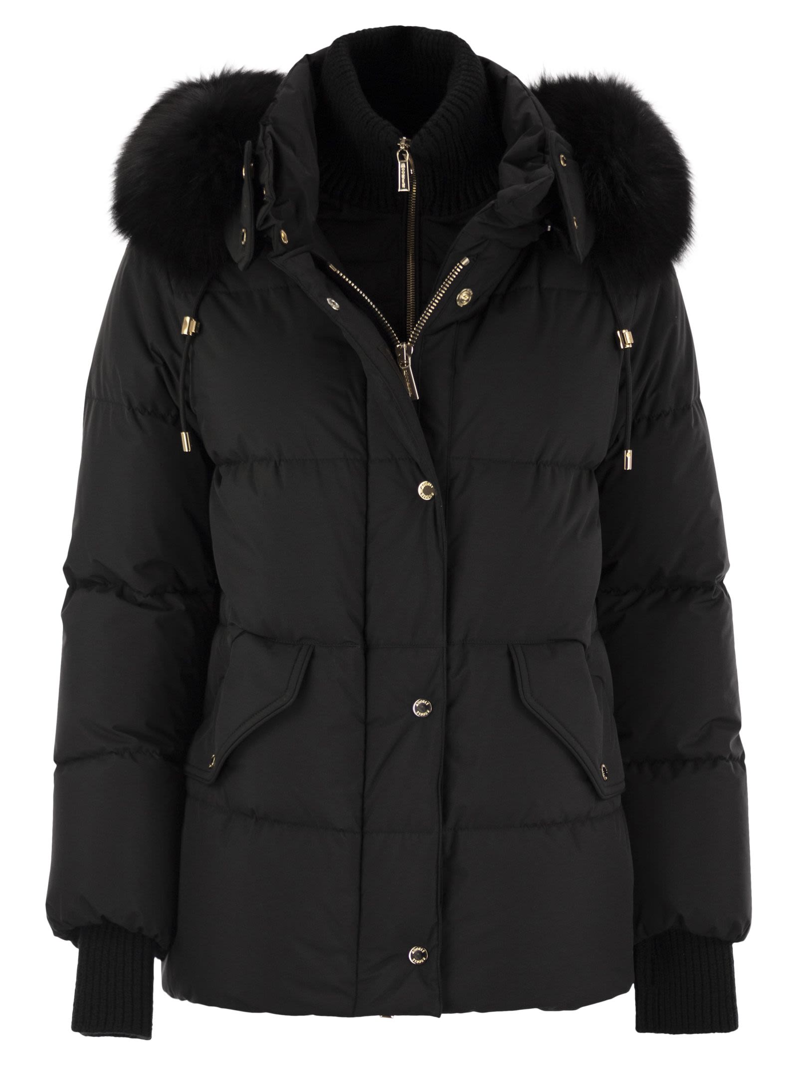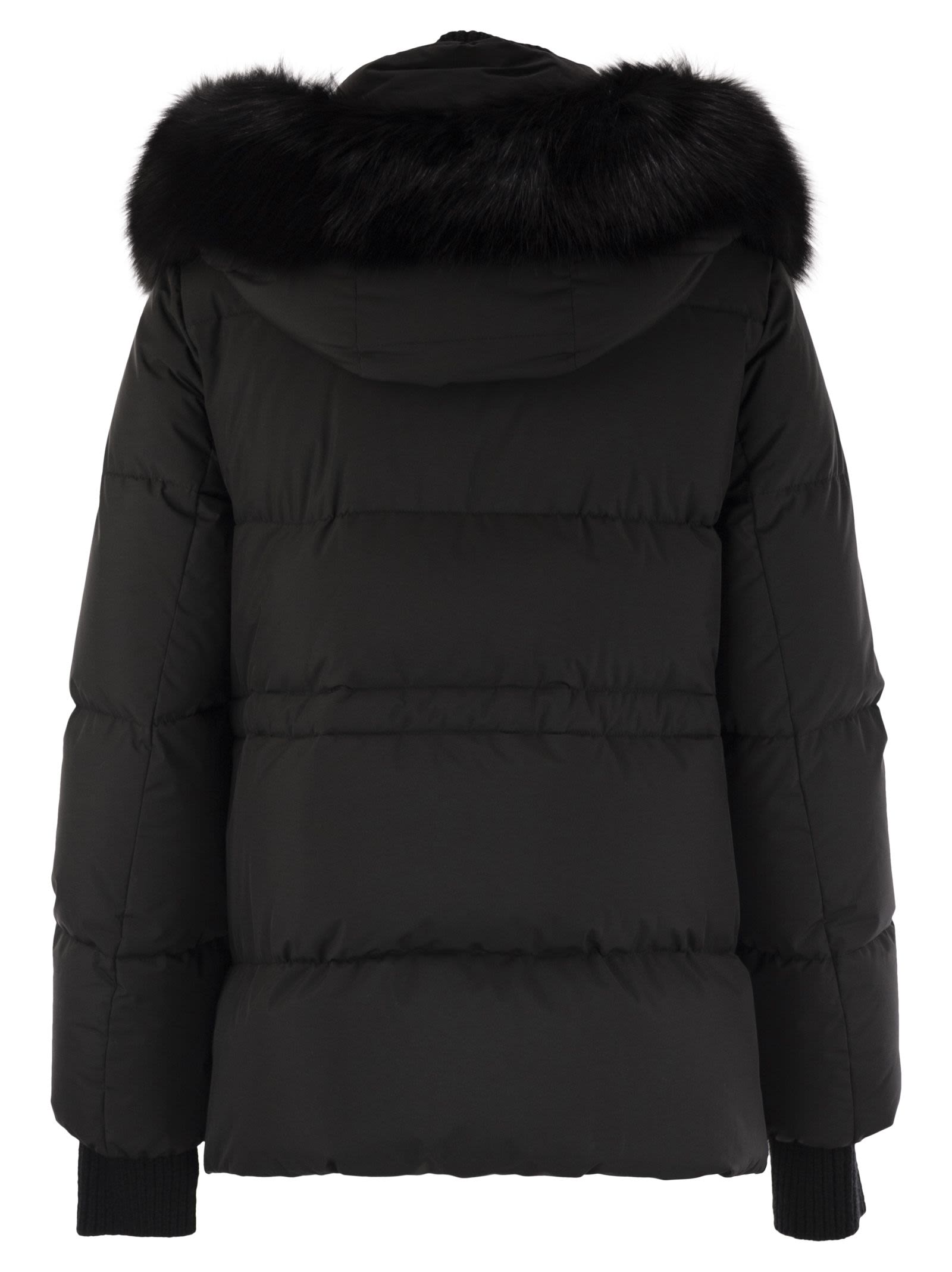 Short down jacket with hood and fur, quilted in large boudin. Made of a comfortable, silky-looking technical fabric, combined with a waterproof membrane. - Removable, boudin-quilted, zipped inner bodice - Large removable and adjustable hood, with windproof lapels fastened with press studs - Warm rib-knit collar - Double front fastening with bright golden double-slider zip and press studs - Warm rib knit sleeves - Welt pockets with flaps at the hips, fastened with press studs - Adjustable internal drawstring to highlight the waist - Made in Italy DESIGNER ID: MODPA100019TEPA023 U0001