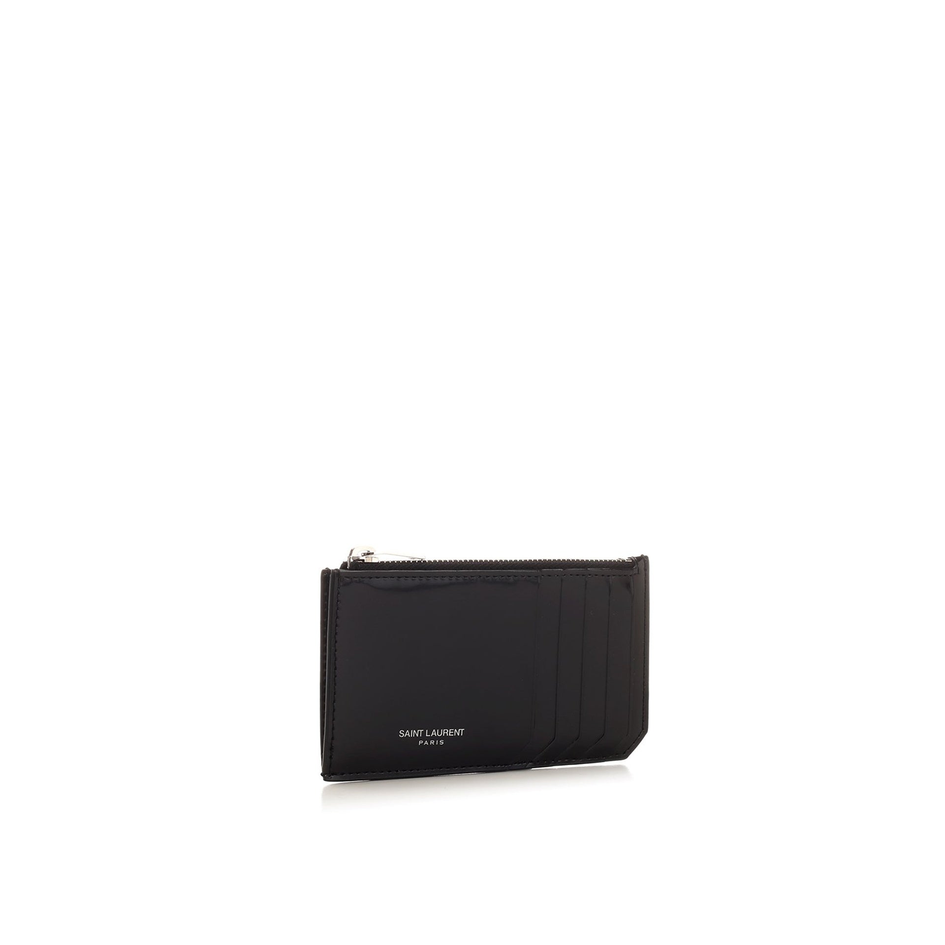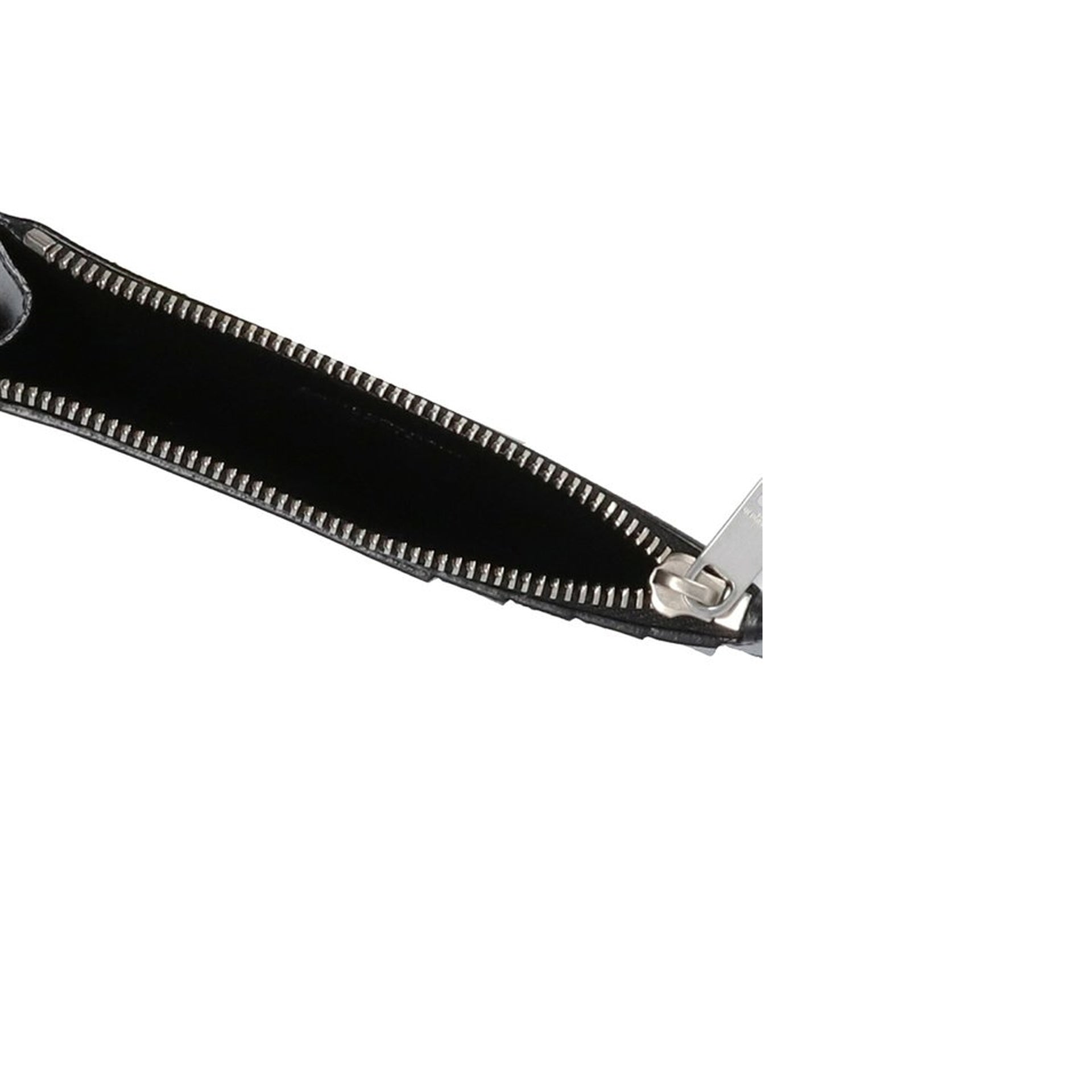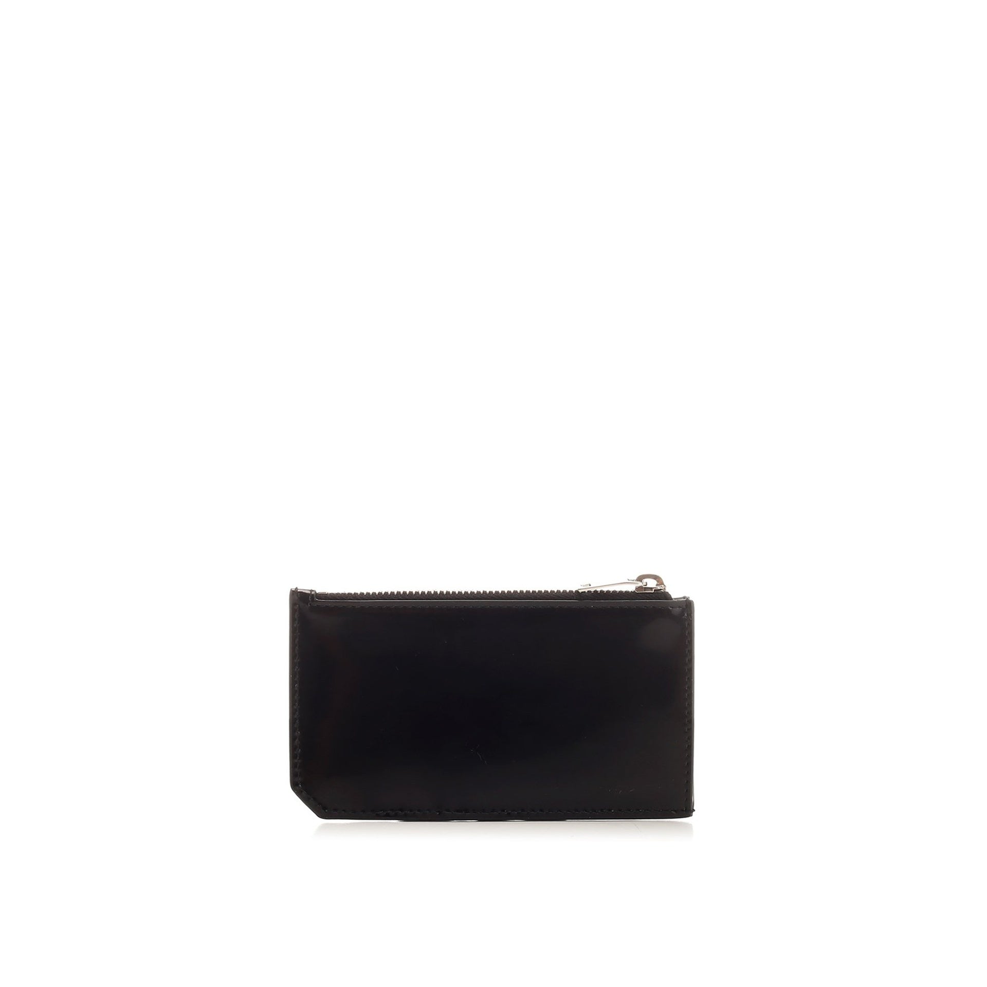 - Composizione: cuoio a vitello 100% - Effetto di brevetto - chiusura con cerniera superiore - altezza 7 cm - lunghezza 13 cm - larghezza 1 cm - slot a cinque carte - dettaglio logo tono d'argento - Made in Italia -