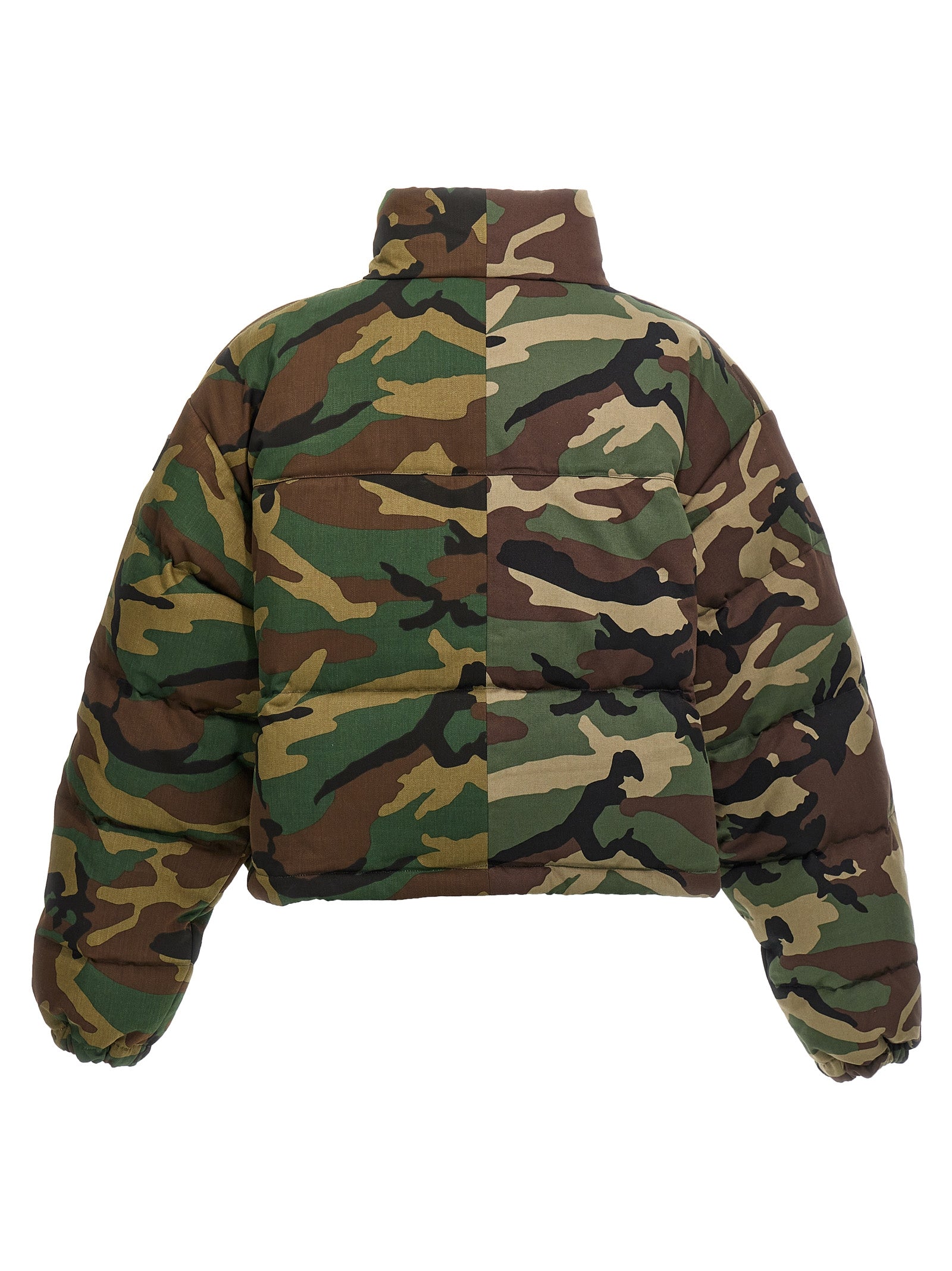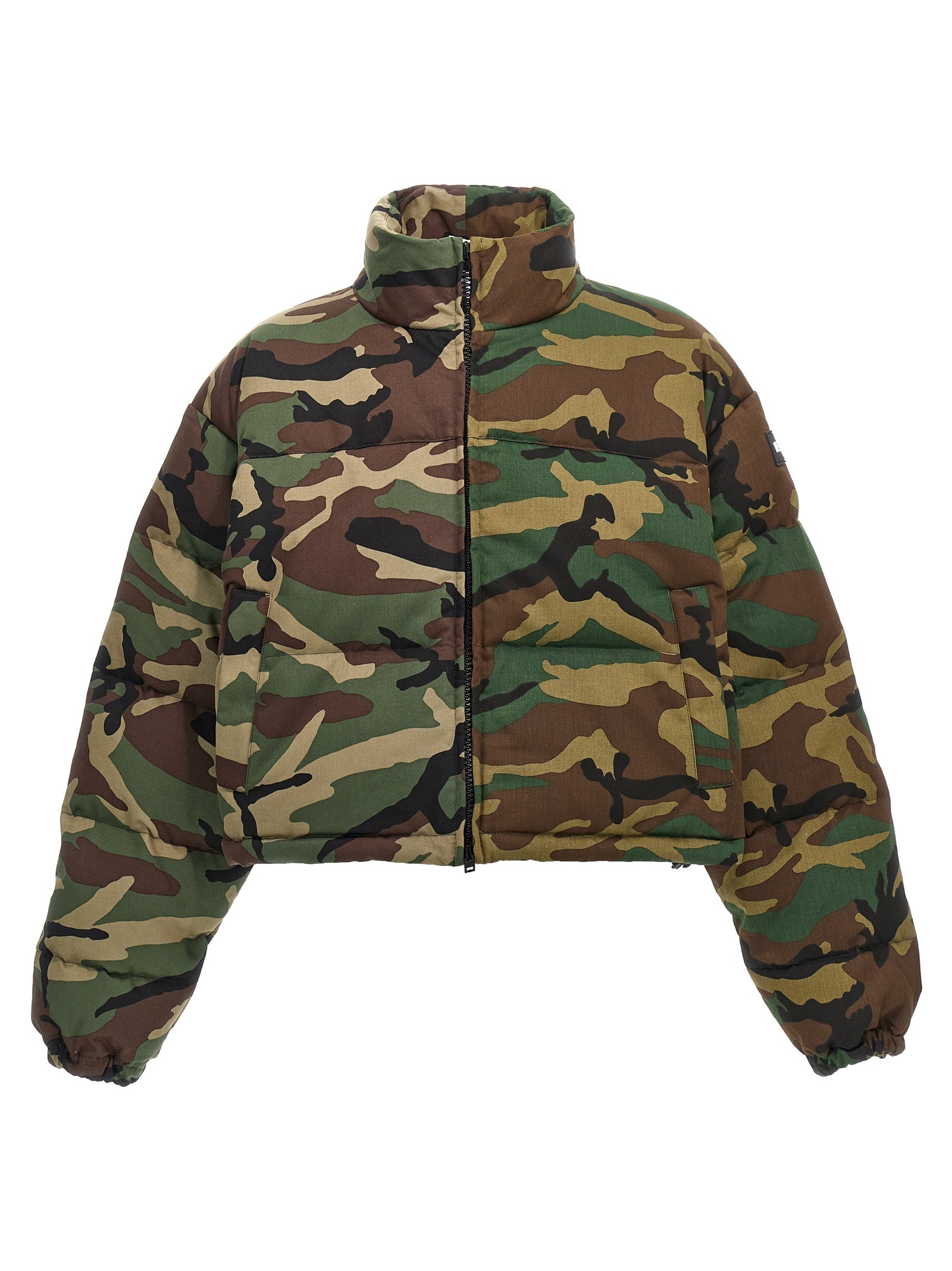 Giacca in giù con stampa mimetica imbottita, chiusura a zip, collo alto, maniche lunghe con polsini elastici, corse regolabili sull'orlo, logo gommati.