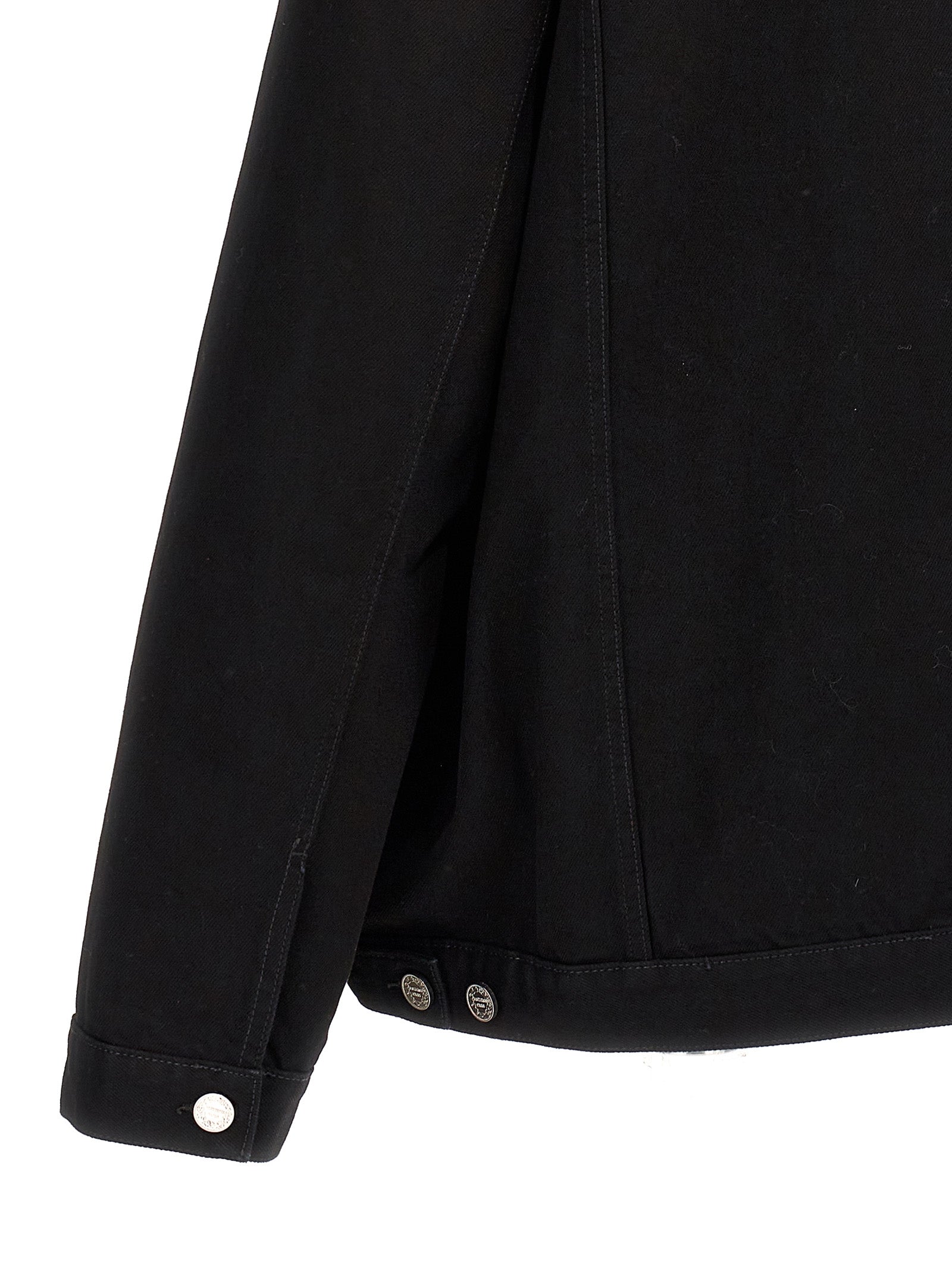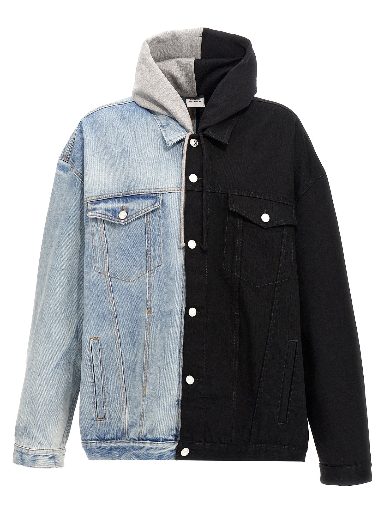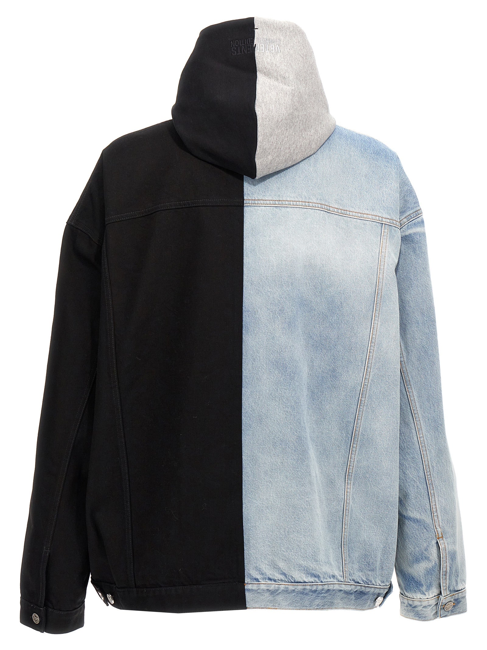 Giacca di jeans di cotone bicolore "diviso decostruito con chiusura a bottone, tasche, maniche confuse lunghe, cappuccio di cotone rimovibile.