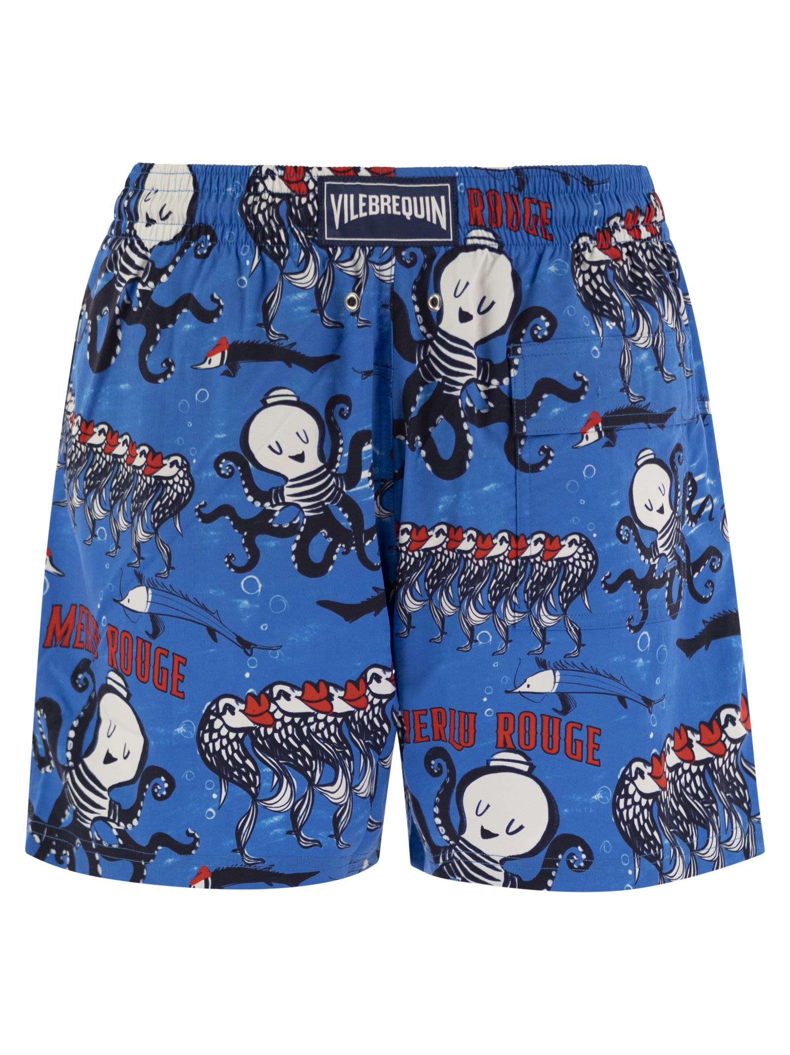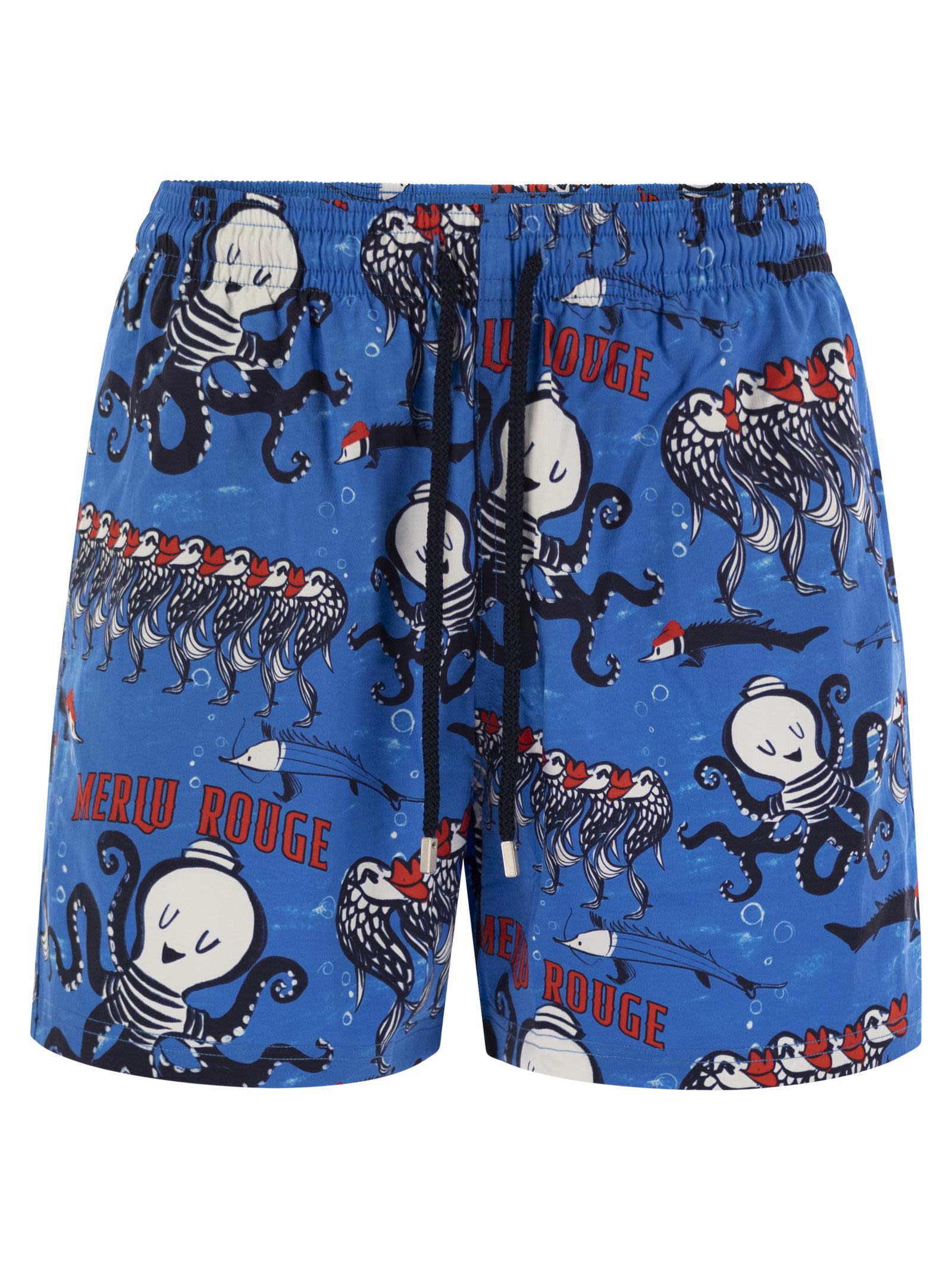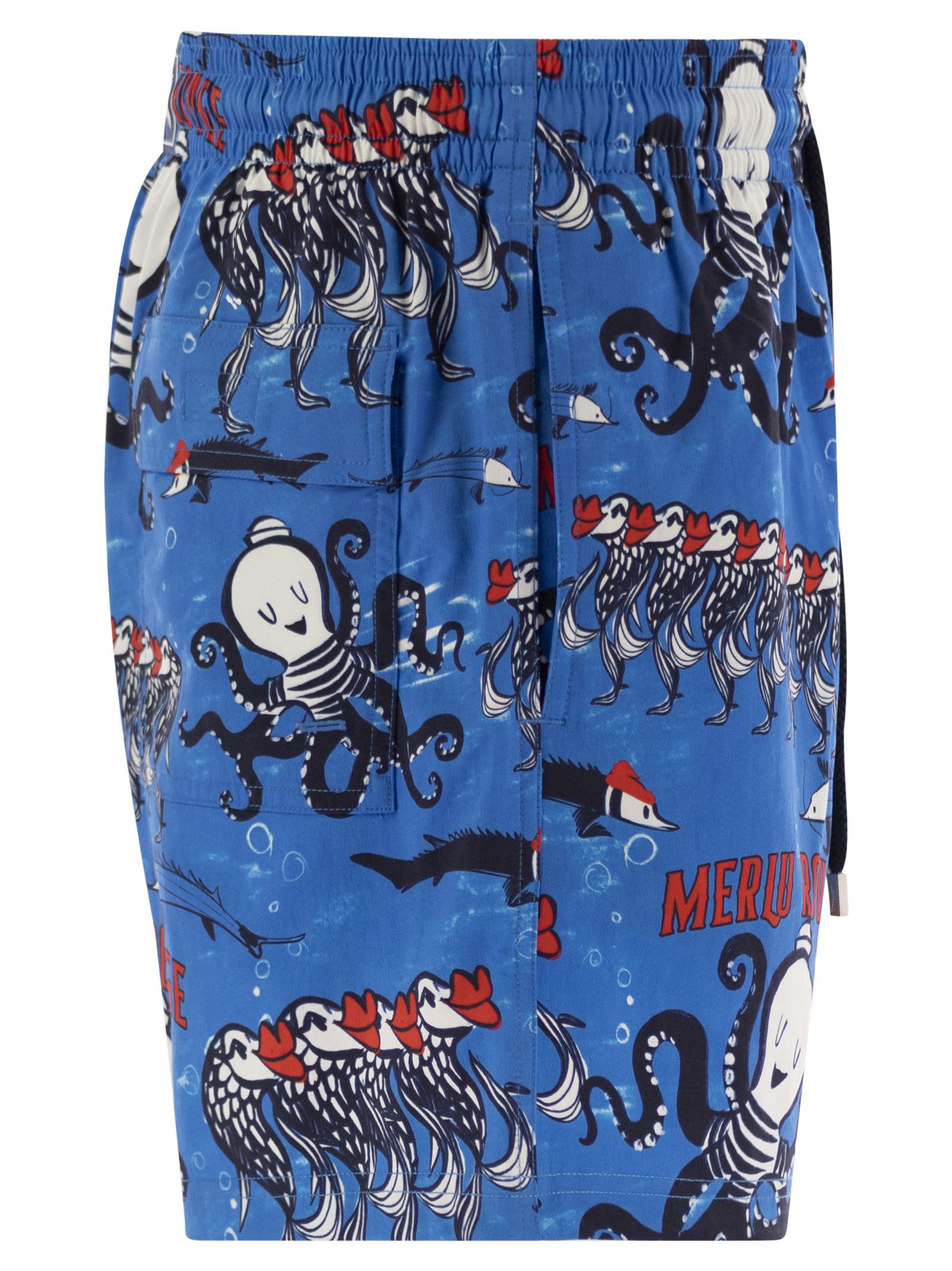 Abbelliti con una divertente stampa a tema per polpo, questi pantaloncini da beach riciclati e elastane presentano un taglio più breve per promuovere l'abbronzatura massima. - pantaloncini da nuoto tagliati più corti in tessuto elastico - cintura elasticizzata in giro per la vita e zamak con incisione di vilebrequin. Acqua - Au Merlu Rouge Swin Shorts Designer ID: MSOAF130 601