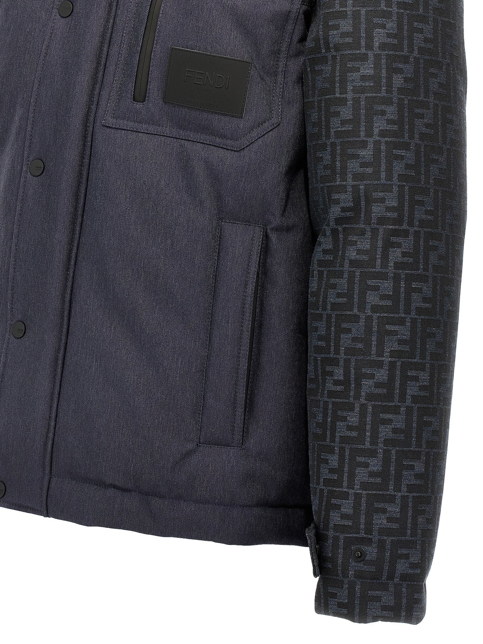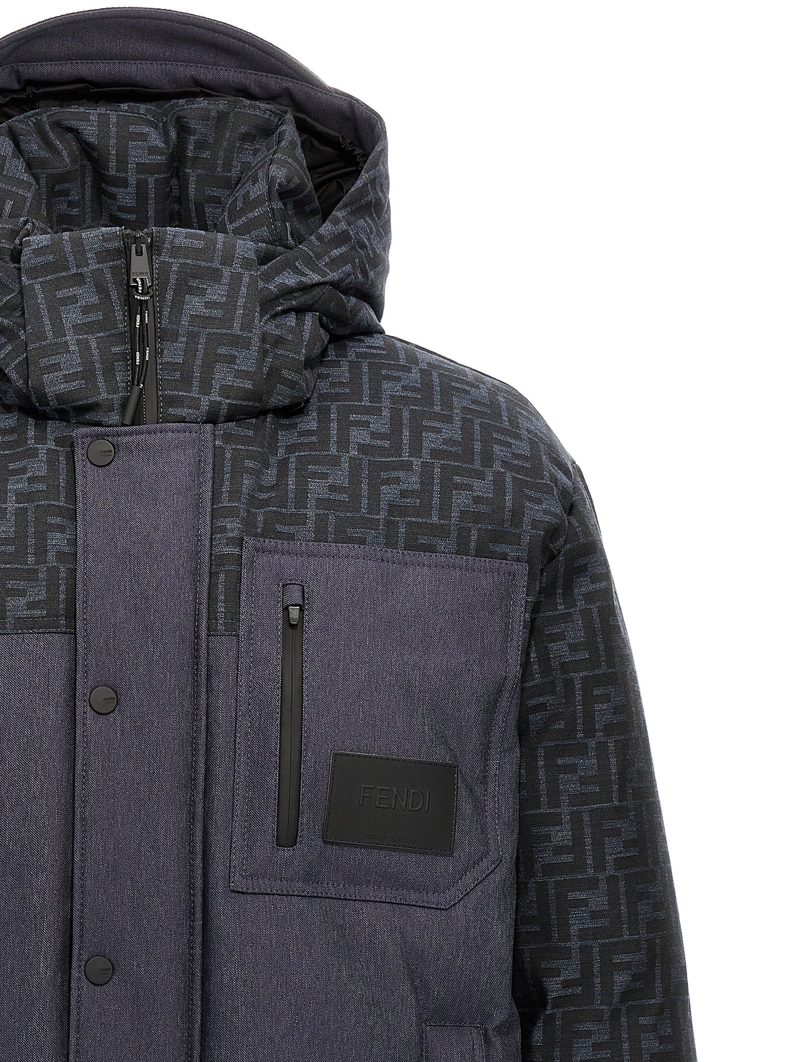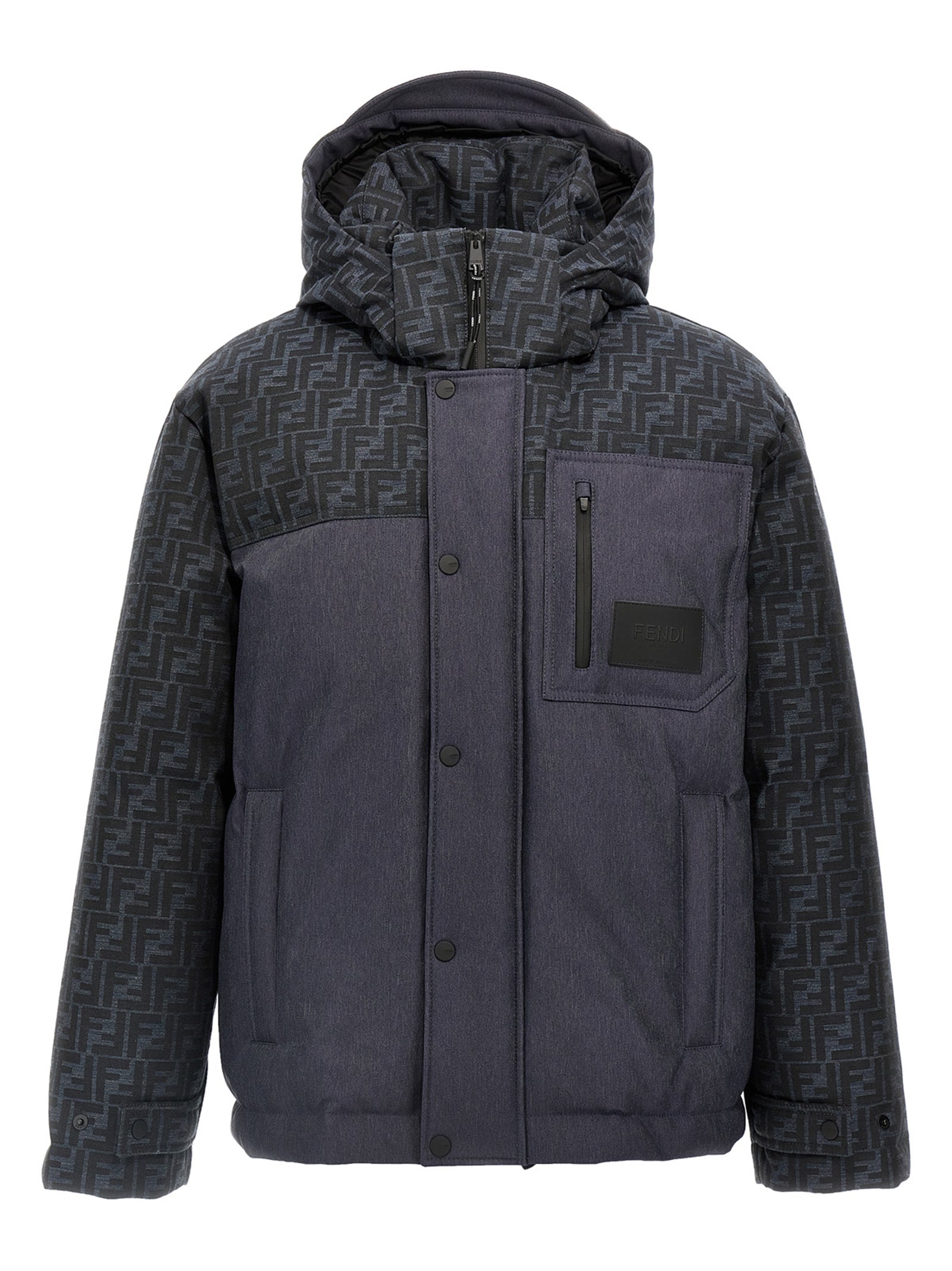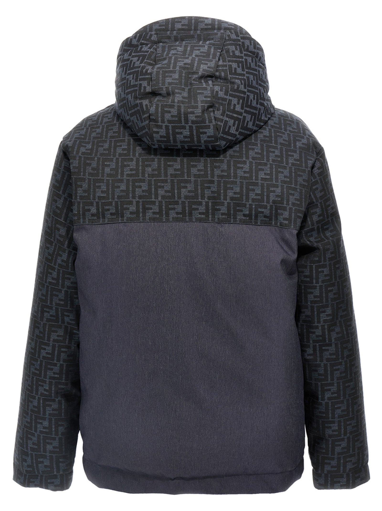 Giacca da sci in tessuto tecnico idrico idrico Colore solido con inserti jacquard monogramma FF tono su tono, patch di logo in gomma sulla tasca, collo alto, cofano regolabile e rimovibile, chiusura a bottone con zip e snap, gancelle antivento interne rimovibili, tasche, tasche lunghe maniche con ghette antivento, coulline sull'orlo.