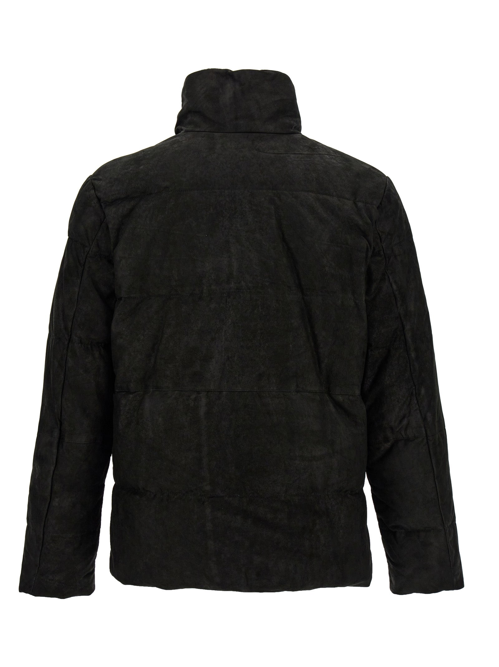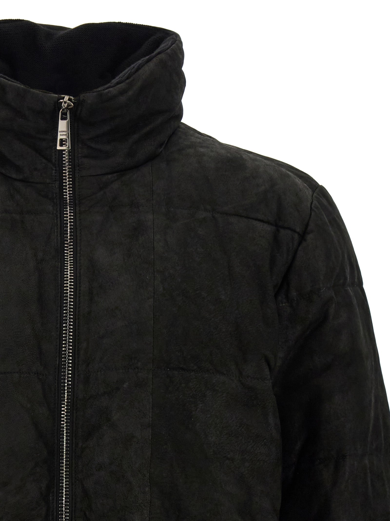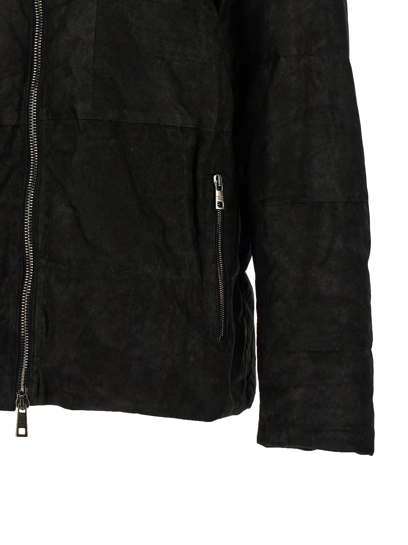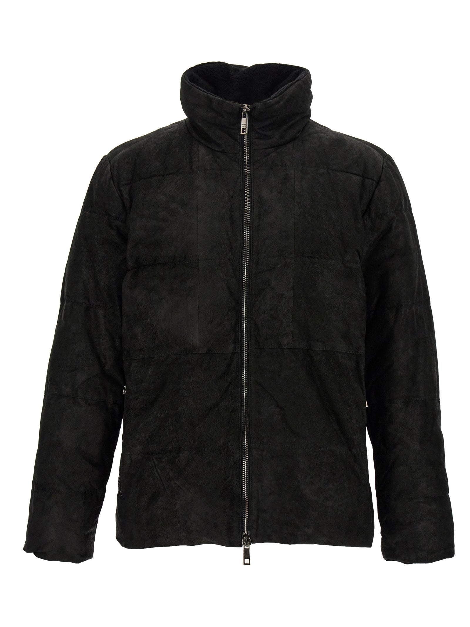 Giacca in pelle giù, interni rivestiti in nylon e imbottiti, collo alto con inserto a maglia, chiusura a zip, tasche, maniche lunghe.
