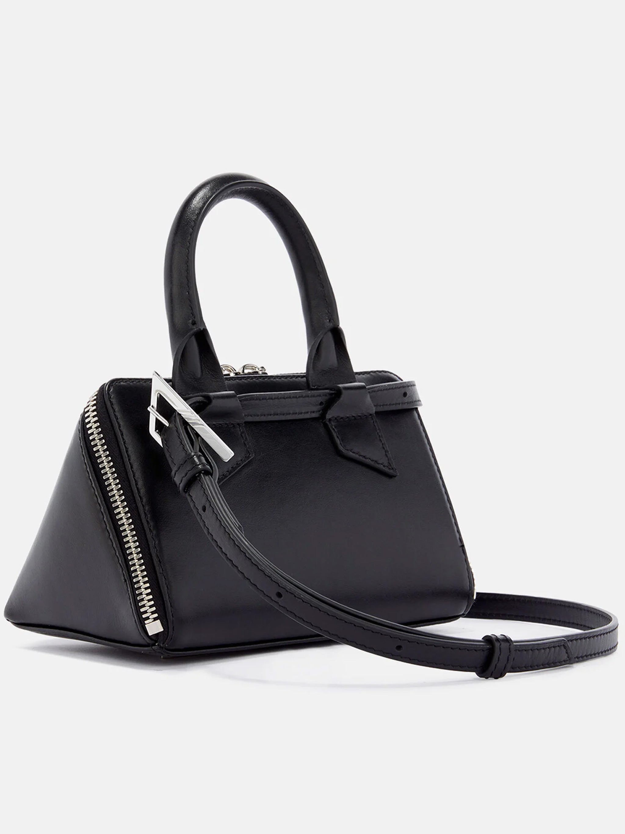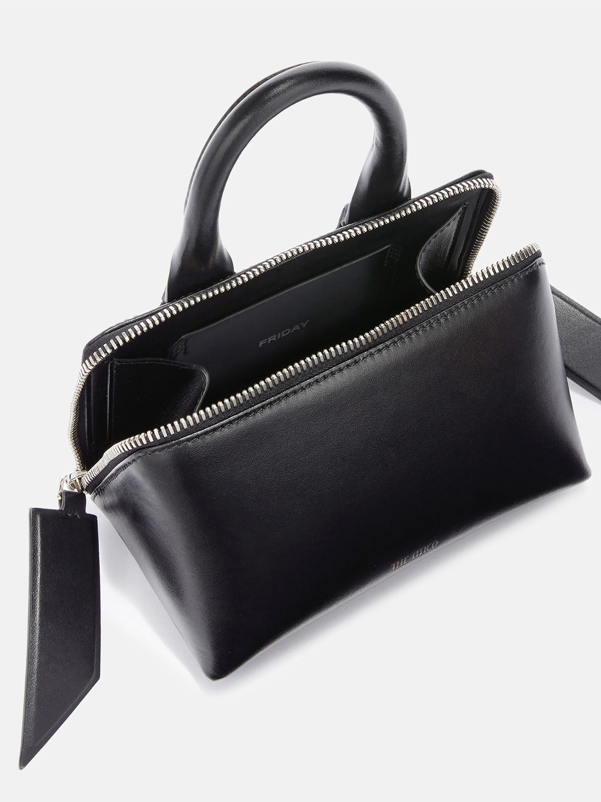 Mini borsa "Venerdì" in pelle di vitello nero con manico superiore e cinghia rimovibile, convertibile in una cintura. Elegante e versatile, ideale per un look contemporaneo. Realizzato in Italia.