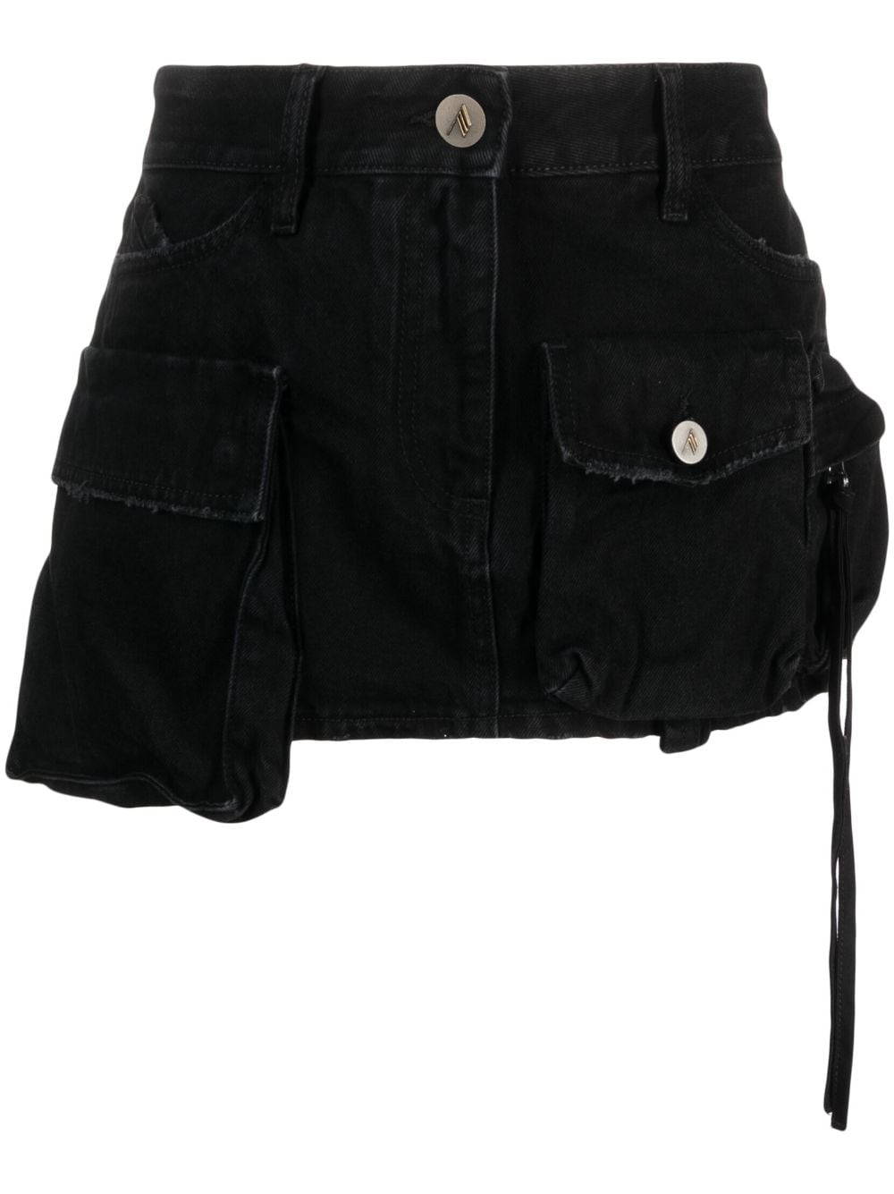 Cotton nero denim nascosto mosca e bottone fissata due maniglie arrotondate ai lati a più tasche di carico a due tasche posteriori tasche di dritta lungo la coscia