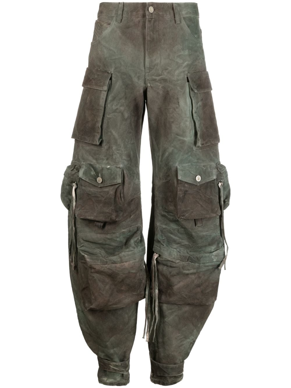 jeans da carico mimetico dall'attico con verde, cotone, denim, stampa mimetica, gamba affusolata, bottone anteriore e chiusura con zip e tasche cargo multipli.