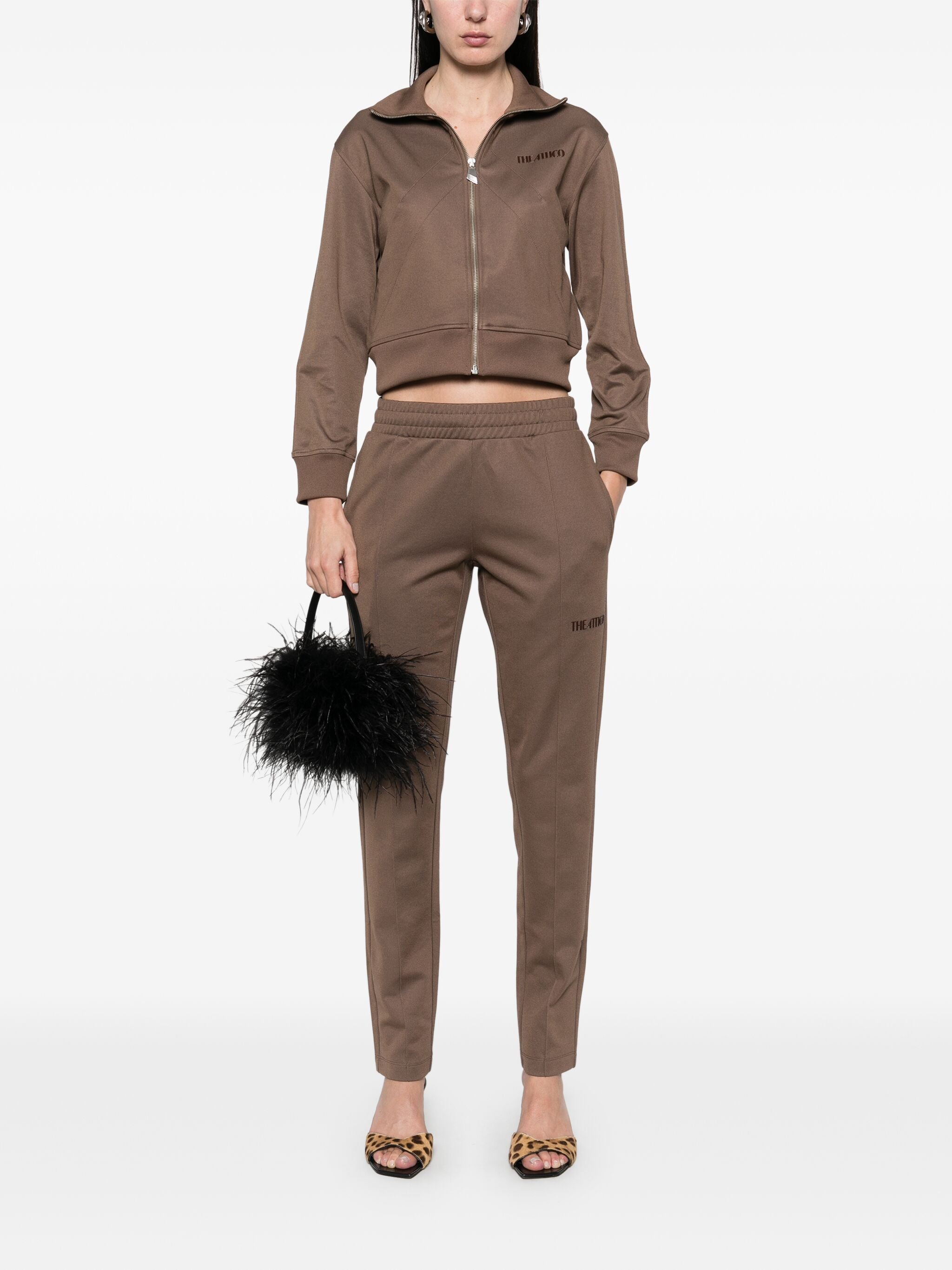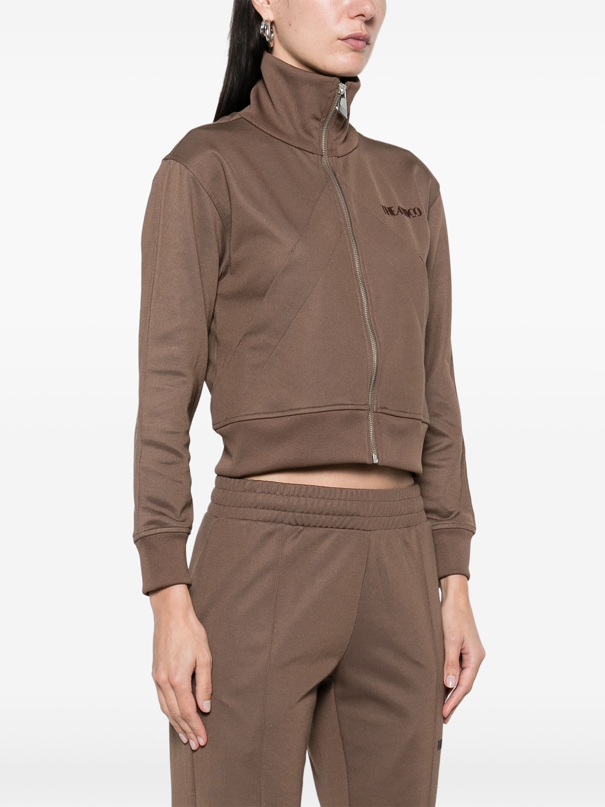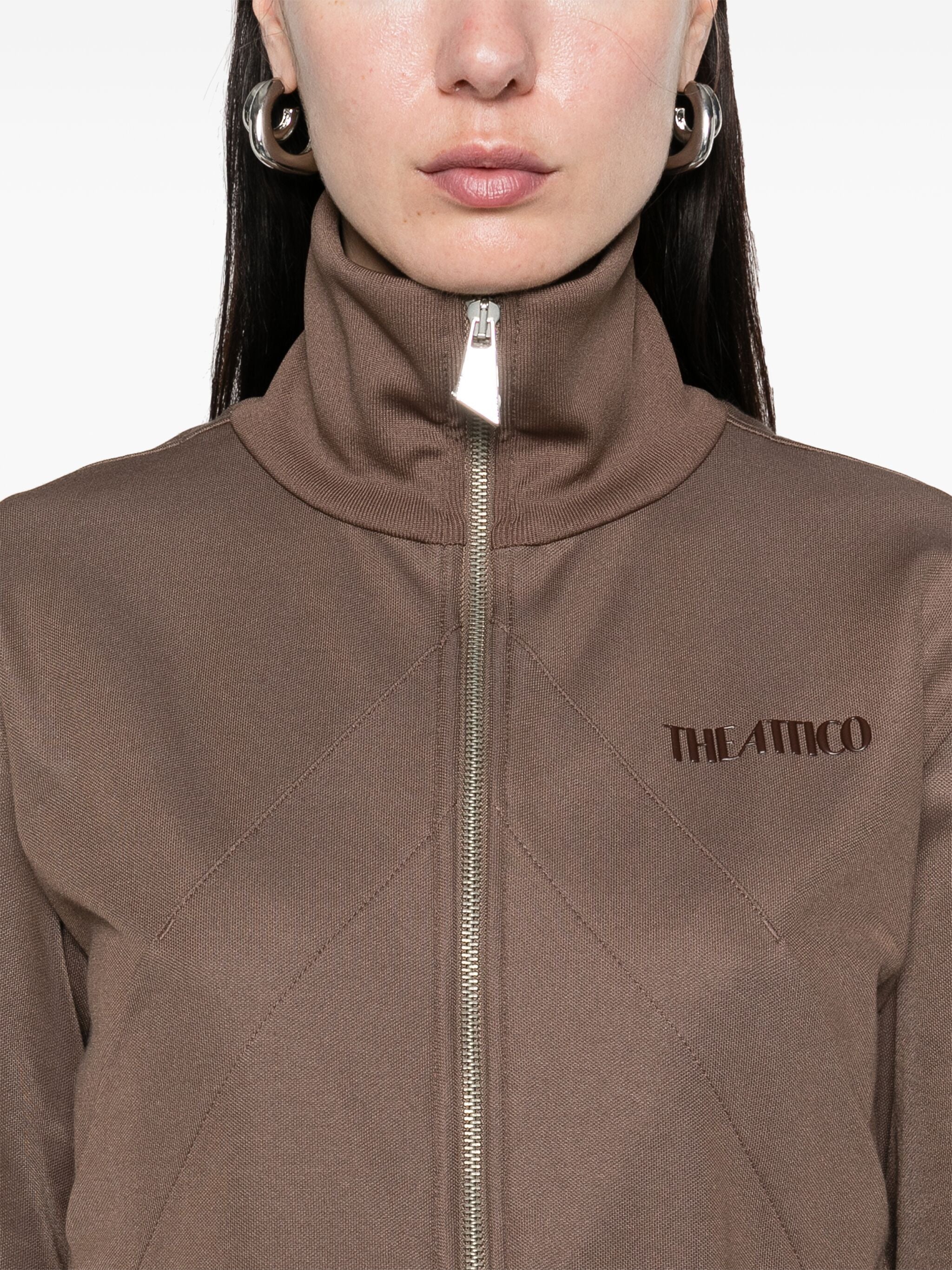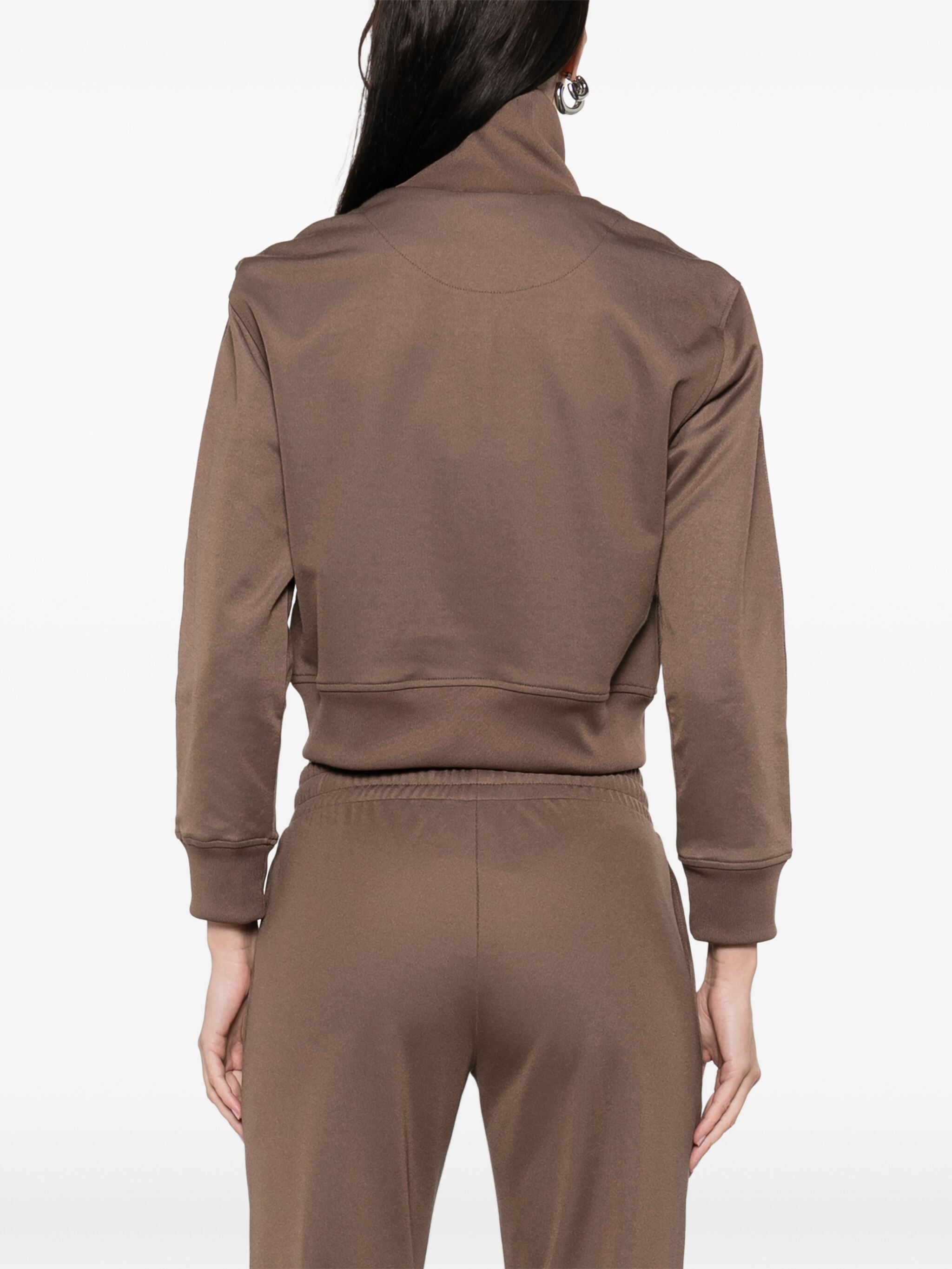 Giacca in jersey di viscosa acetato marrone con zip frontale, un capo versatile e sofisticato. Realizzata in Italia, combina un mix di cotone, poliestere e dettagli in viscosa elastan per un comfort unico e una vestibilità perfetta.