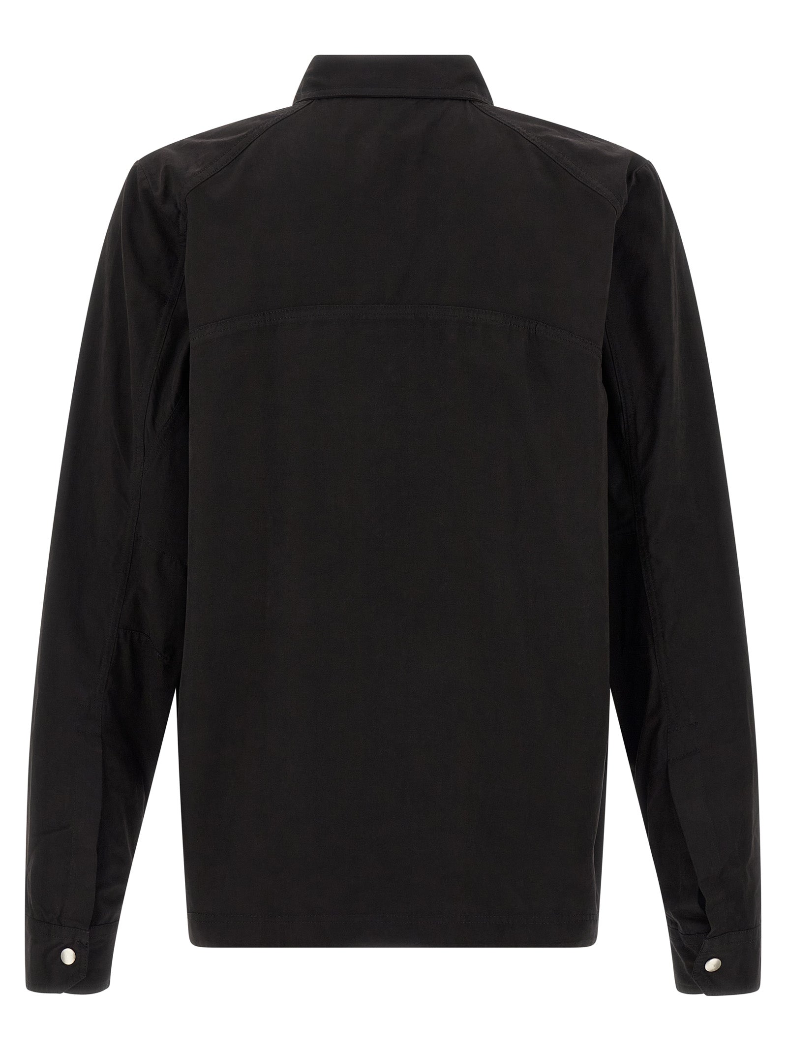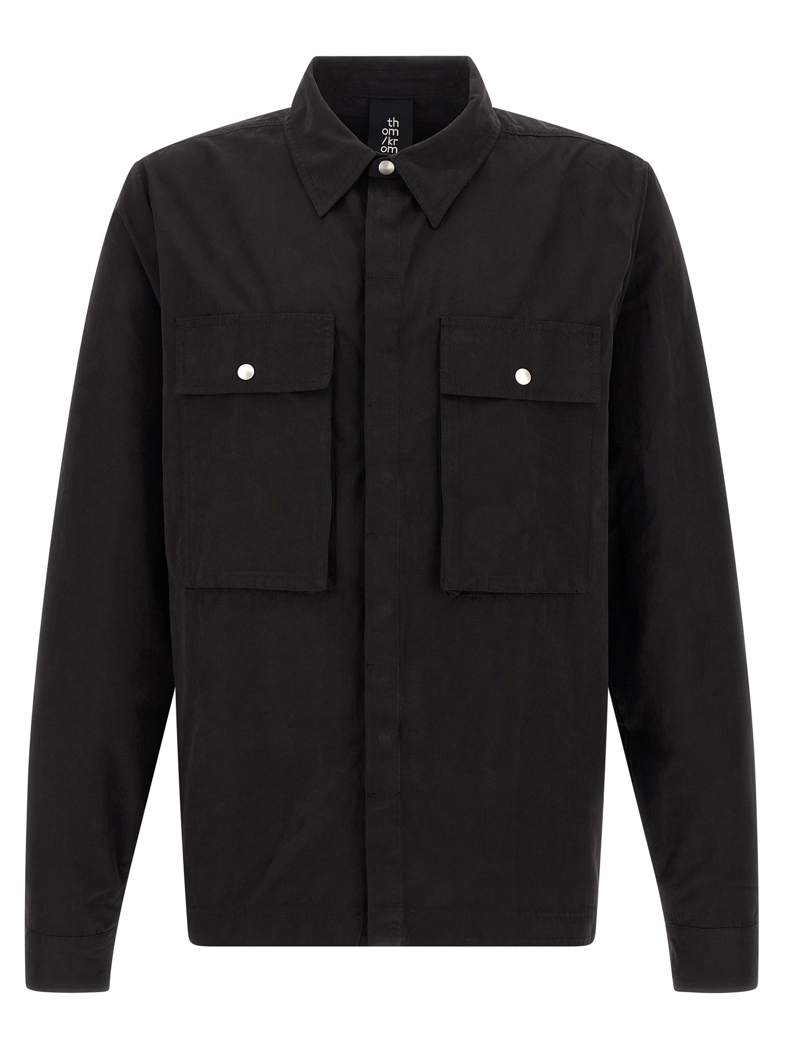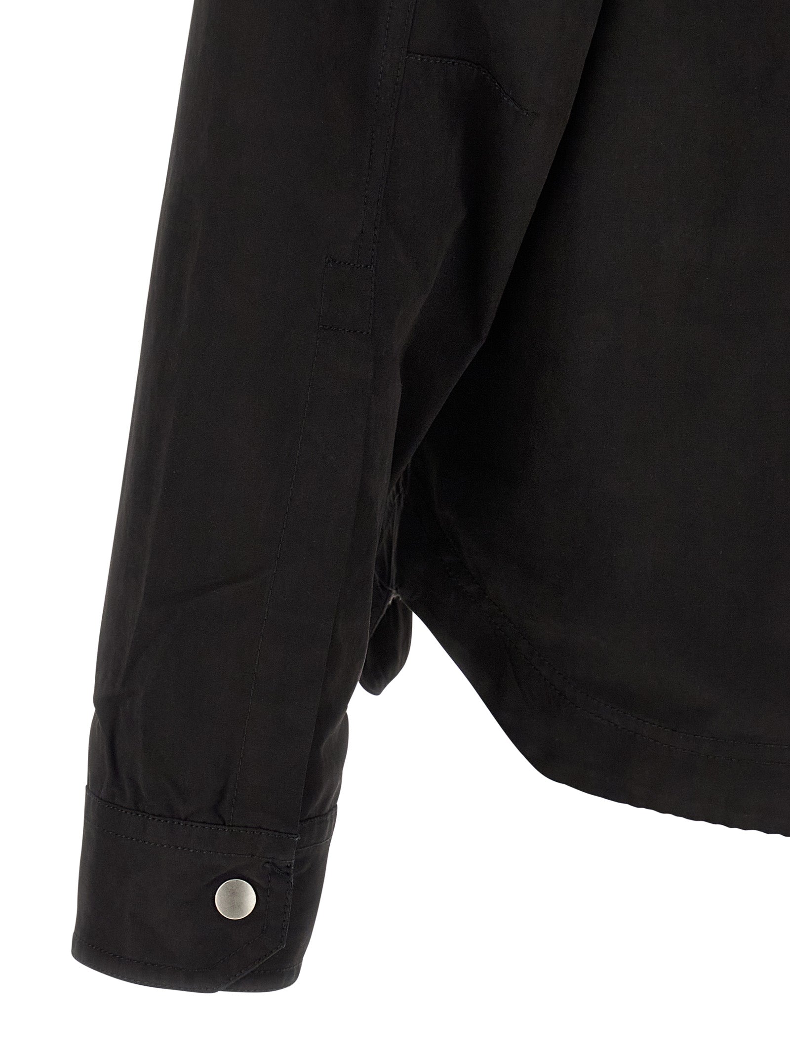 Camicia di cotone a mano pesa, chiusura a snap nascosta anteriore, tasche, maniche confuse lunghe.