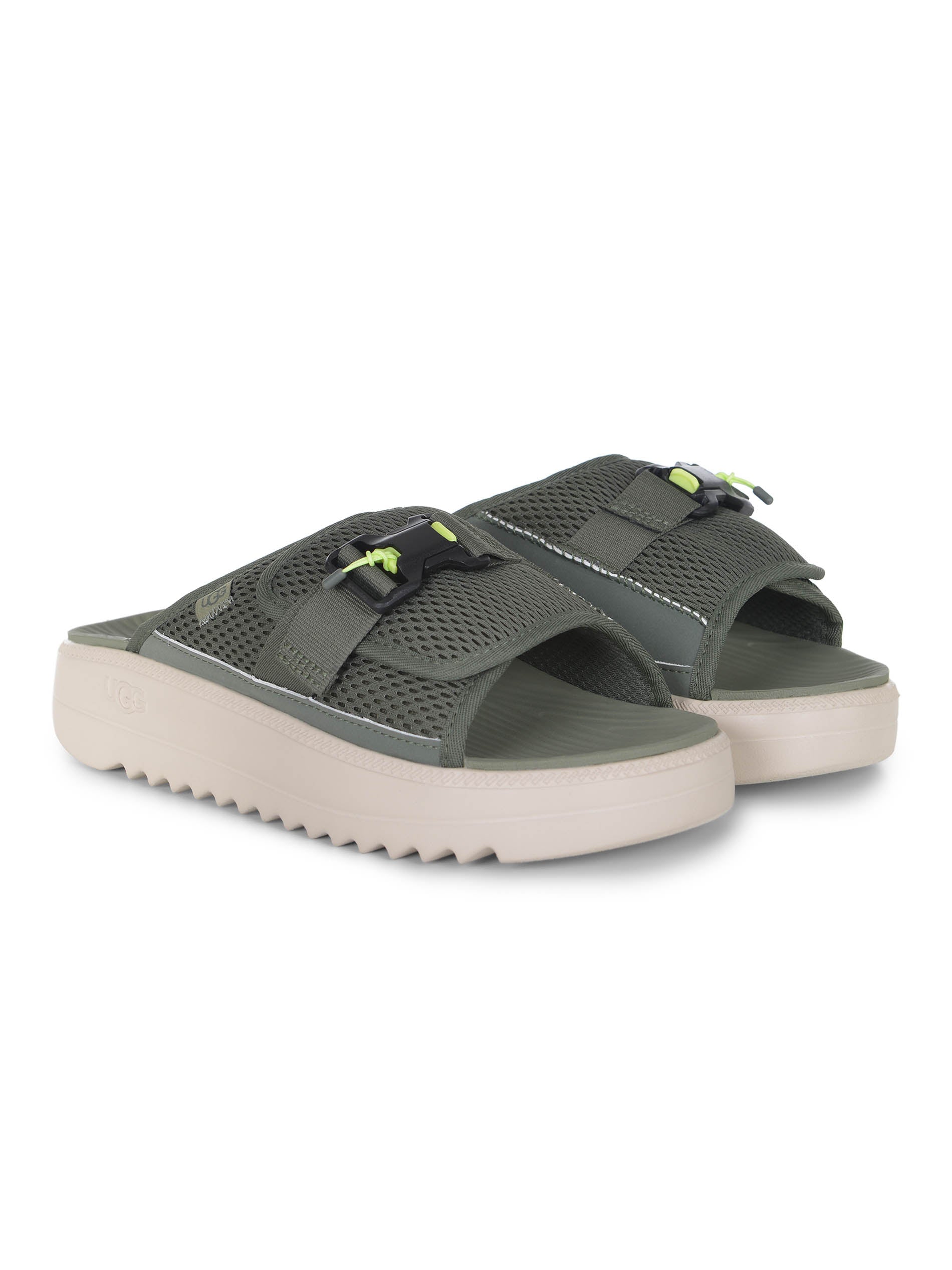 Ugg "Maxxer 2.0" pantofole realizzate in tessuto verde militare. Mesh cinghia con pulsante Snap e cinghia. Magh sintetico superiore e mesh. Rivestimento in mesh. Eva sole. Sotto di avorio contrastante. Logo "Ugg" sulla soletta in verde chiaro. Etichetta in tessuto con logo "ugg". Sole in gomma 100% tessuto al 100%