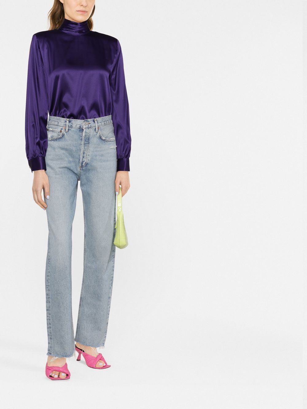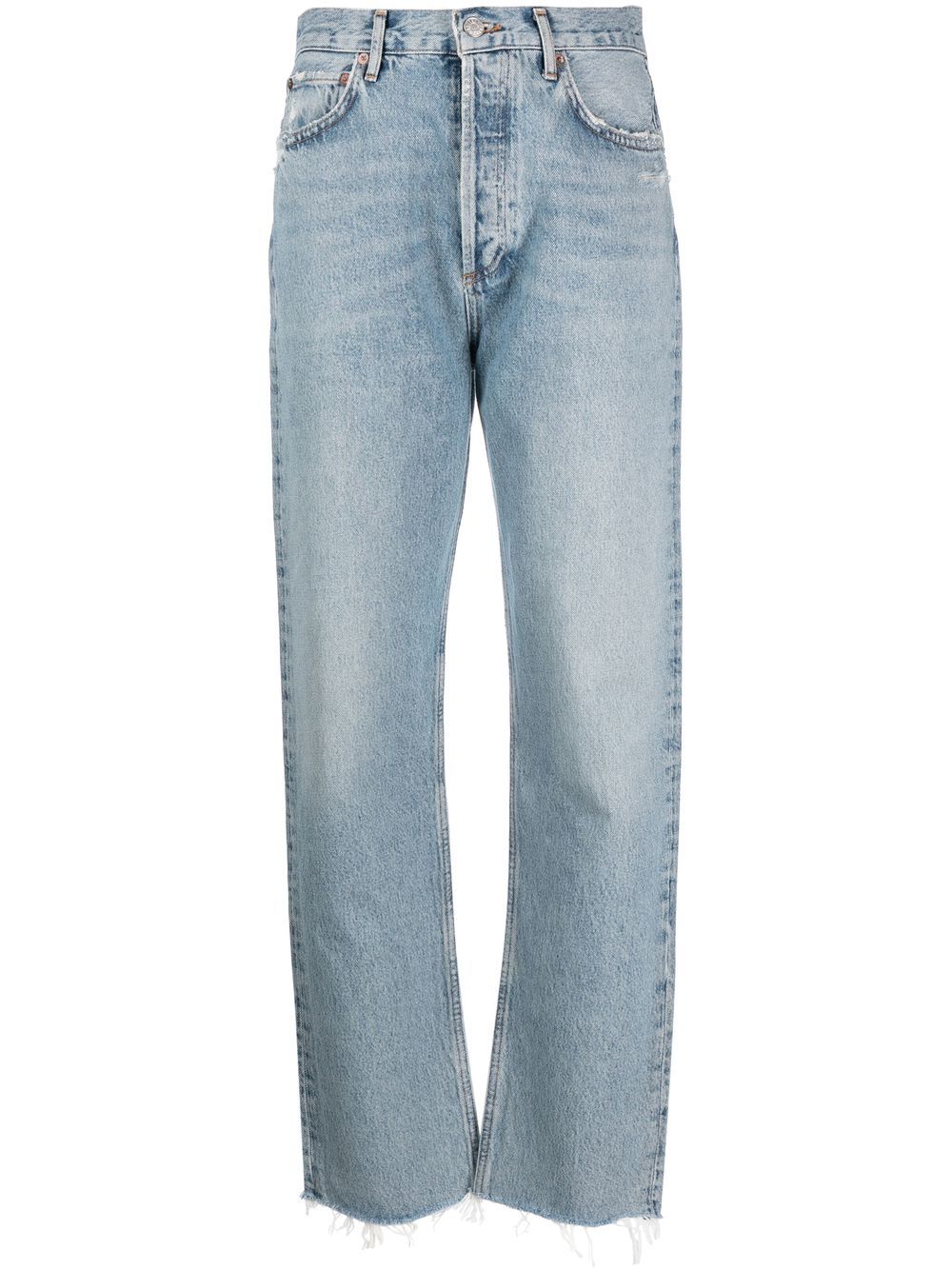 Jeans per fidanzati di Agolde con blu chiaro, cotone organico, denim lavato, effetto di frusta, anelli, bottone anteriore e chiusura della cerniera, tasche classiche a cinque e orlo sfilacciato. Consapevole: questo articolo è realizzato con almeno il 50% di materiali organici.