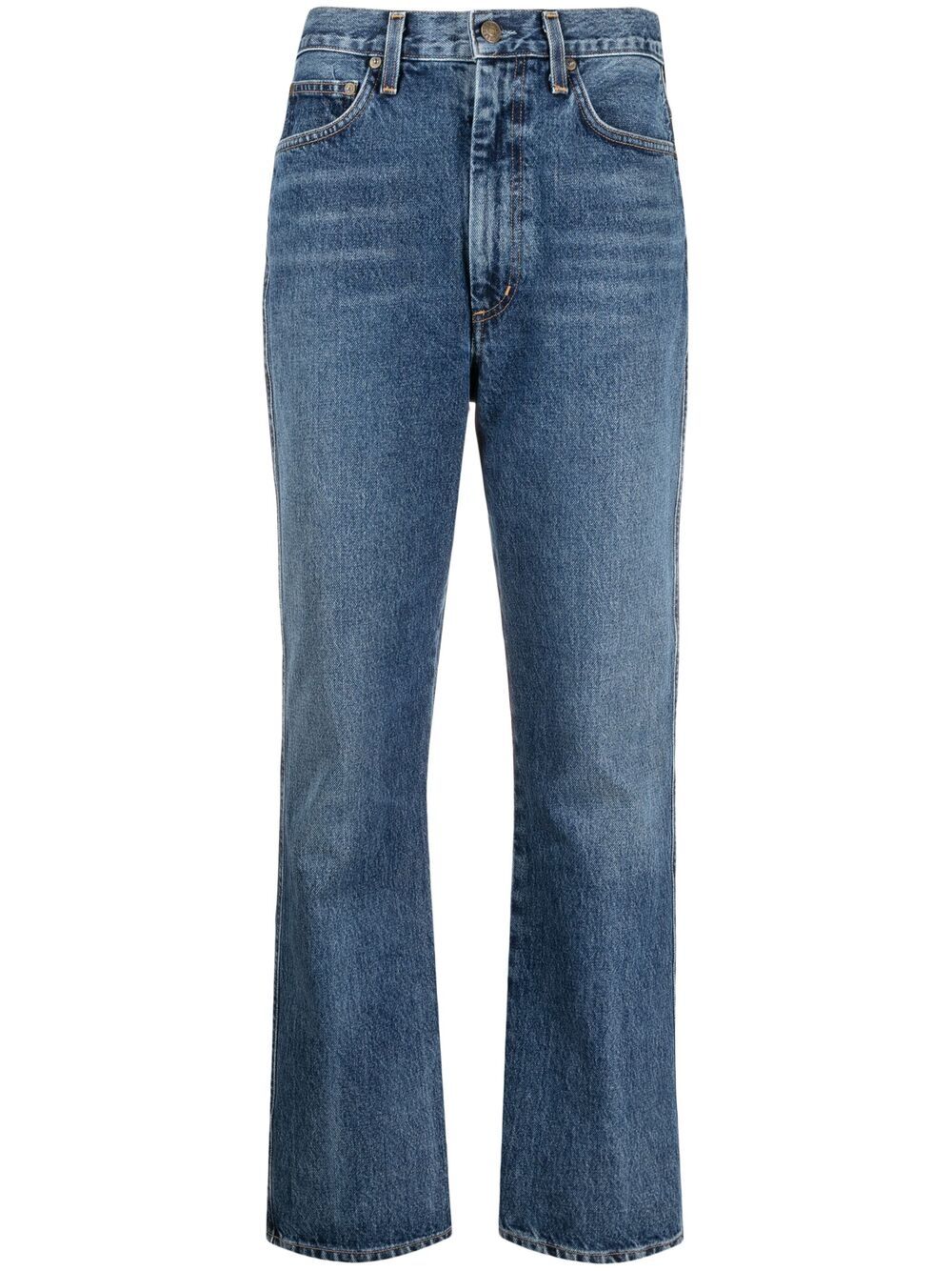 Jeans a vita alta di cotone blu placebo da Agolde con effetto sbiadito, anelli della cintura, gamba a vita alta, dritta, fissaggio sul pulsante frontale e cinque tasche classiche.