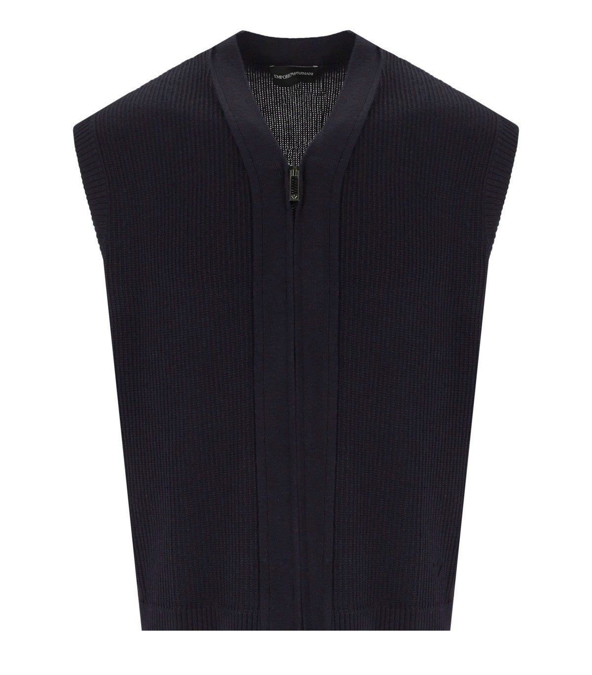 Emporio Armani Cardigan Made di miscela di lana vergine blu. Logo ricamato tonale sul fondo, bordi a coste e chiusura a zip. Valle a V, vestibilità regolare. Composizione: 59% di lana vergine, 41% di cotone.
