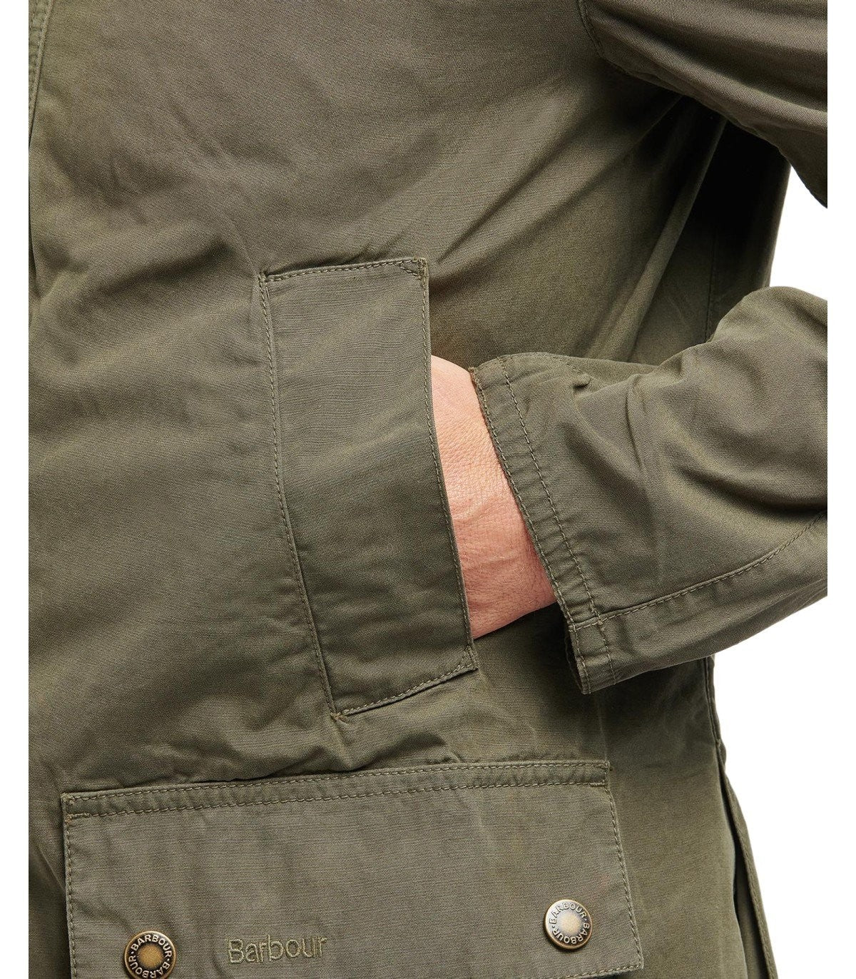 La giacca Barbour Ashby è realizzata in cotone verde tinto di indumento. È dotato di tasche anteriori, scaldamuscoli con alette, logo ricamato a tono e colletto a coste. Presenta anche prese d'aria posteriori, chiusura a zip e pulsanti e una vestibilità su misura. Composizione: cotone 100%.
