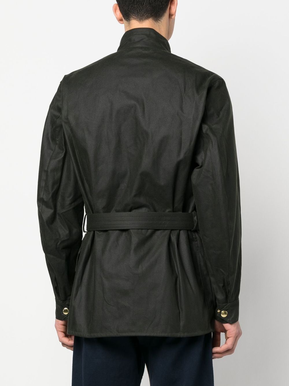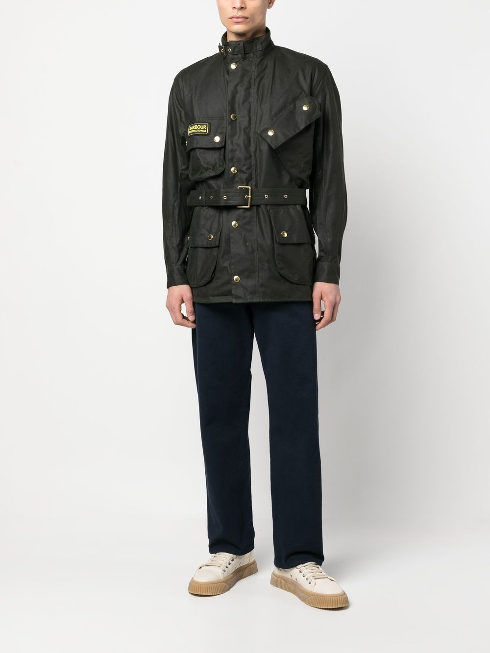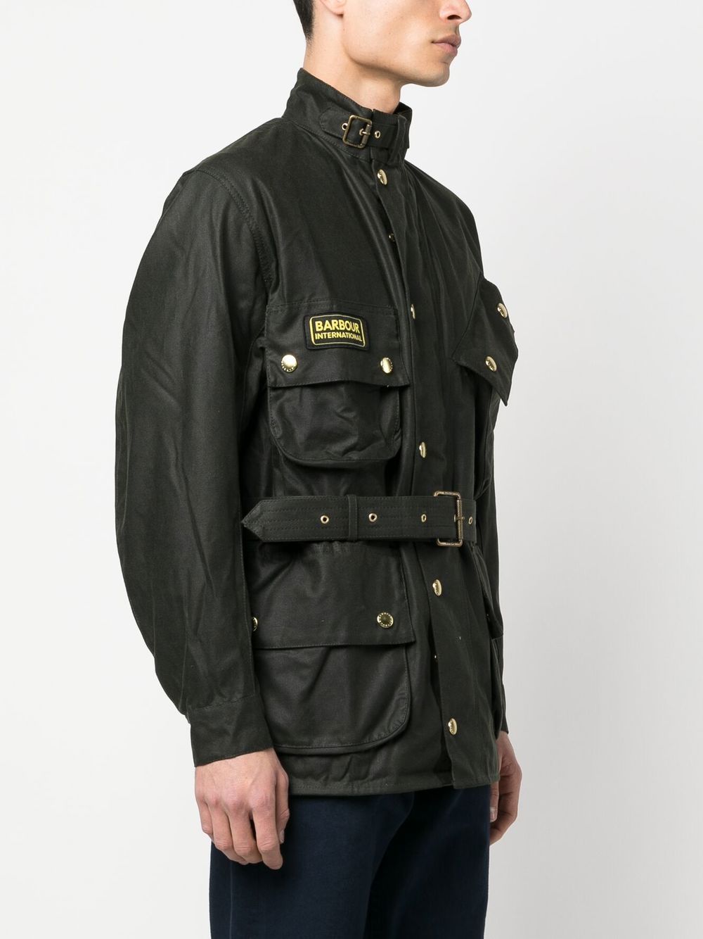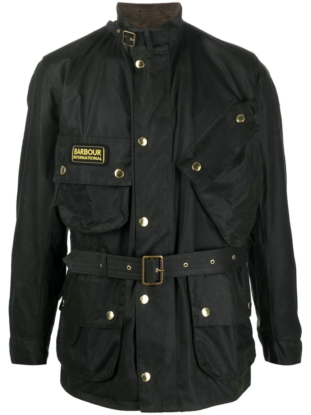 Giacca di cotone militare di Barbour International con verde scuro, miscela di cotone, patch di logo sulla parte anteriore, collo alto, fissaggio sul pulsante anteriore, vita con cintura, quattro tasche a lembo anteriore, maniche lunghe e polsini abbottonati.