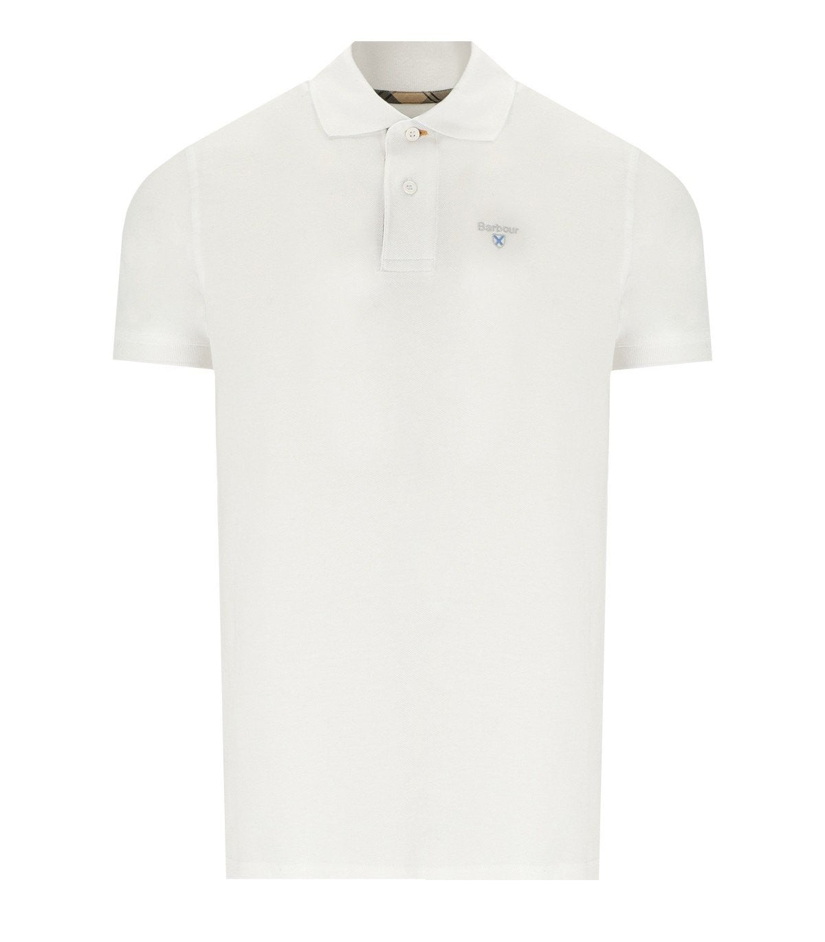 Polo Barbour Made di cotone pique bianco, con inserti nel motivo tartan beige e logo ricamato sul petto. Chiusura dei pulsanti sulle fessure anteriori e laterali. Adattamento regolare. Composizione: cotone 100%.