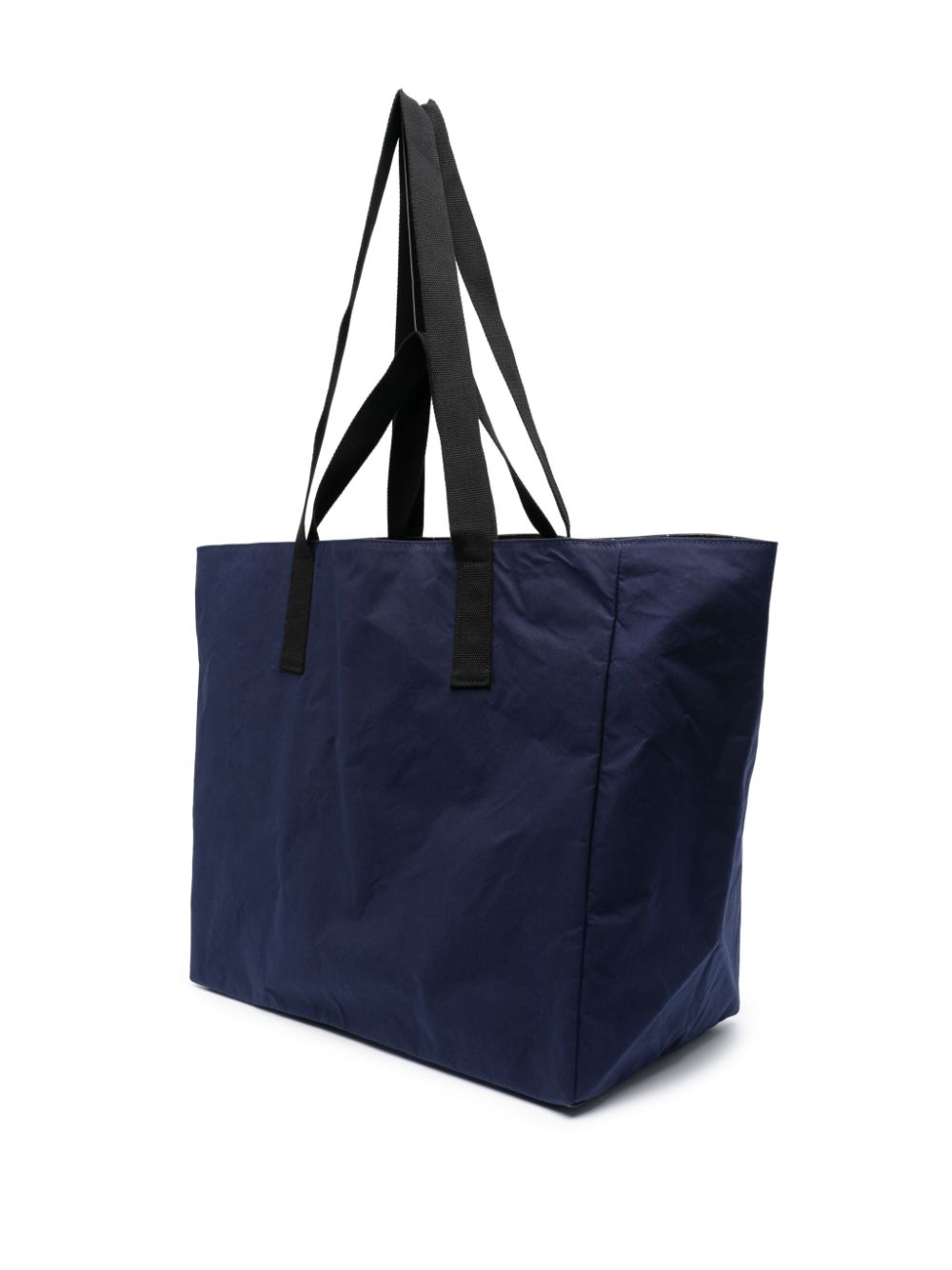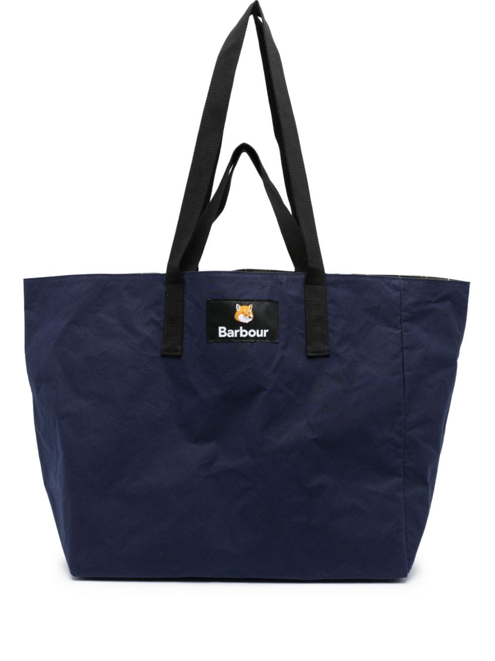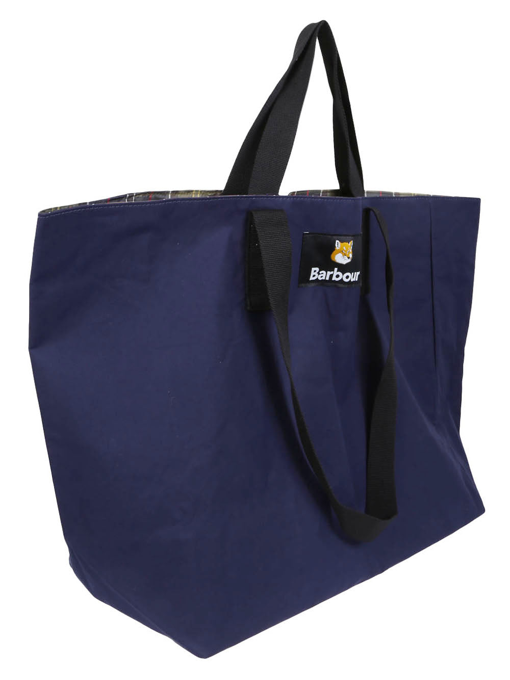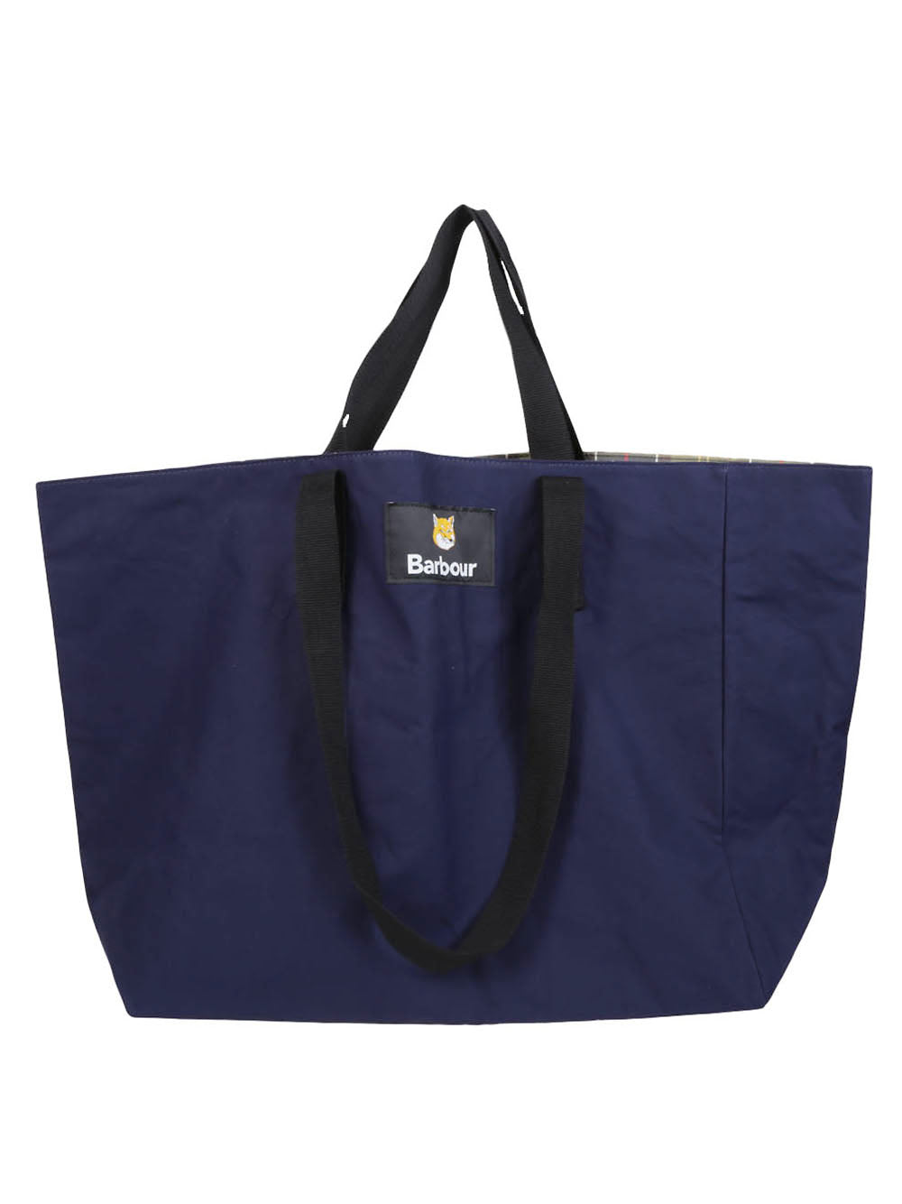 X Maison Kitsuné Logo Patch Cotton Tote Bag di Barbour con blu blu scuro, cotone, patch logo sul davanti, due maniglie top lunghe, due maniglie superiori, top aperto, scomparto principale e tasca interna a fusting zip.