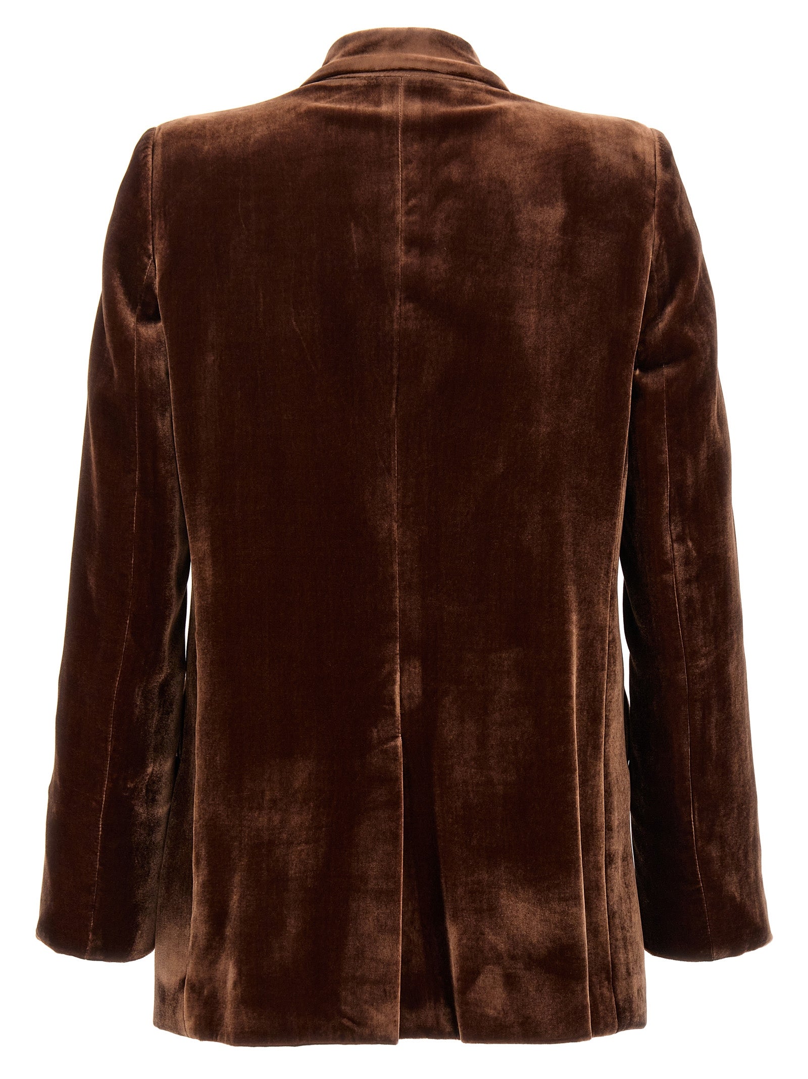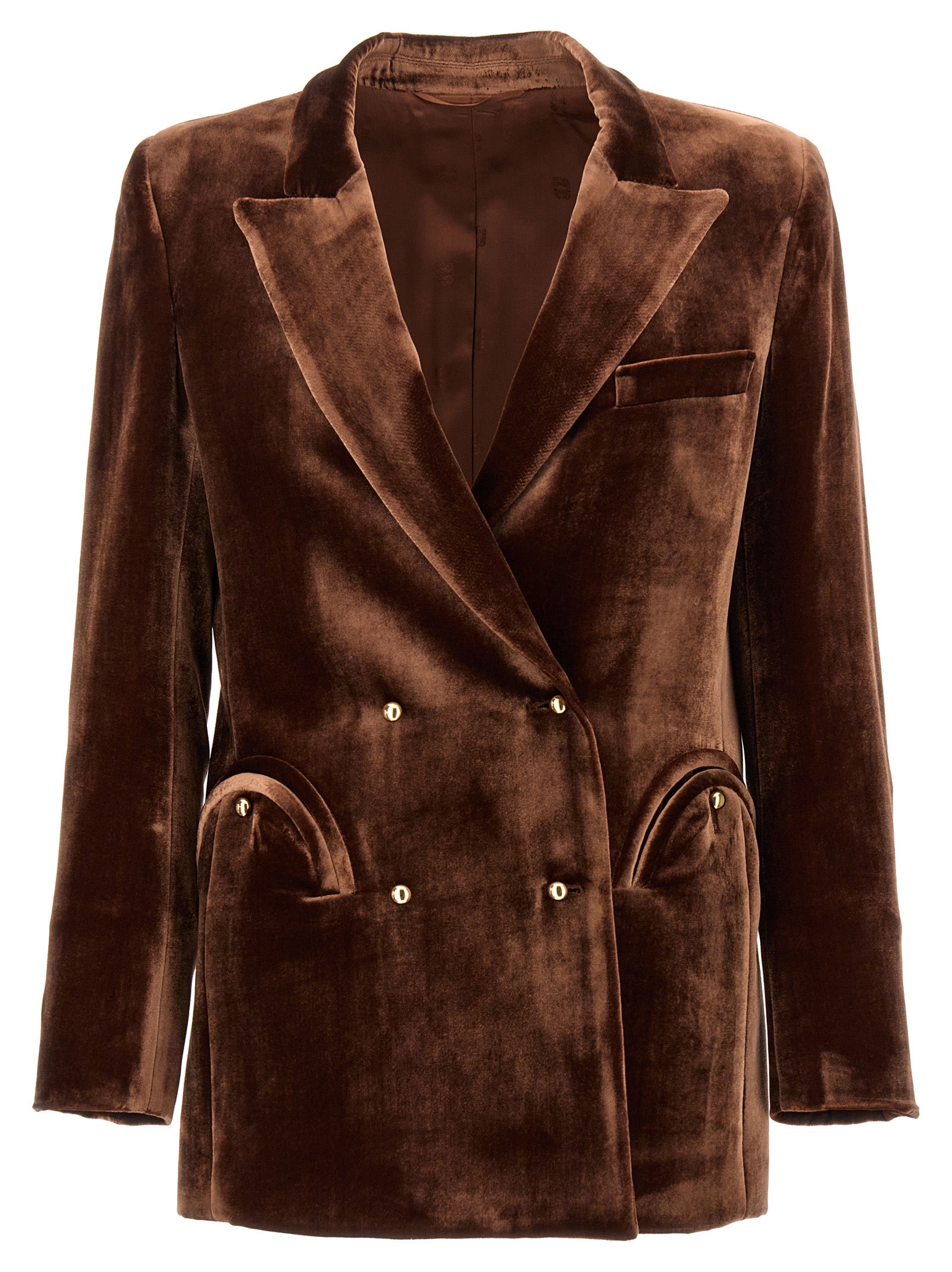 Blazer di velluto a doppio petto di "AfterGlow" con chiusura a bottone, tasche, spalline strutturate, maniche lunghe, sfiato posteriore.